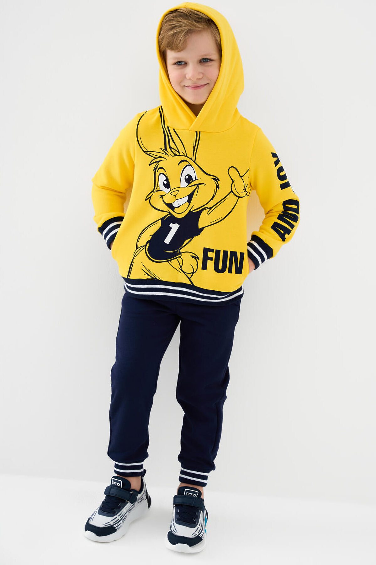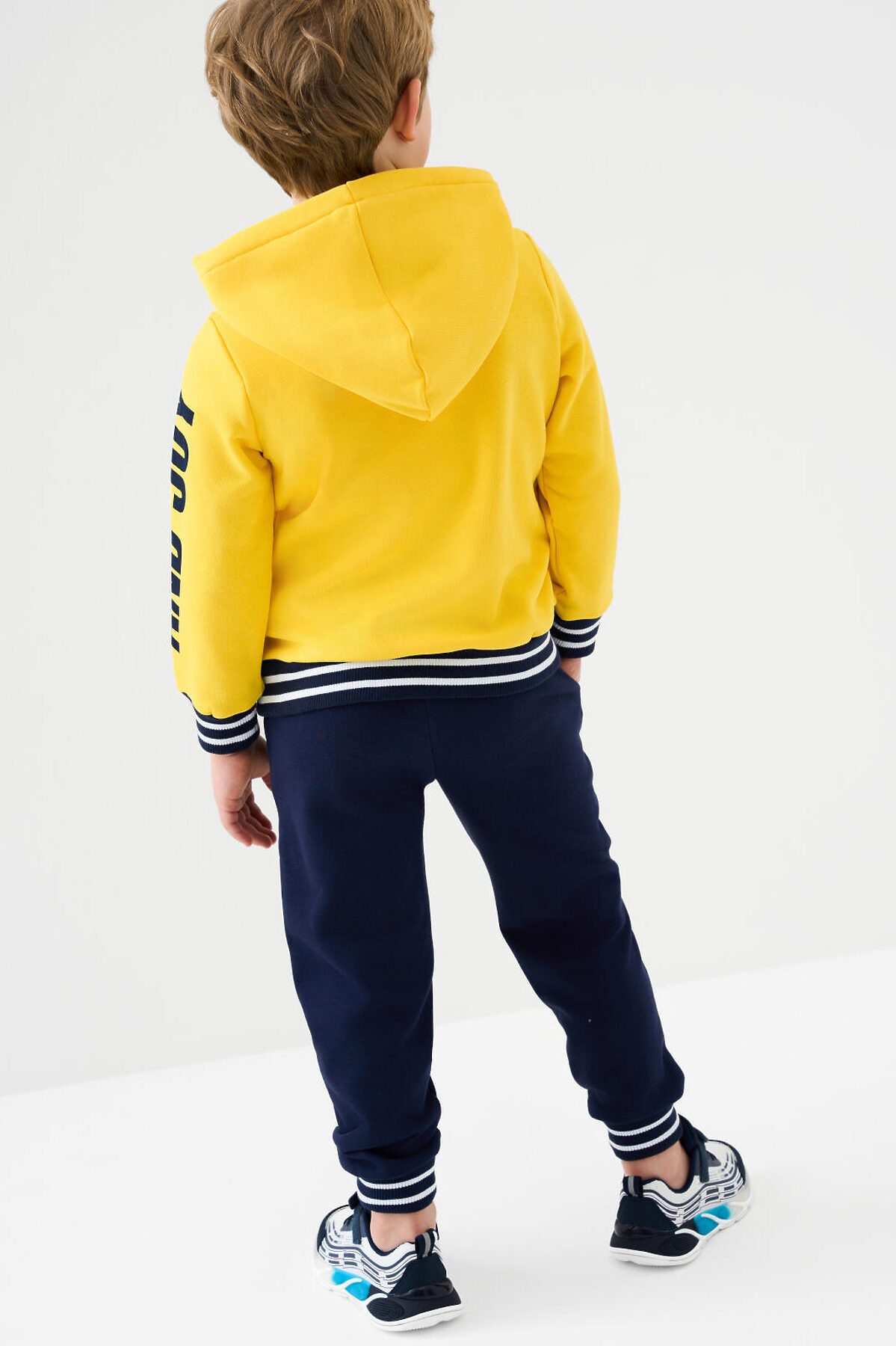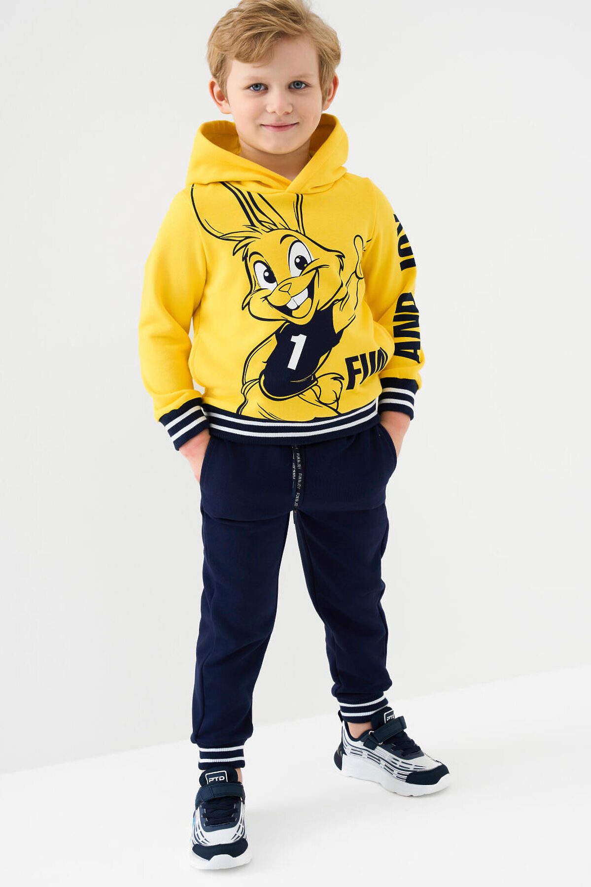 Трикотажные детские брюки джоггеры для мальчика. Модель выполнена из футера без начеса. Пояс на широкой резинке дополнен декоративным шнурком с надписью "FIND & JOY". По бокам расположены удобные карманы. Низ брюк оформлен эластичными манжетами с контрастными полосками. Брюки подойдут для повседневной носки и активного отдыха.