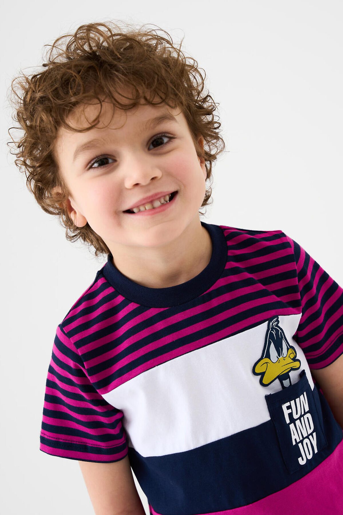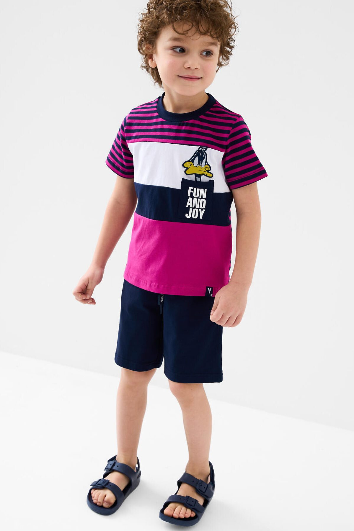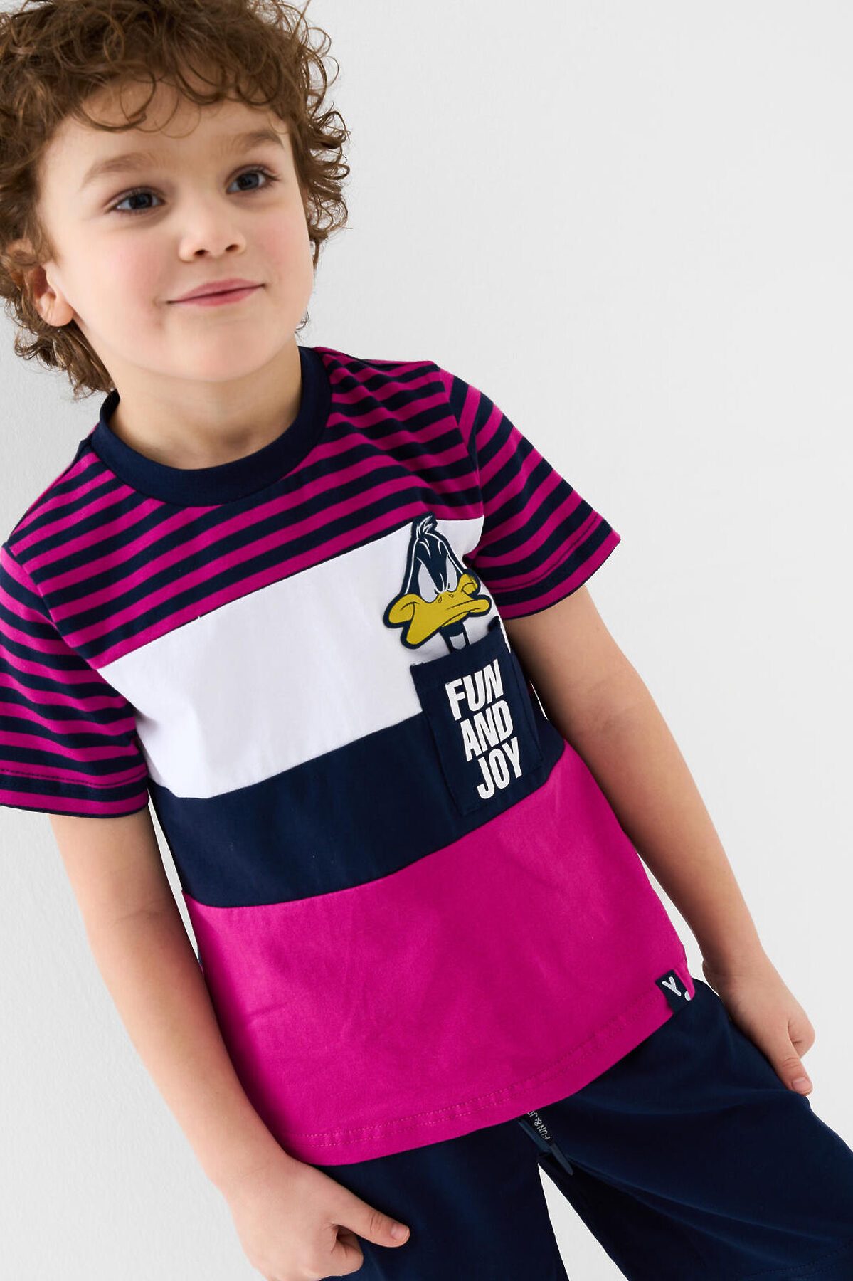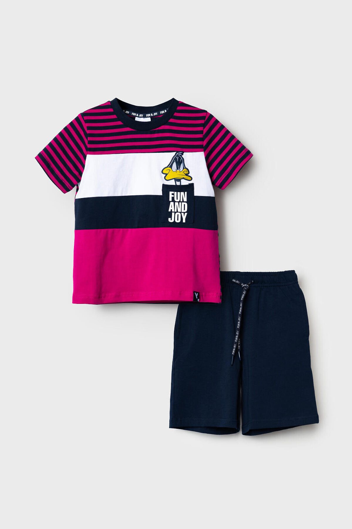 Детский костюм для мальчика. Состоит из футболки и шорт. Выполнен из хлопкового трикотажа. Футболка прямого кроя, с коротким рукавом. Яркий принт и нашивки с любимыми персонажами "Looney Tunes". Накладной карман. Шорты свободные, с эластичным поясом и шнурком для регулировки посадки. По бокам расположены карманы.