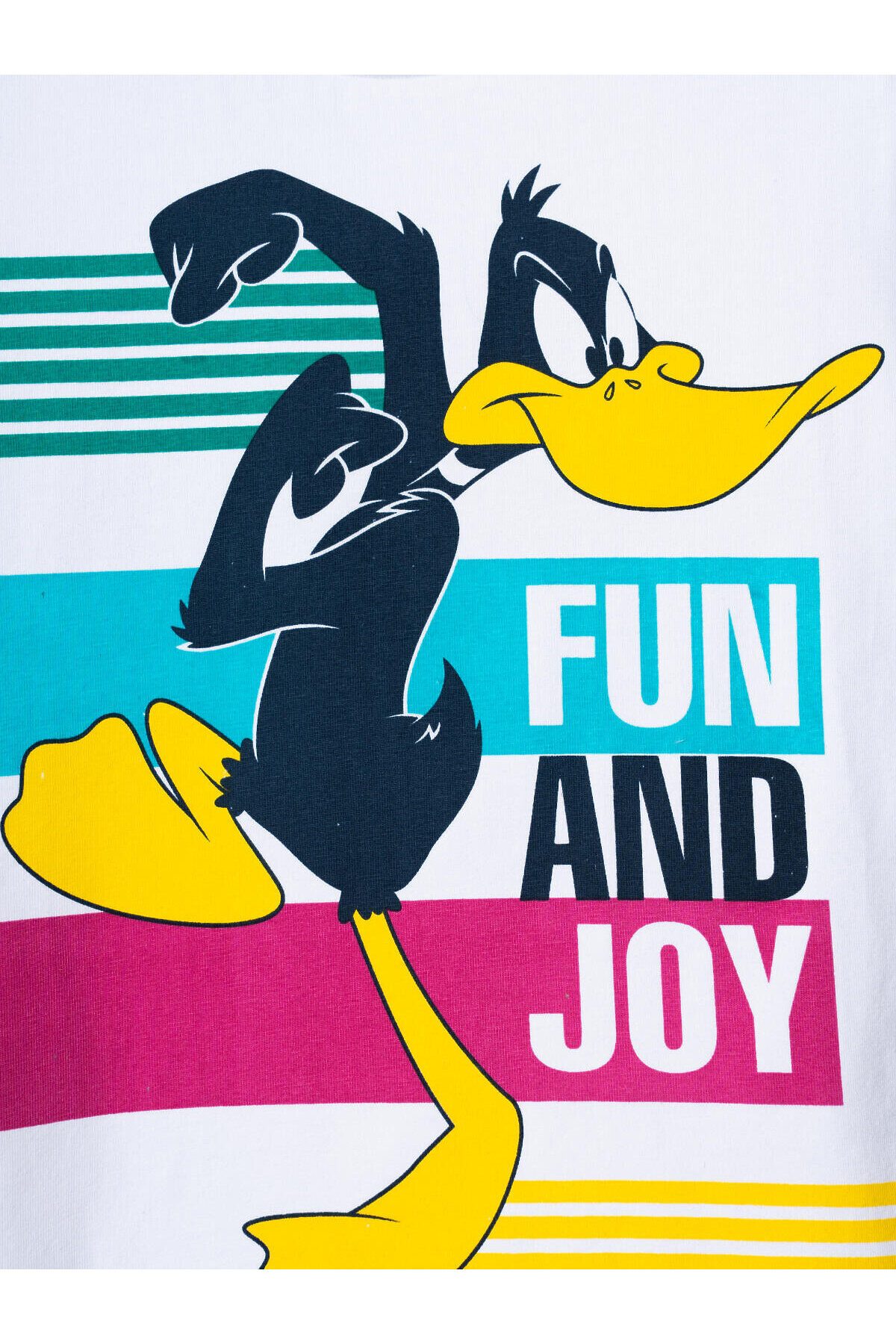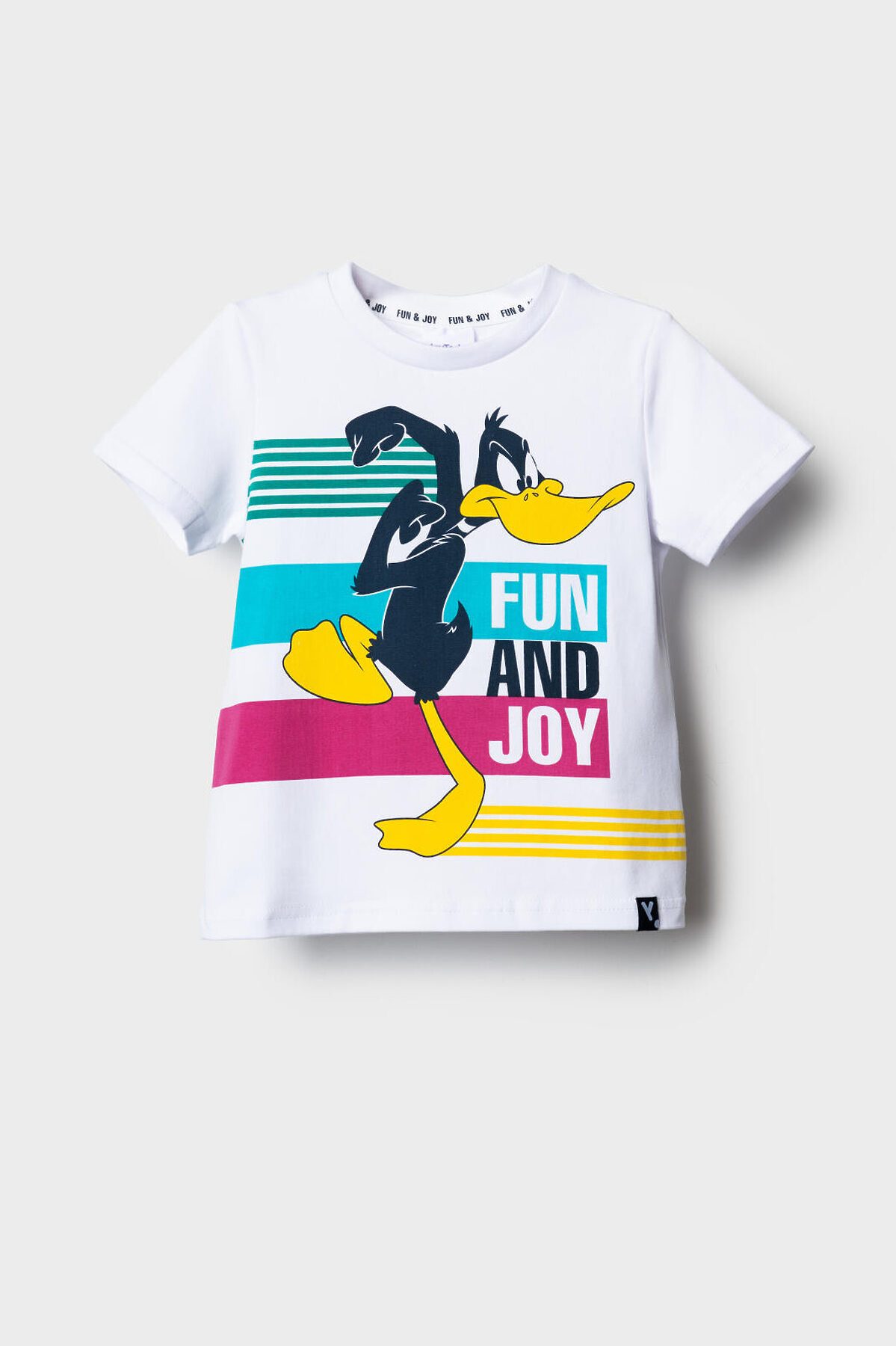 Детская футболка для мальчика. Модель прямого кроя, выполнена из эластичного хлопкового трикотажа джерси. Яркий принт с мультяшным героем "Looney Tunes" Даффи Даком. Горловина круглая, обработана эластичным рибом.
