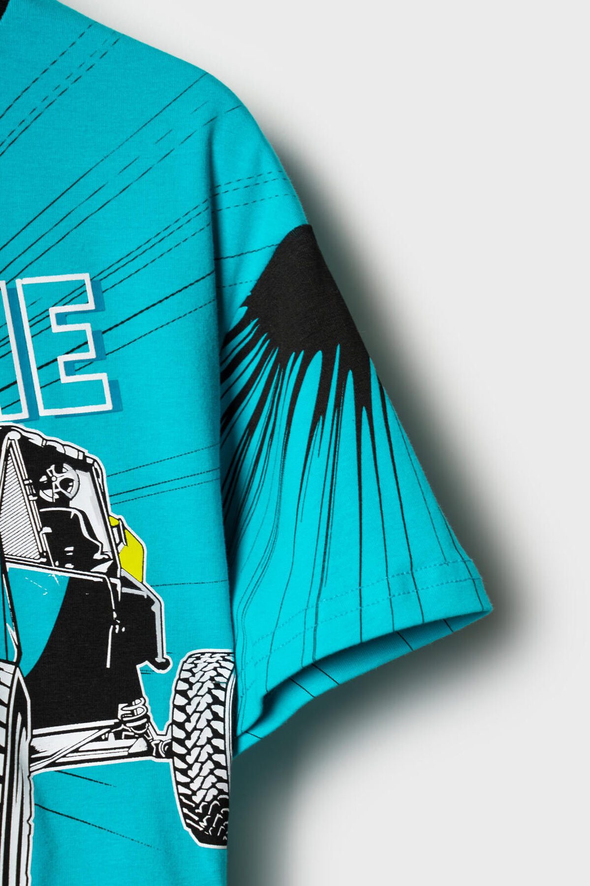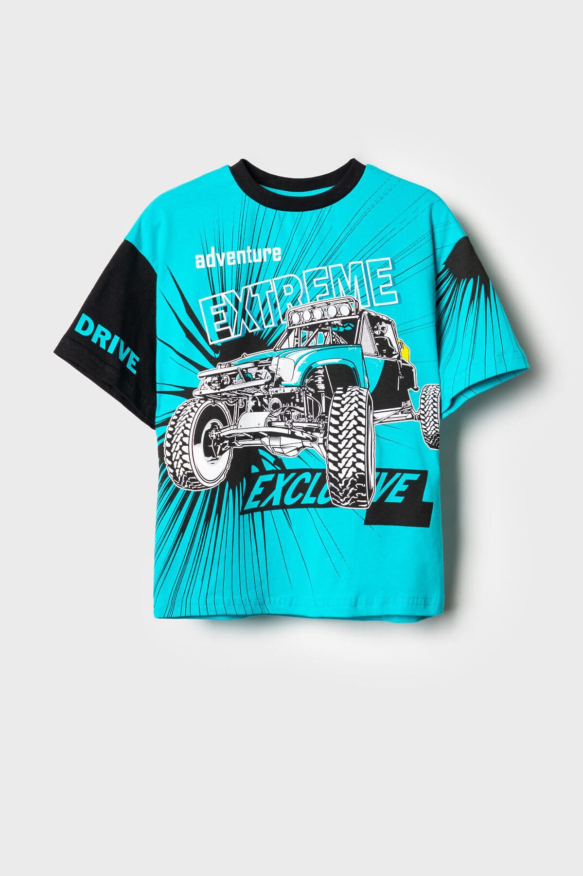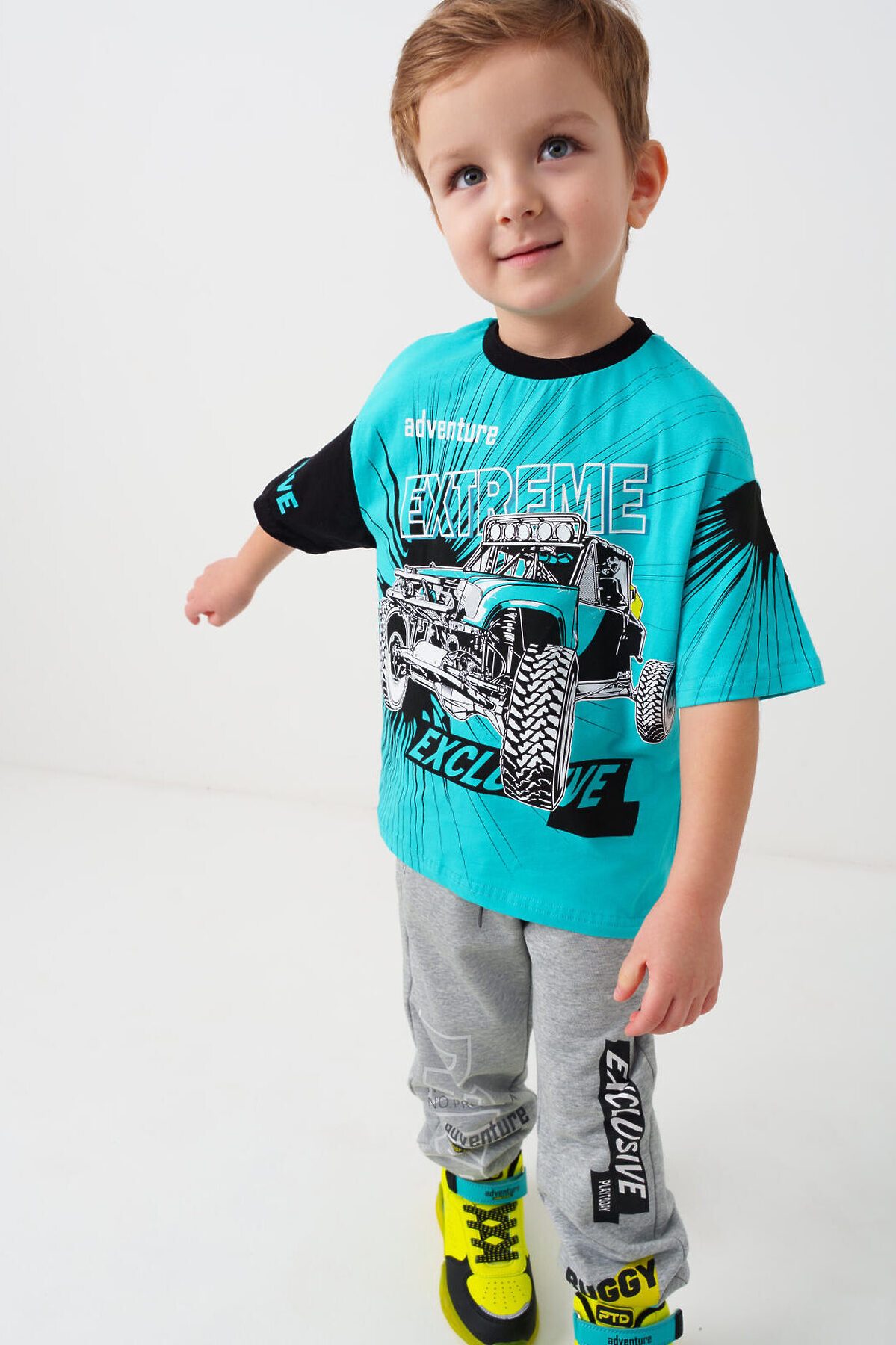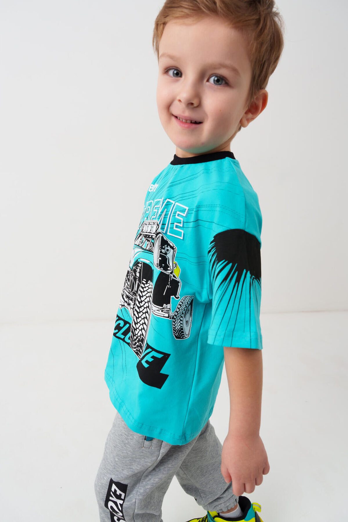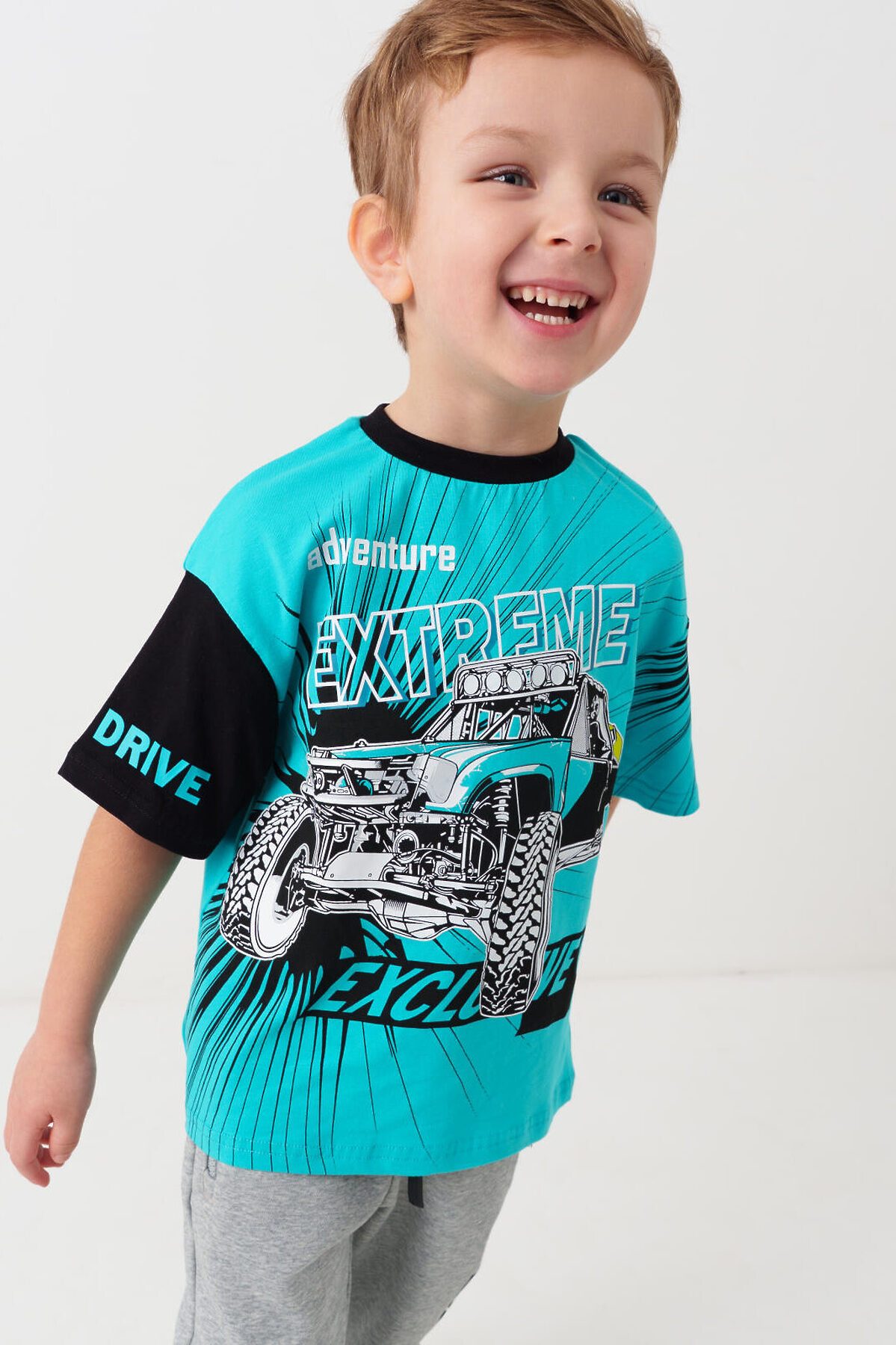 Детская футболка оверсайз для мальчика. Модель выполнена из эластичного хлопкового трикотажа джерси. Спереди расположен крупный принт в гоночной тематике. Горловина круглая, обработана эластичным рибом.
