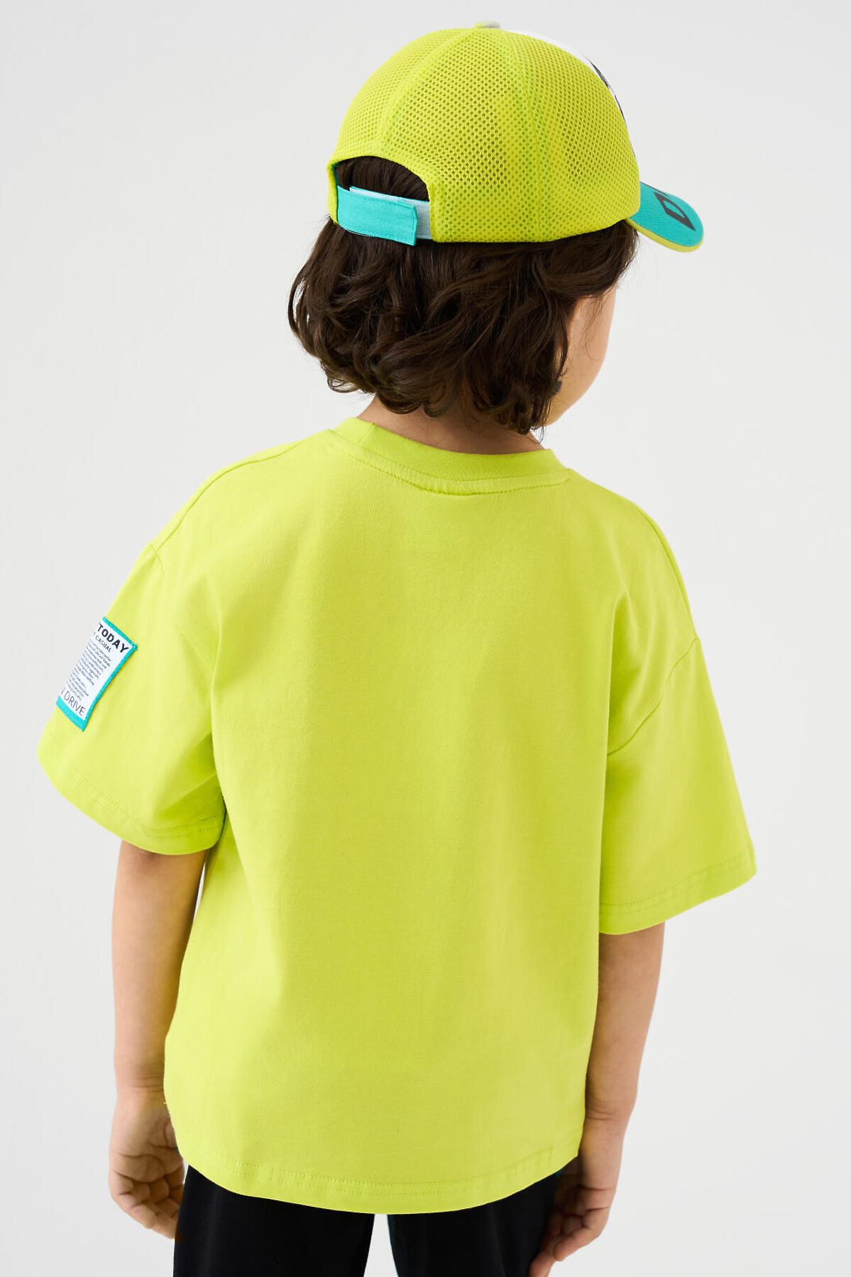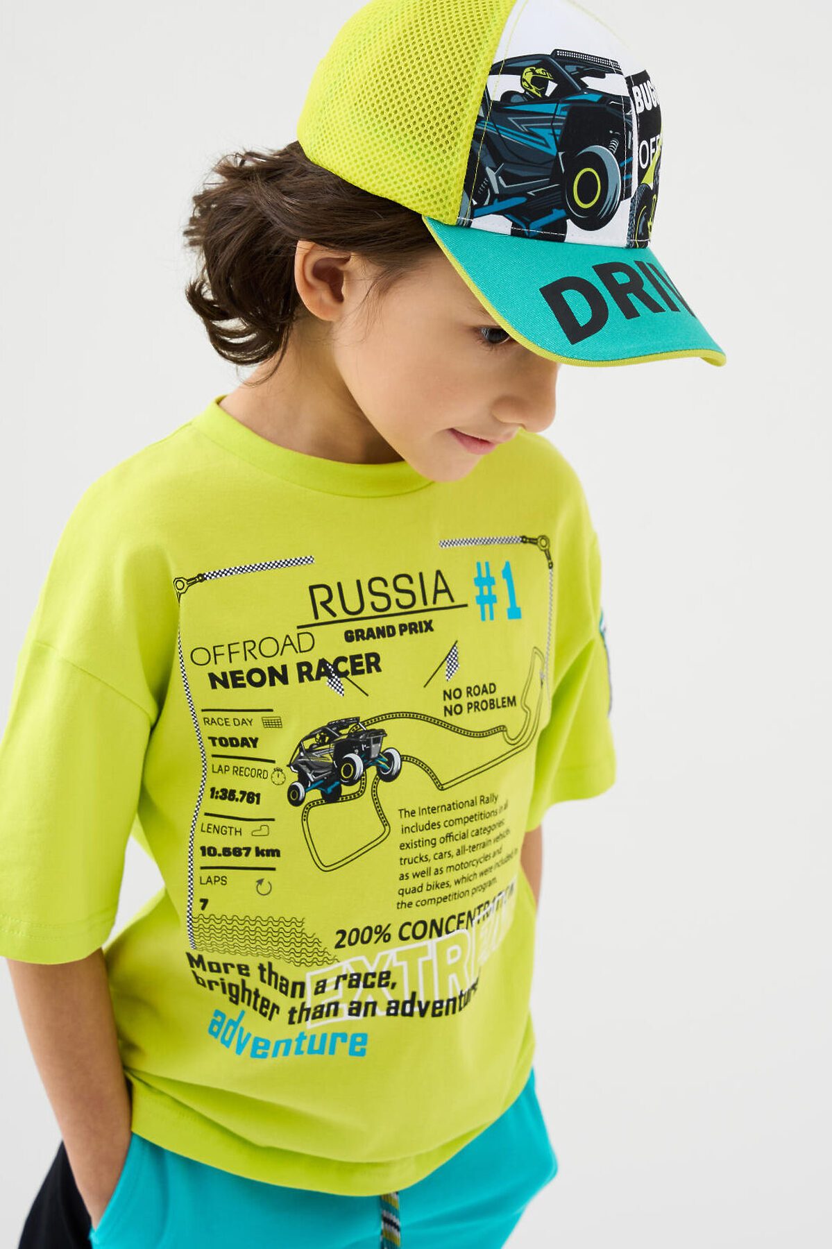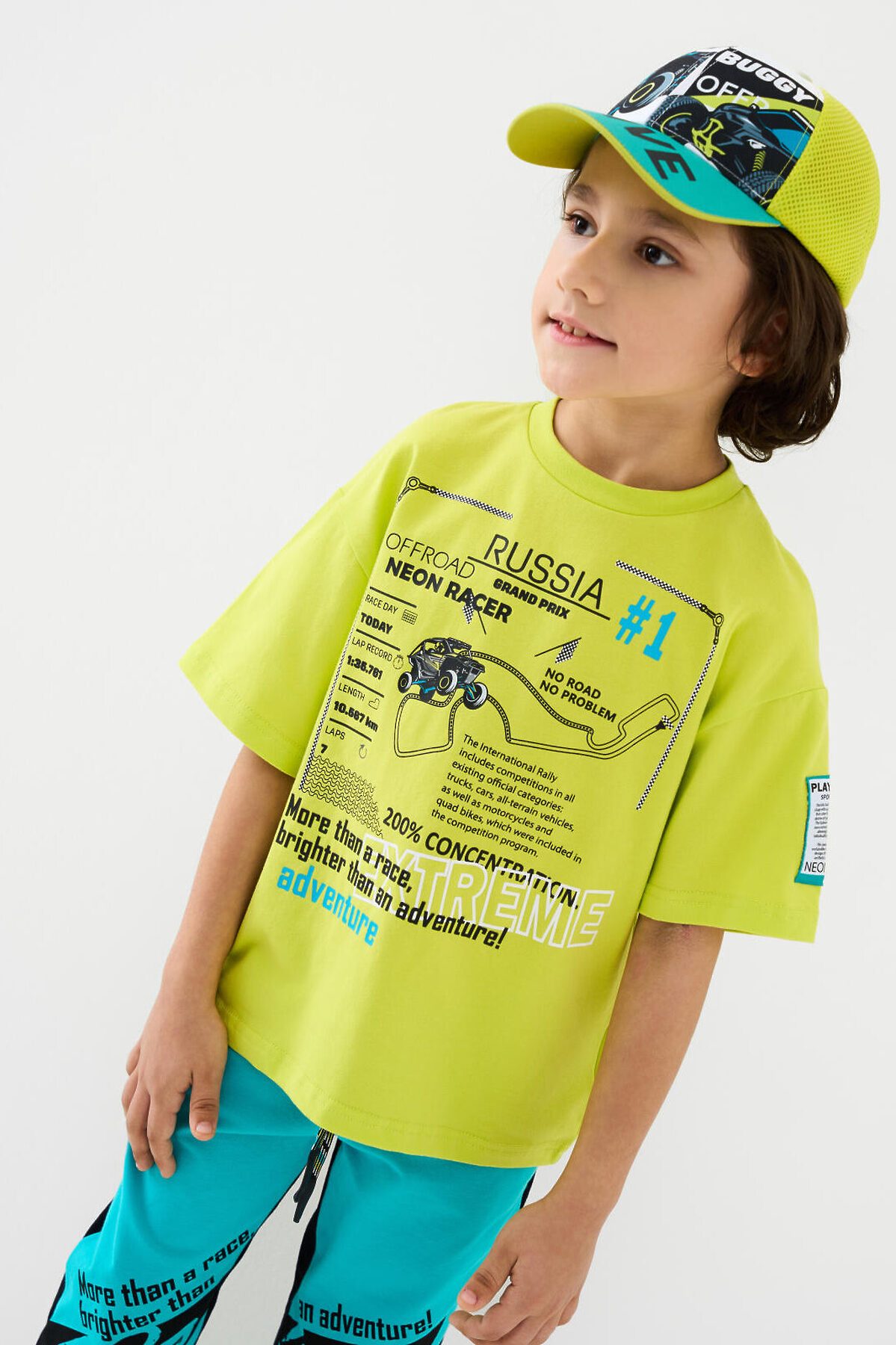 Детская футболка для мальчика. Модель прямого кроя, выполнена из эластичного хлопкового трикотажа джерси. Спереди расположен крупный принт. Горловина круглая, обработана эластичным рибом. На рукаве — небольшая нашивка.