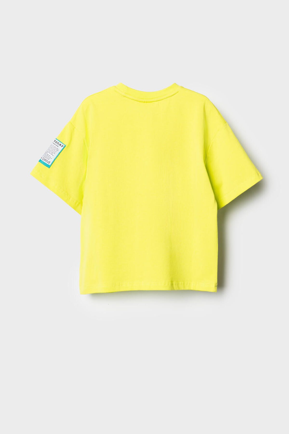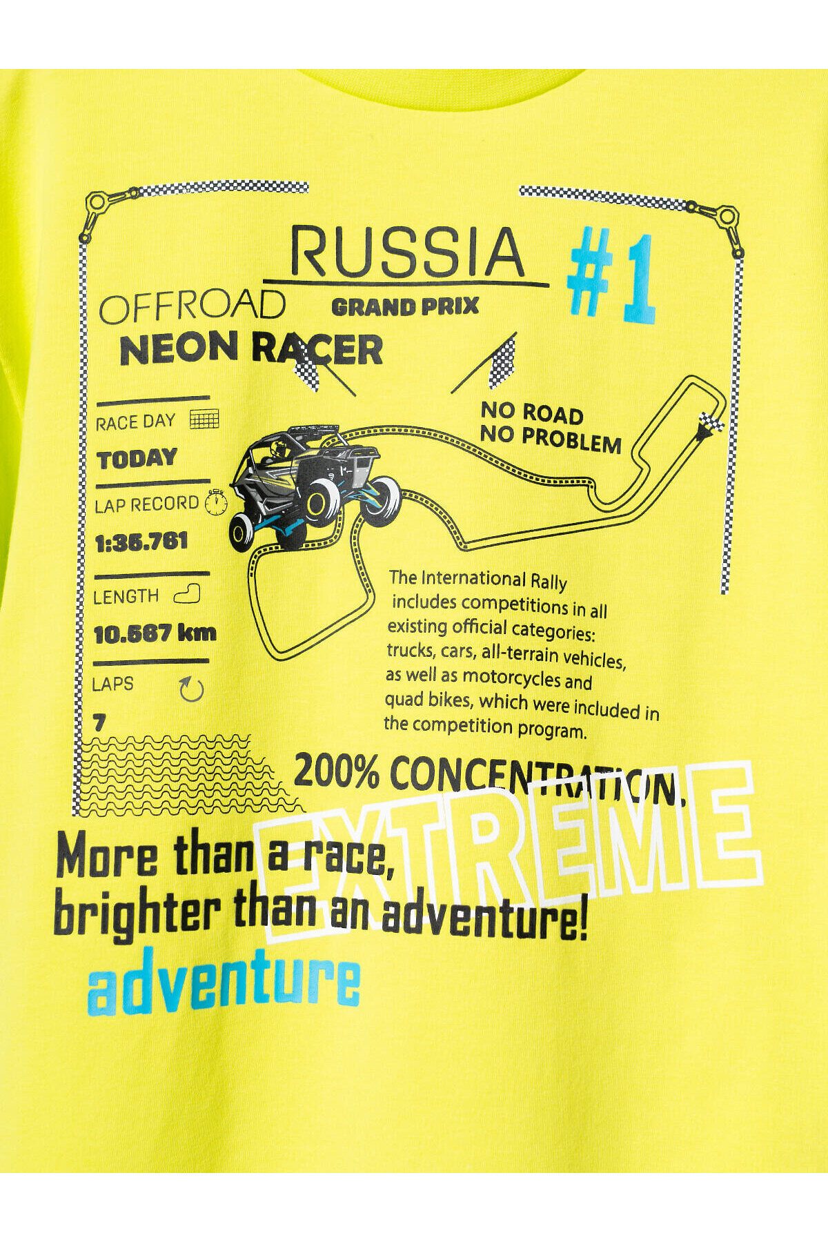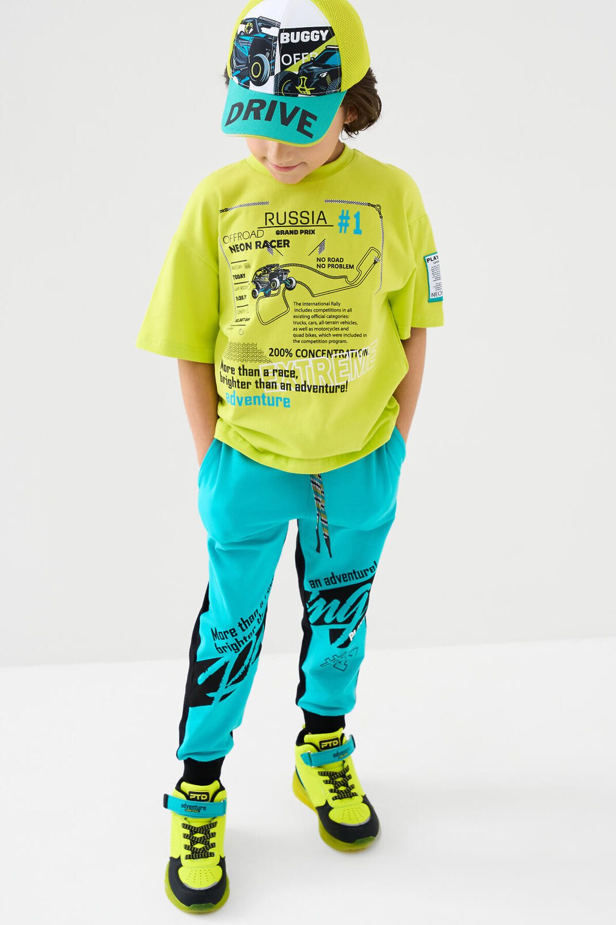 Детская футболка для мальчика. Модель прямого кроя, выполнена из эластичного хлопкового трикотажа джерси. Спереди расположен крупный принт. Горловина круглая, обработана эластичным рибом. На рукаве — небольшая нашивка.