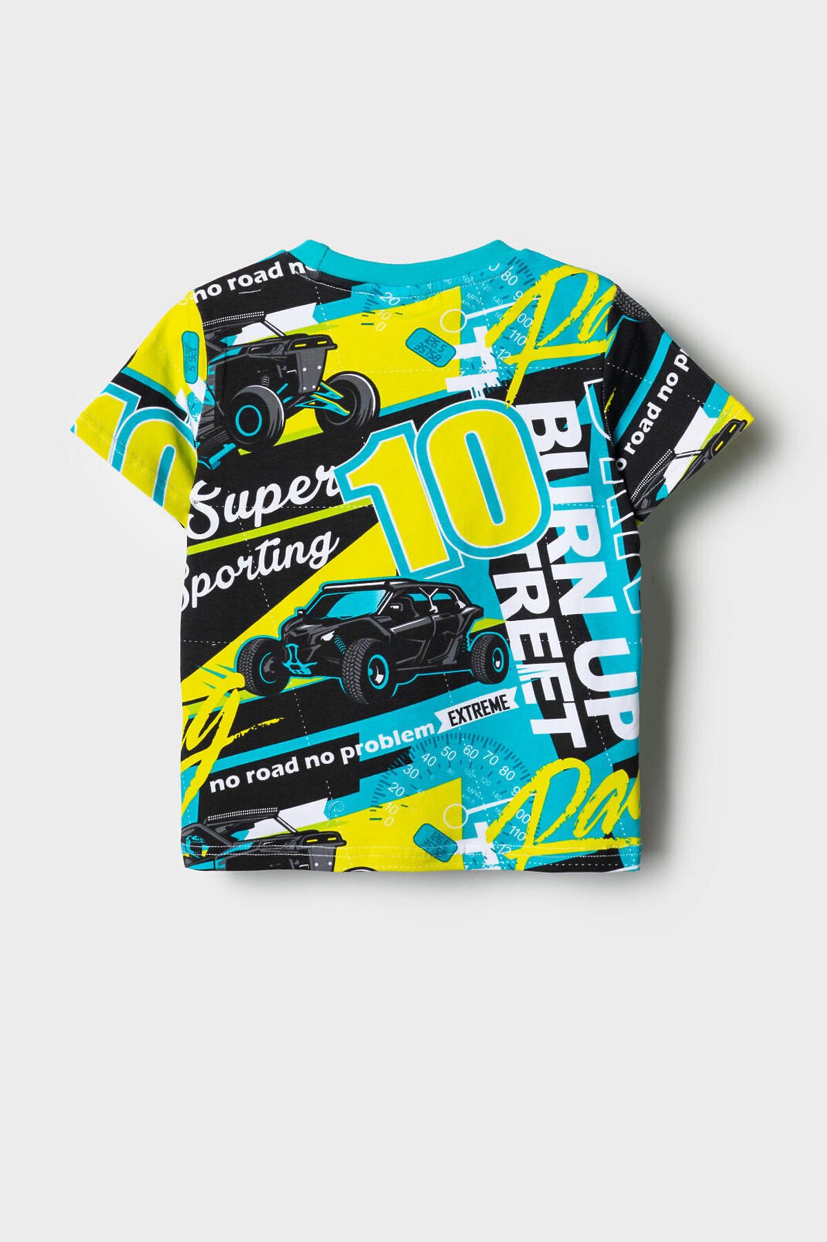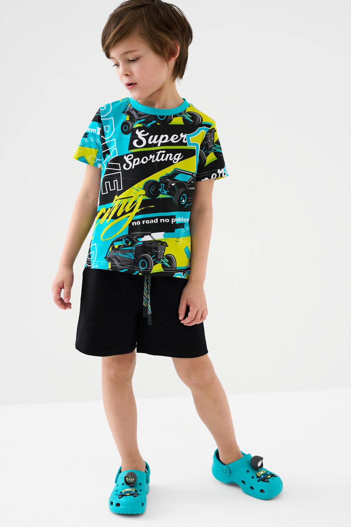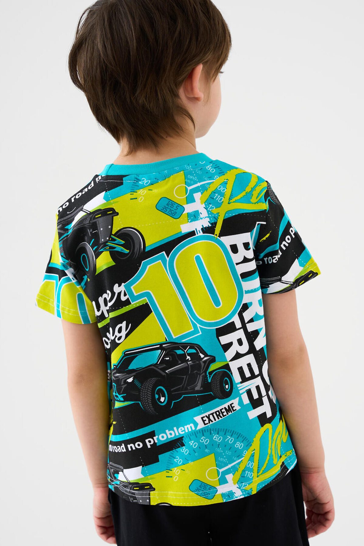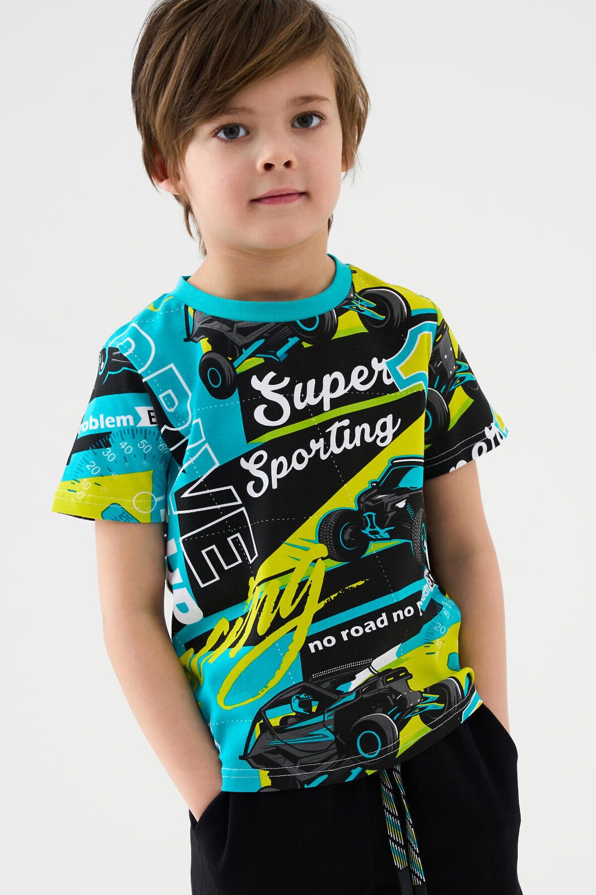 Детская футболка для мальчика. Модель прямого кроя, выполнена из эластичного хлопкового трикотажа джерси. Горловина круглая, обработана эластичным рибом.