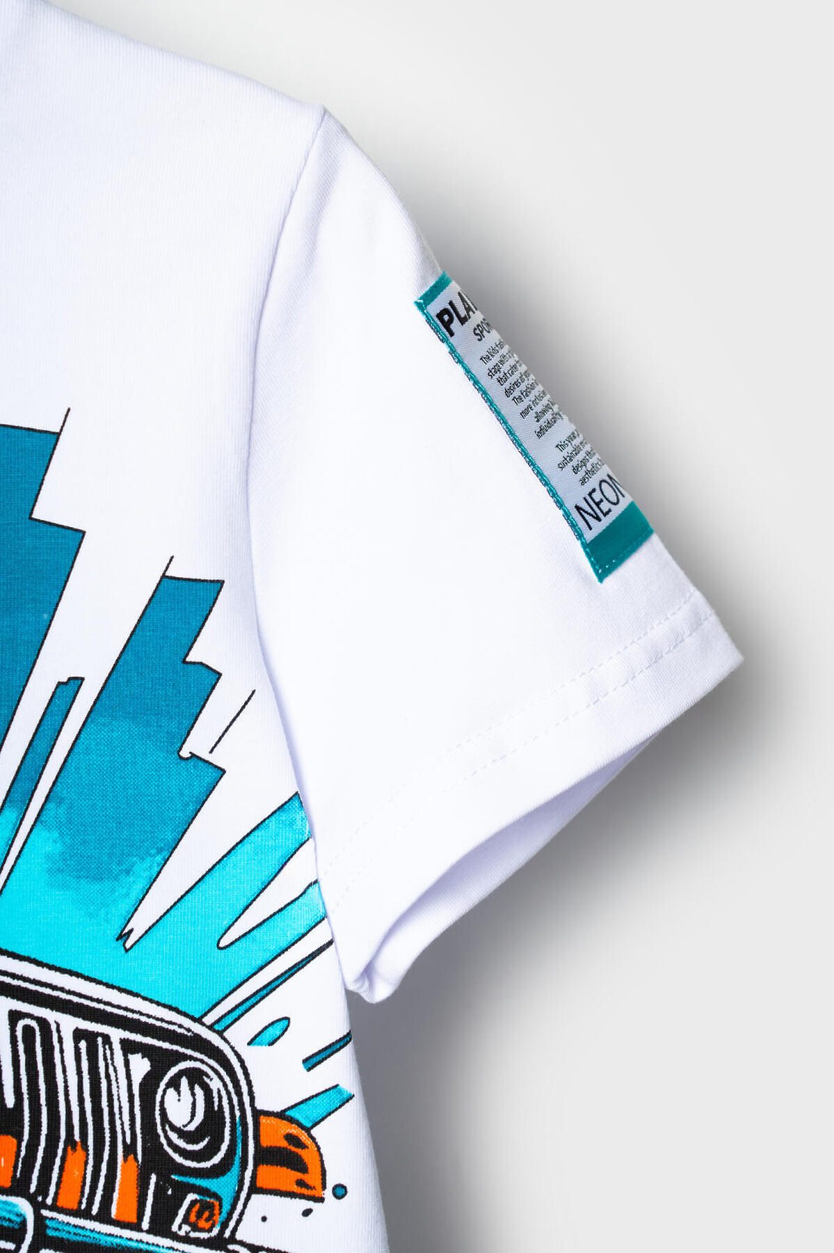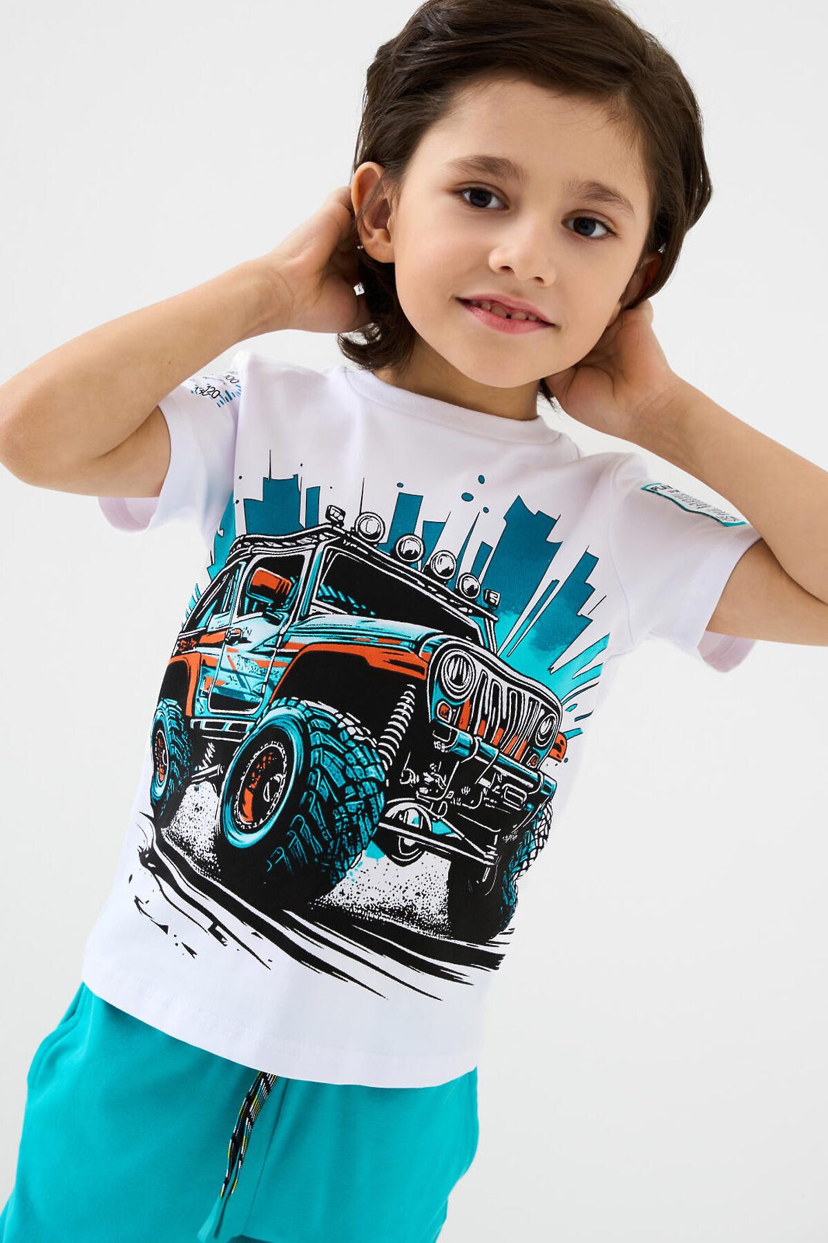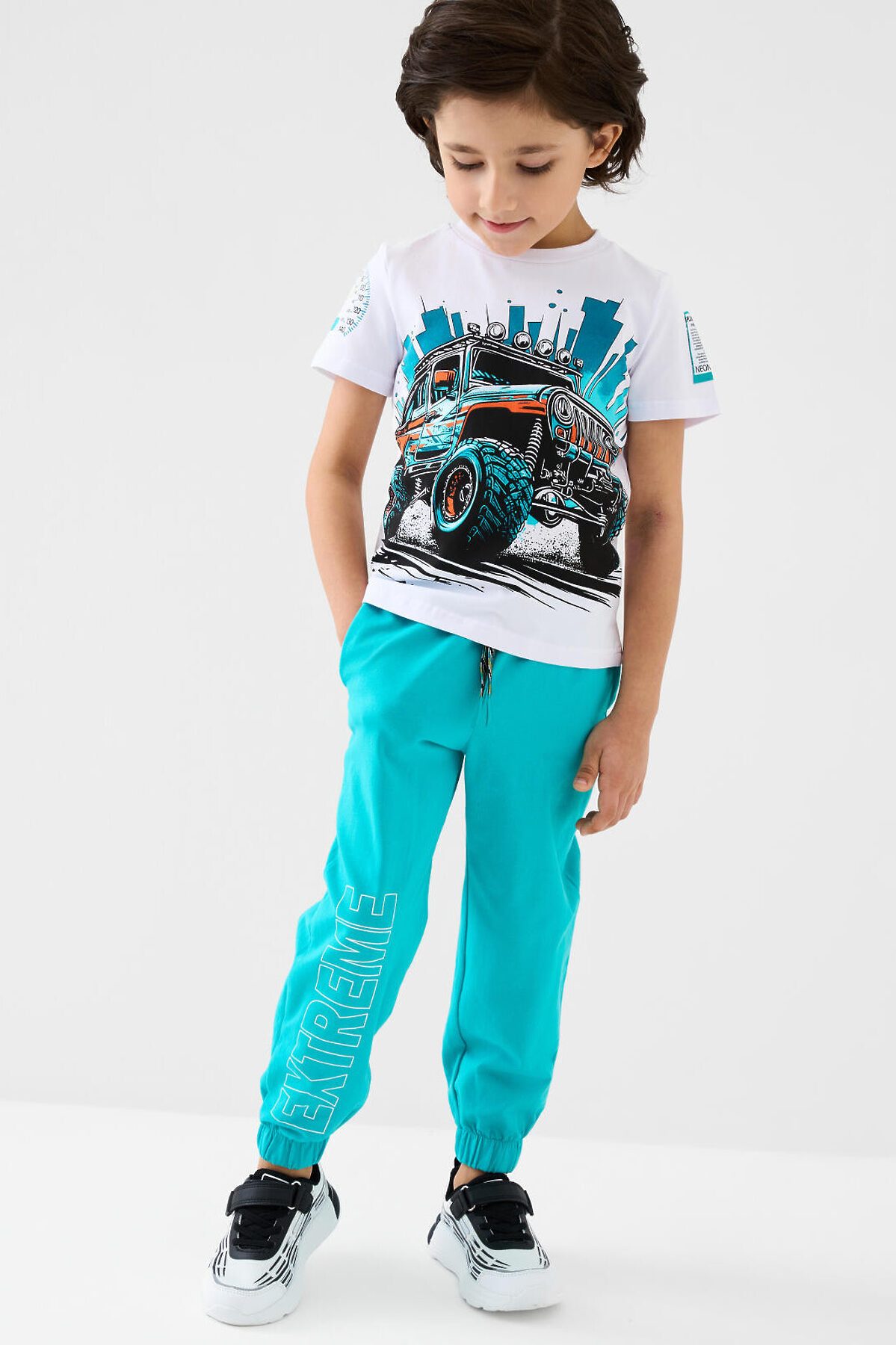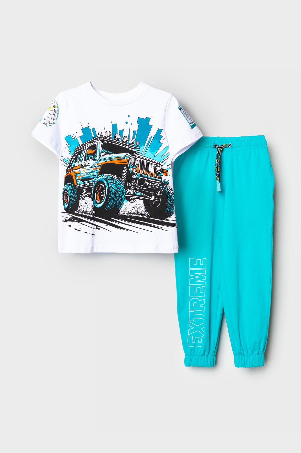 Детский костюм для мальчика. Состоит из футболки с коротким рукавом и брюк на резинке. Футболка прямого кроя с яркими принтами и нашивкой. Брюки выполнены из плотного хлопкового трикотажа. Джоггеры с комфортной посадкой, пояс на резинке дополнен шнурком. Удобные боковые карманы. Внизу — эластичные манжеты.