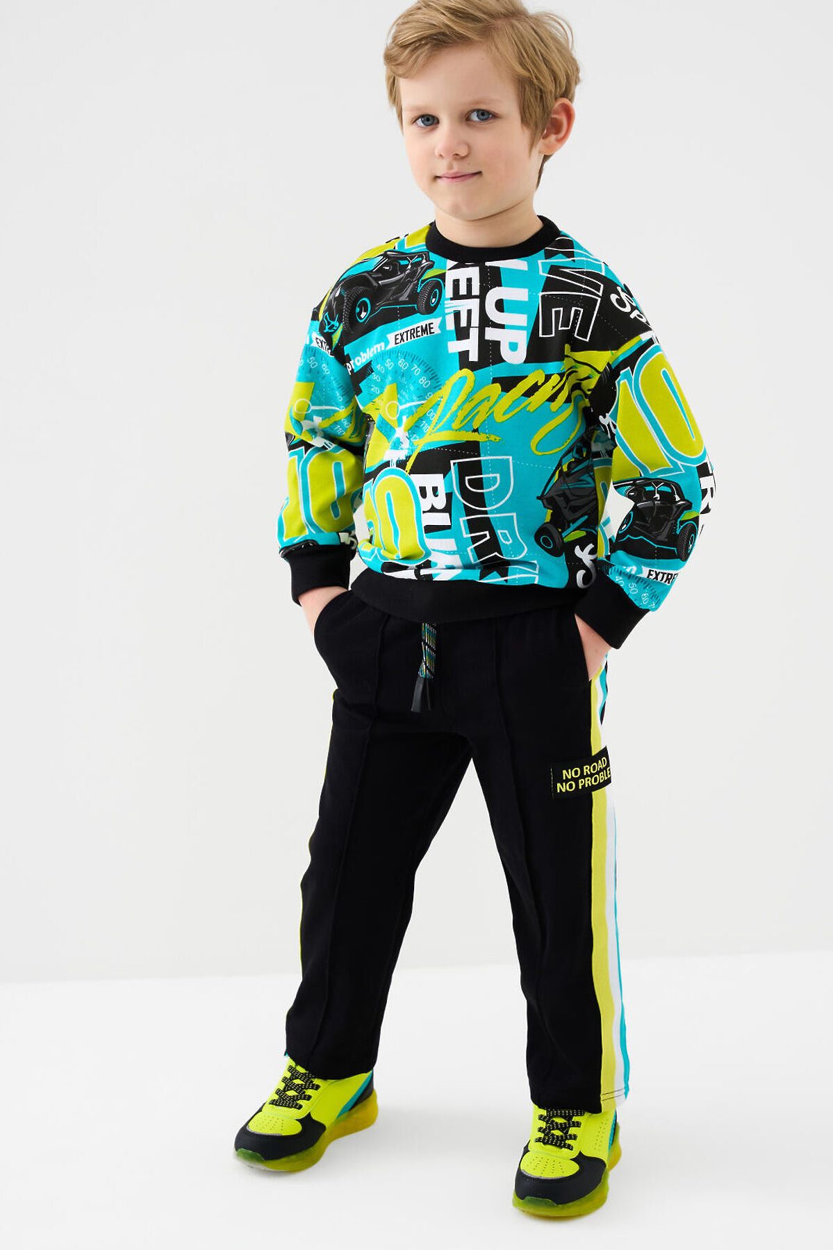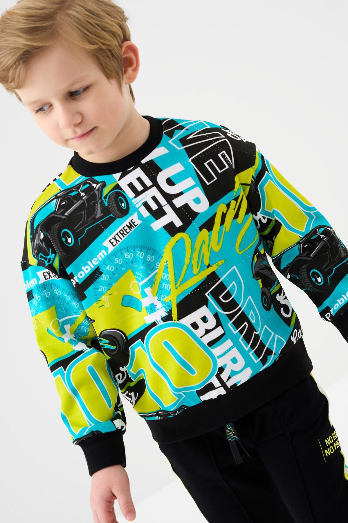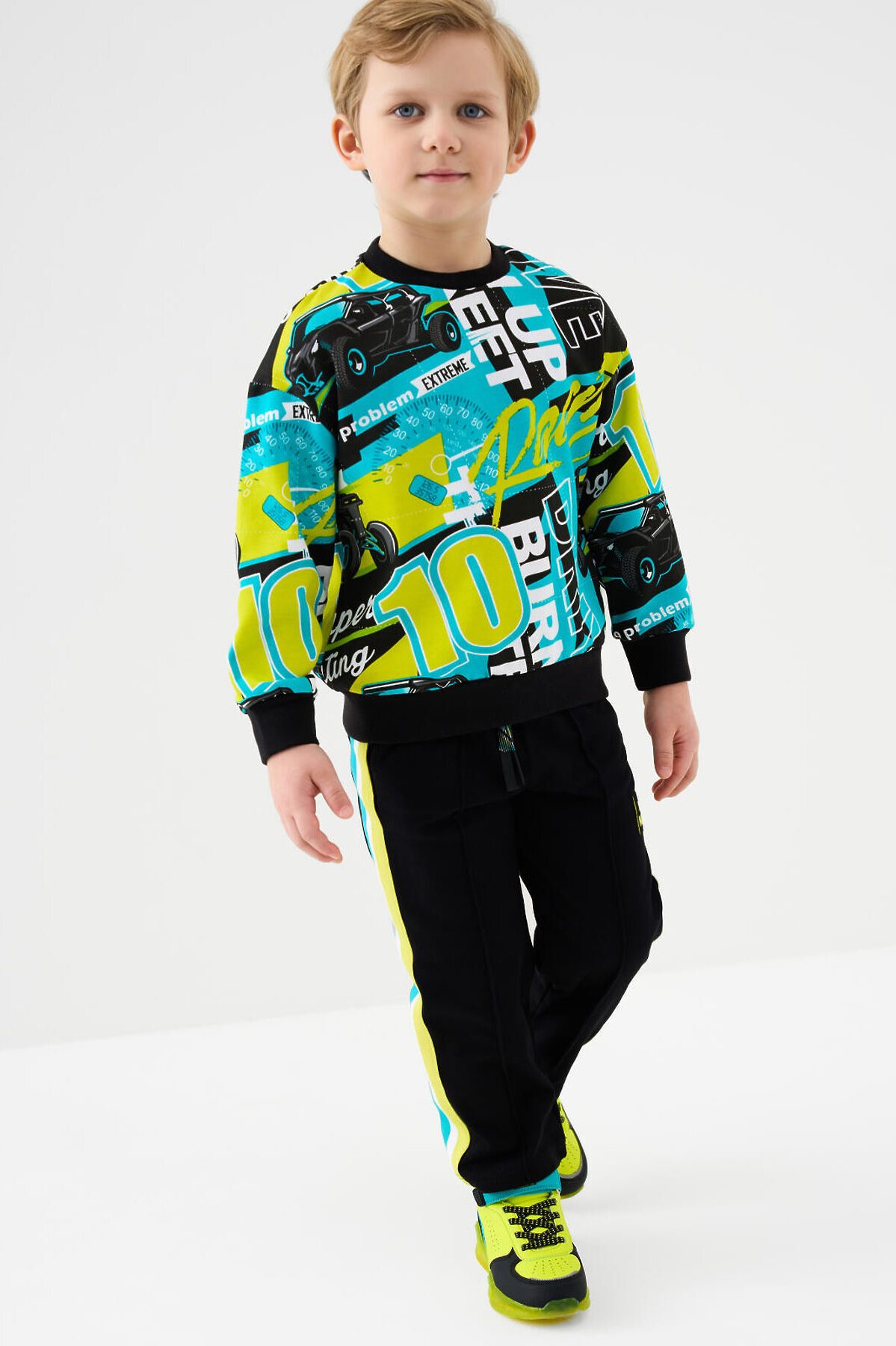 Детский спортивный костюм для мальчика. Комплект выполнен из хлопкового футера и состоит из свитшота и брюк на резинке. Толстовка прямого кроя с красочным принтом. Манжеты и пояс выполнены из эластичного риба, благодаря чему изделие хорошо держит форму. Широкие брюки — комфортные, с эластичным поясом и шнуром для регулировки посадки. Удобные боковые карманы.