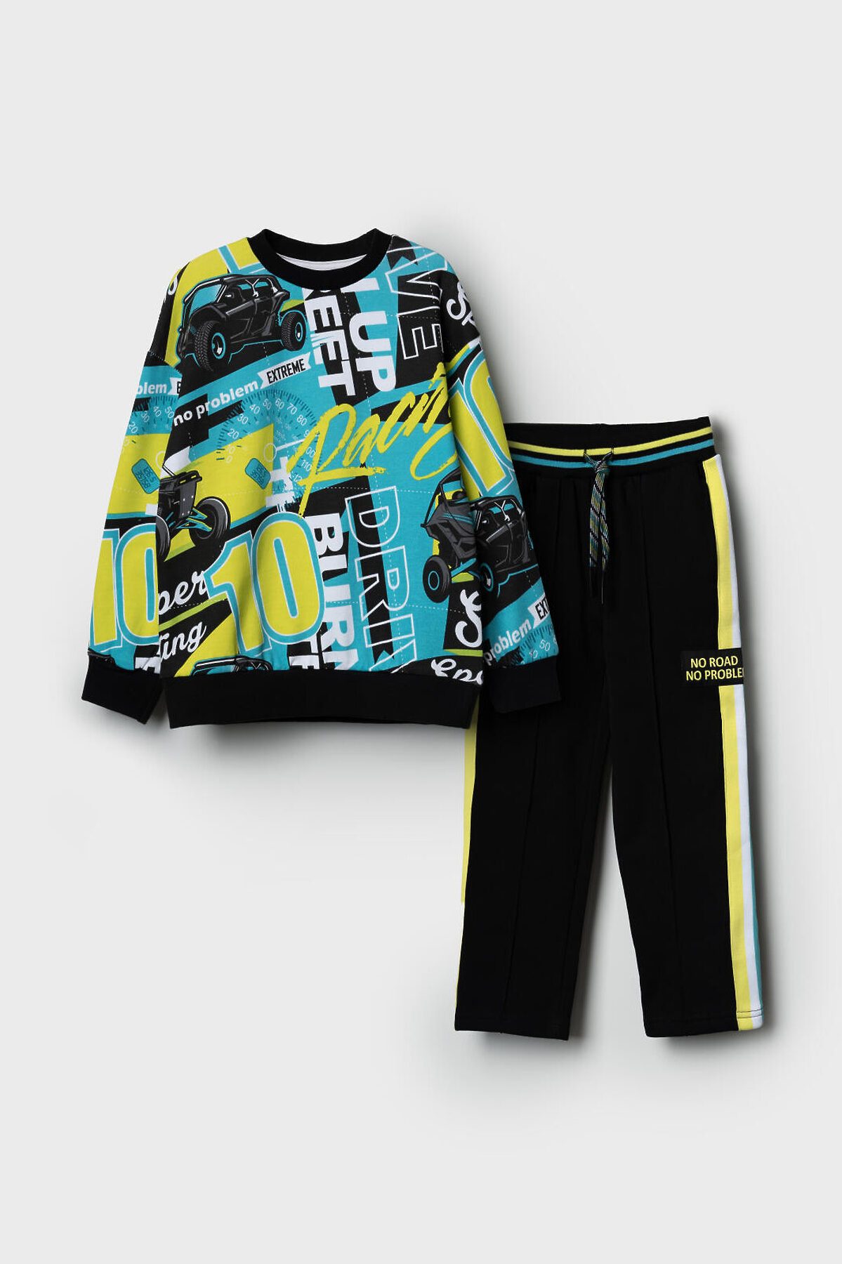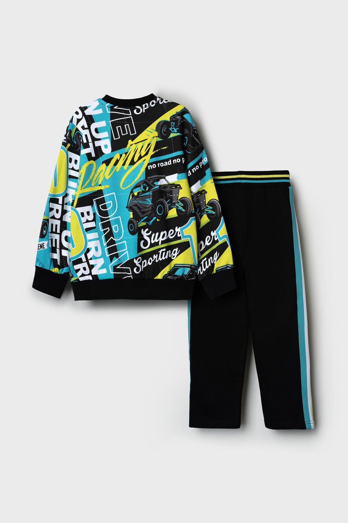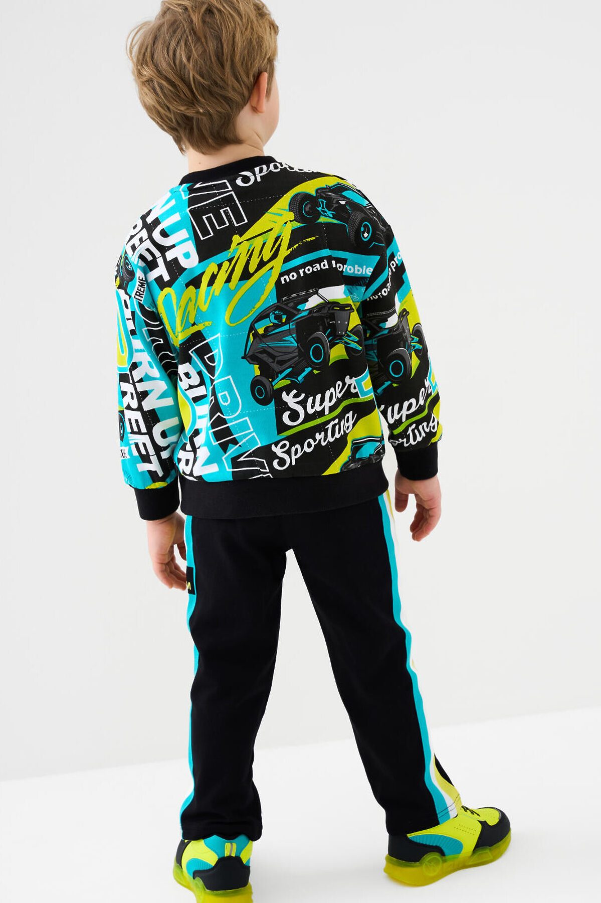 Детский спортивный костюм для мальчика. Комплект выполнен из хлопкового футера и состоит из свитшота и брюк на резинке. Толстовка прямого кроя с красочным принтом. Манжеты и пояс выполнены из эластичного риба, благодаря чему изделие хорошо держит форму. Широкие брюки — комфортные, с эластичным поясом и шнуром для регулировки посадки. Удобные боковые карманы.
