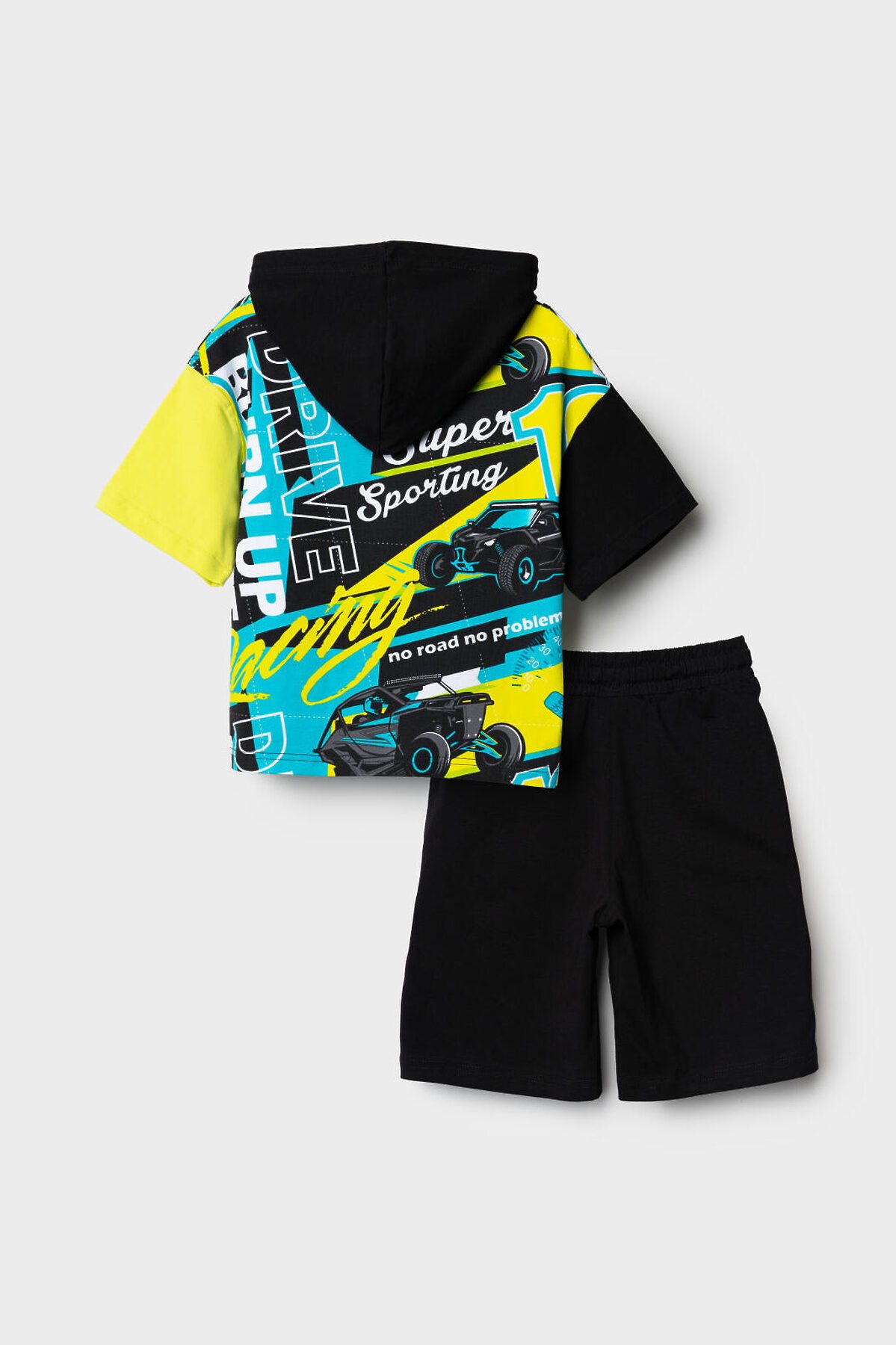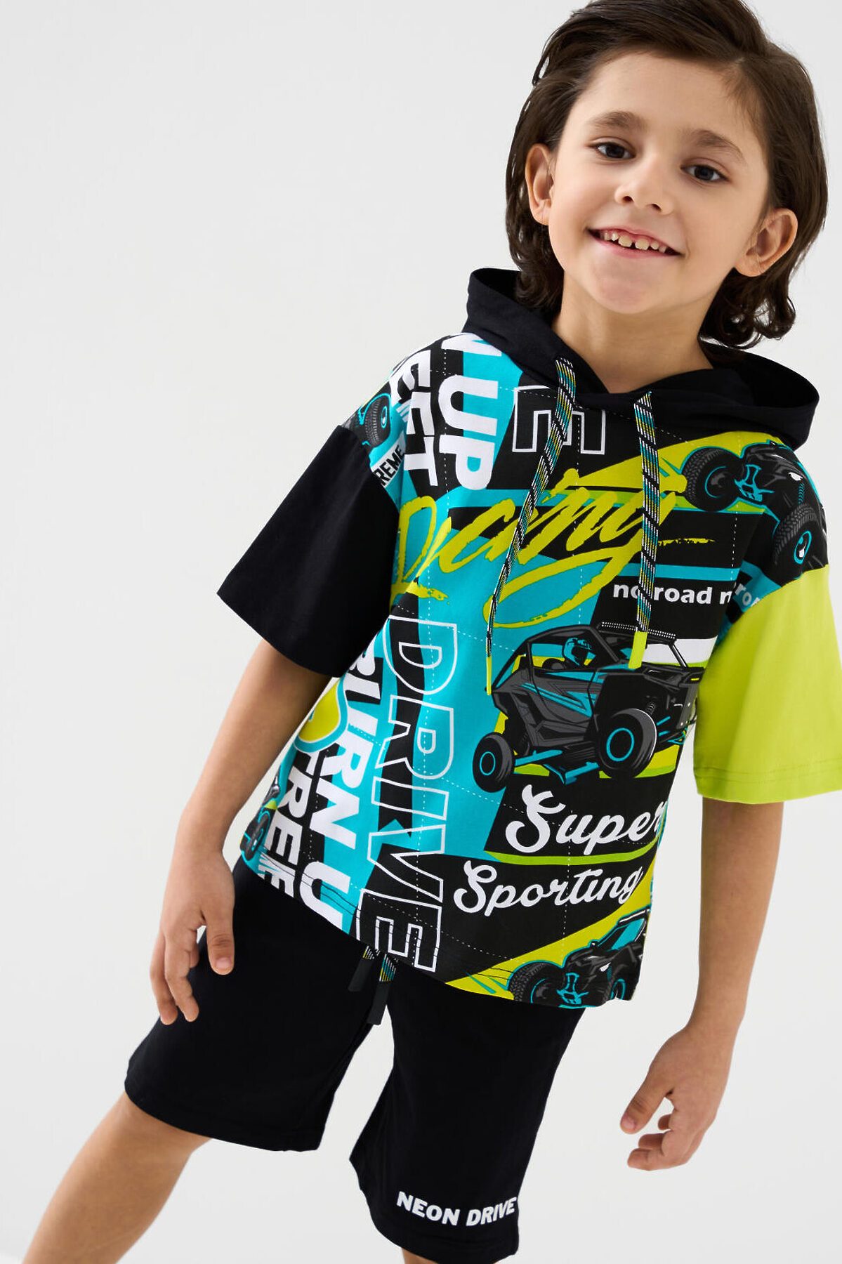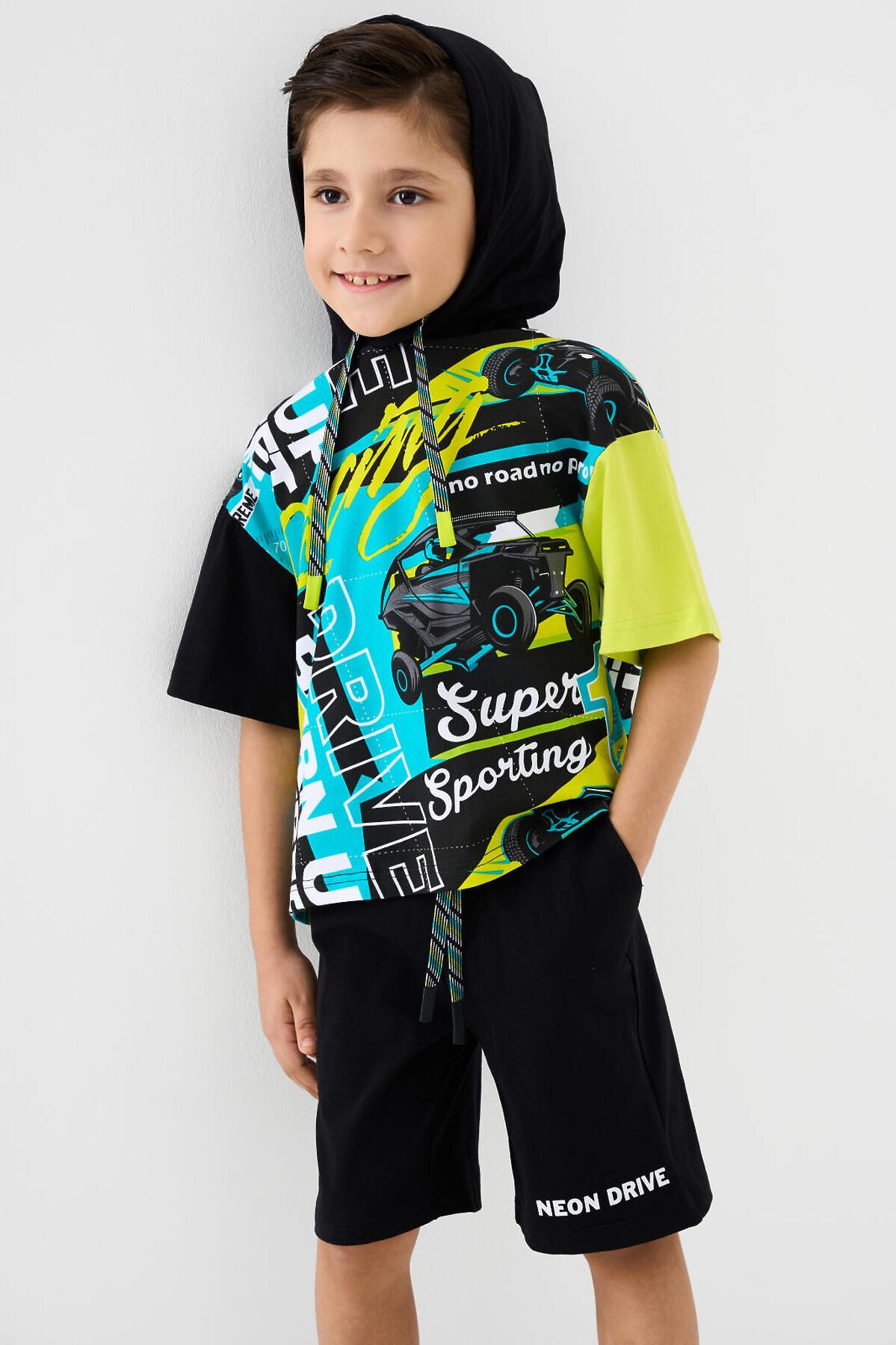 Детский костюм для мальчика. Состоит из футболки с капюшоном и шорт. Выполнен из хлопкового трикотажа. Футболка свободного кроя, с коротким рукавом. Яркий принт и нашивки в гоночной тематике. Шорты свободные, с эластичным поясом и шнурком для регулировки посадки. По бокам расположены карманы.