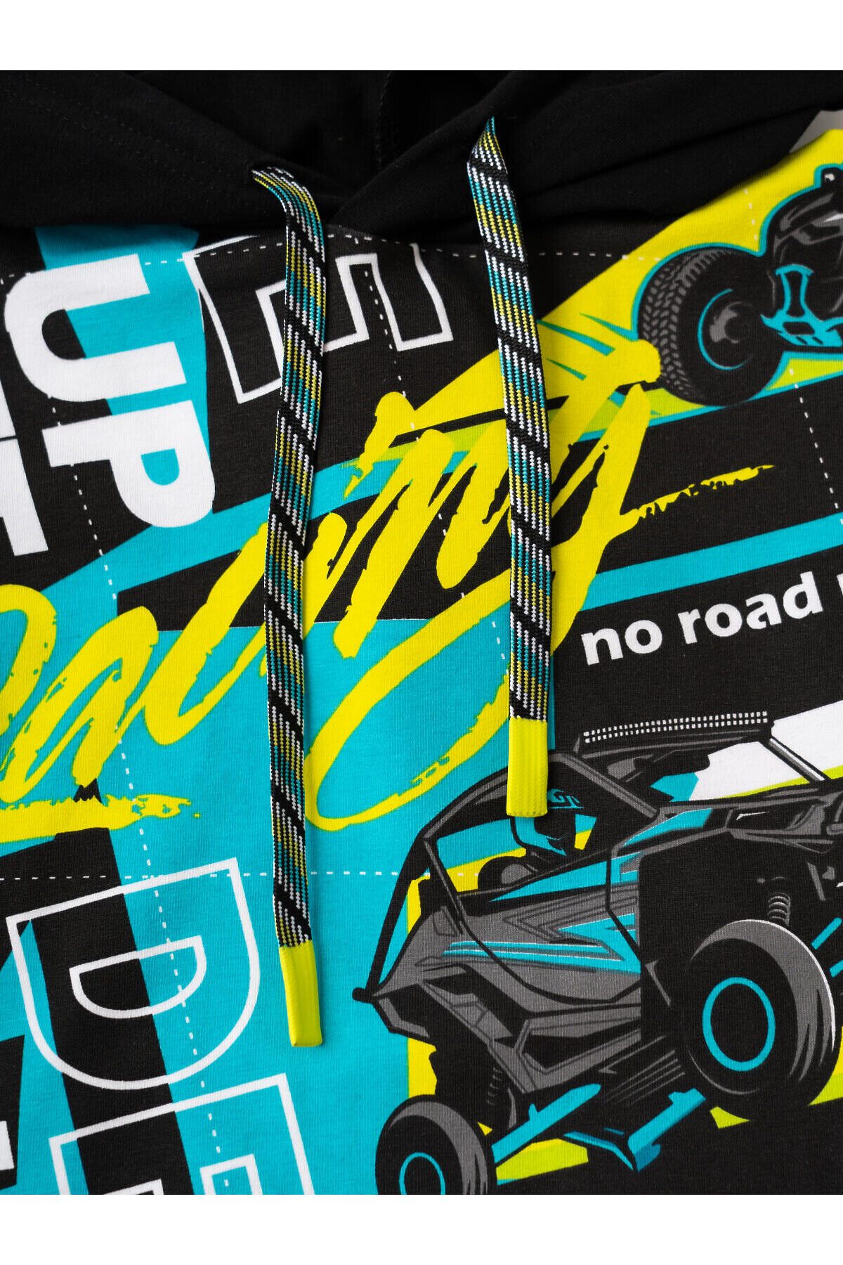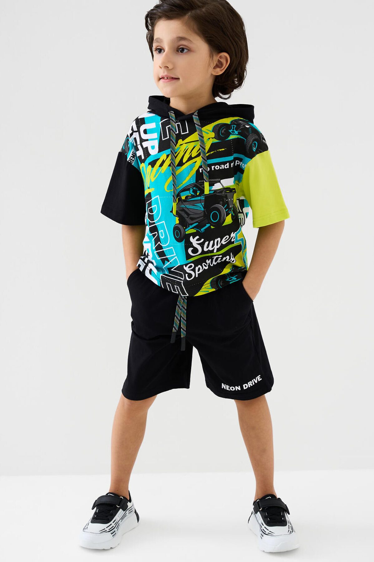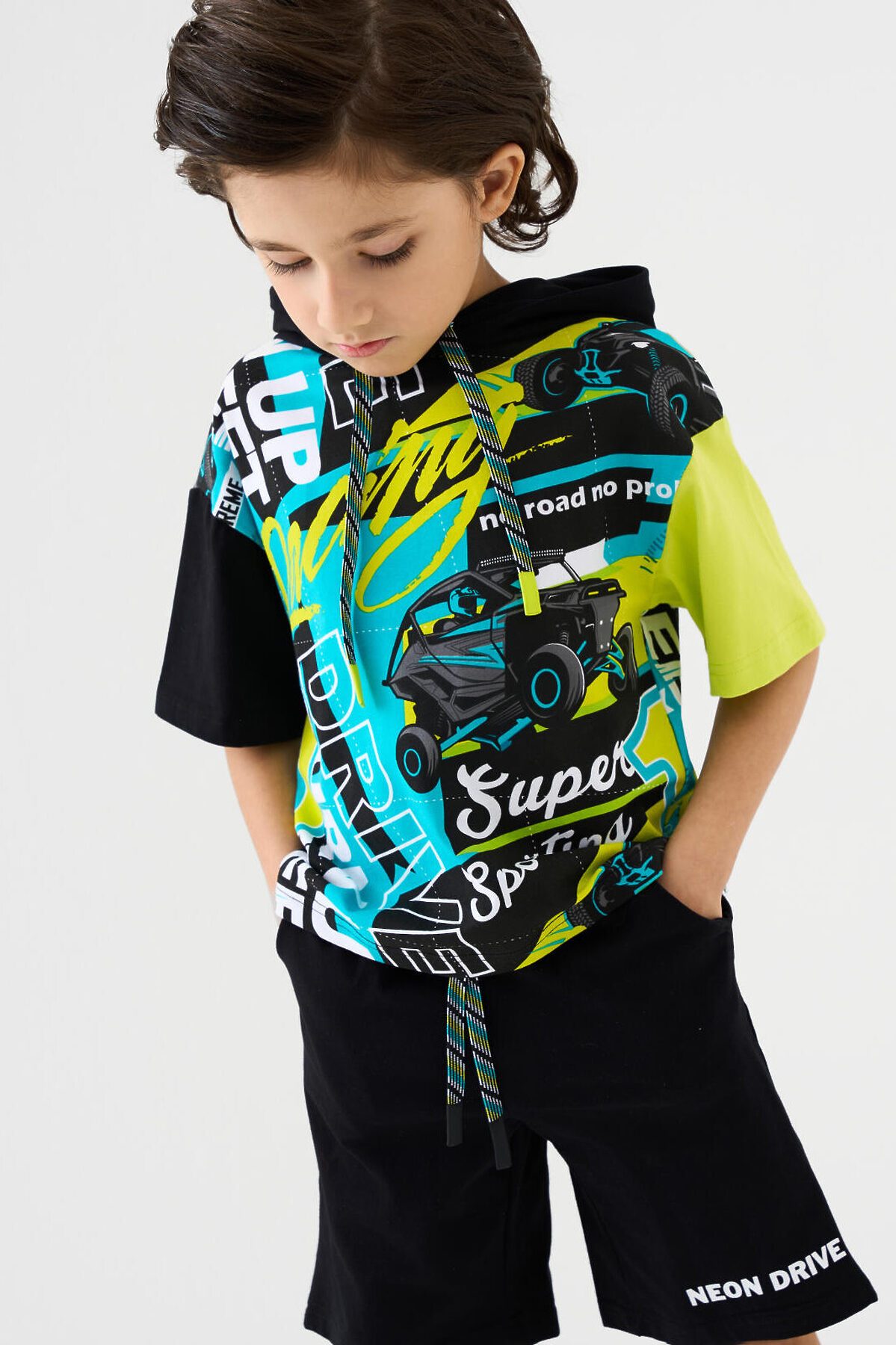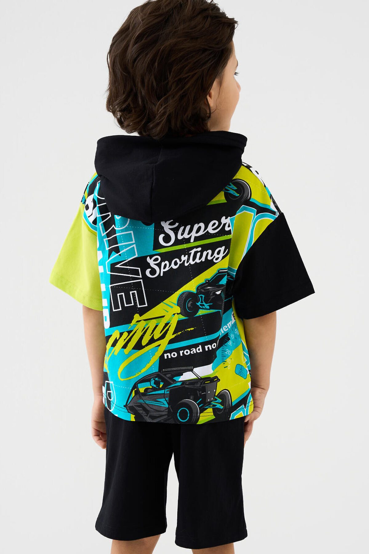 Детский костюм для мальчика. Состоит из футболки с капюшоном и шорт. Выполнен из хлопкового трикотажа. Футболка свободного кроя, с коротким рукавом. Яркий принт и нашивки в гоночной тематике. Шорты свободные, с эластичным поясом и шнурком для регулировки посадки. По бокам расположены карманы.