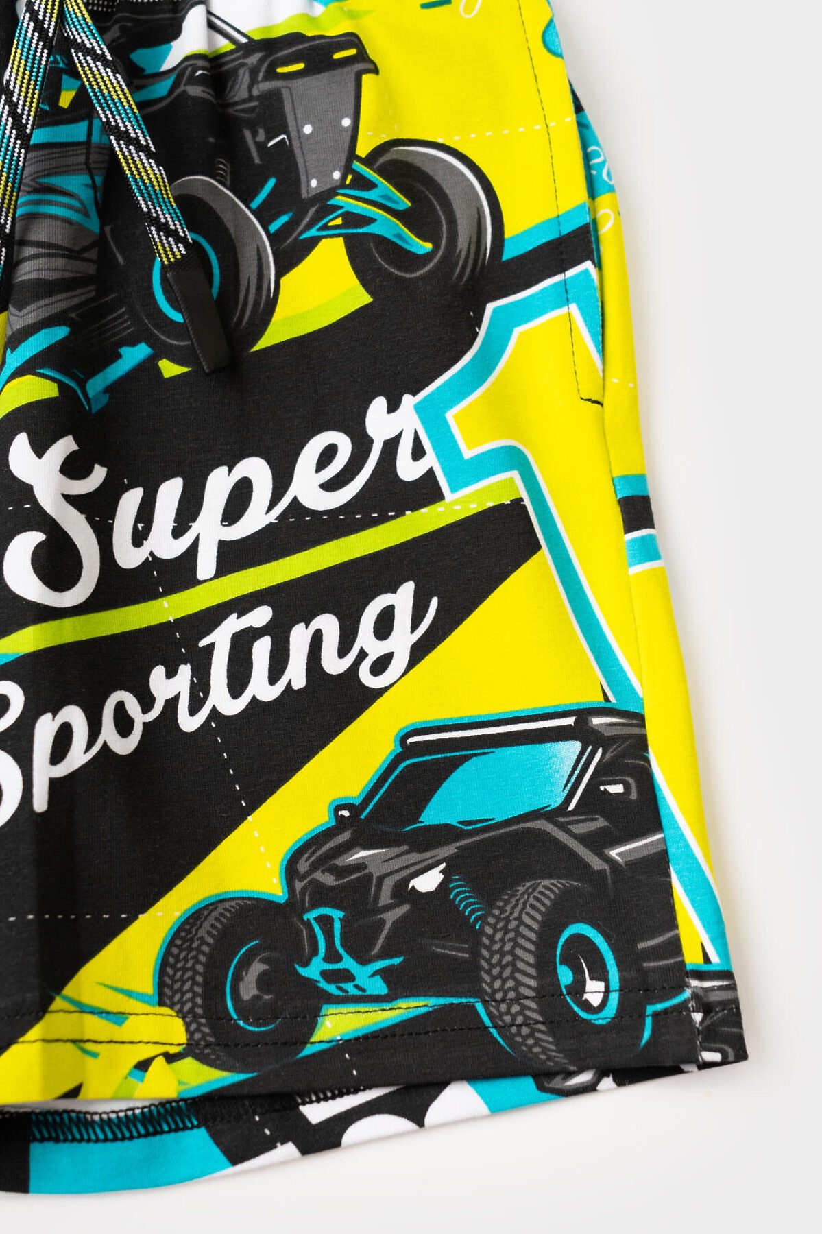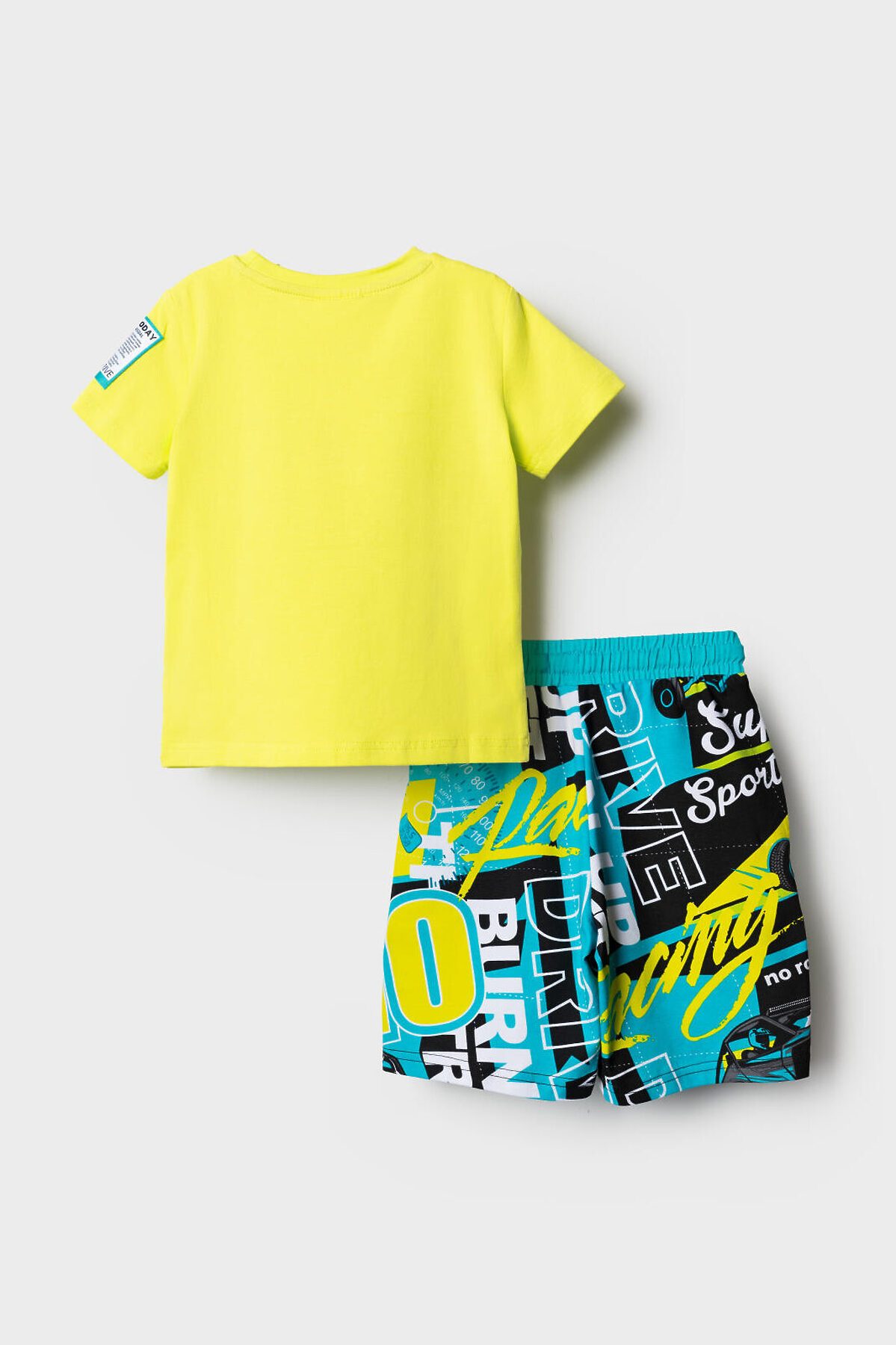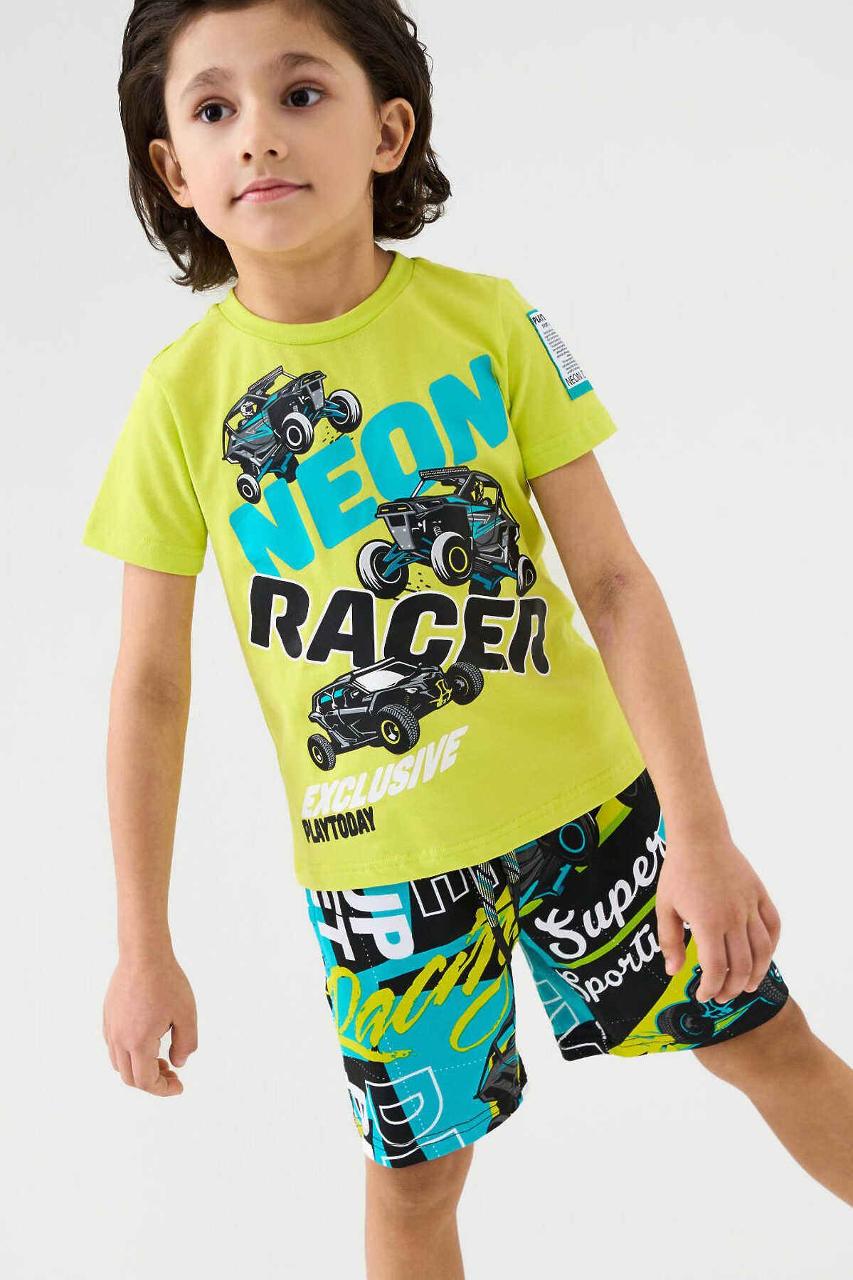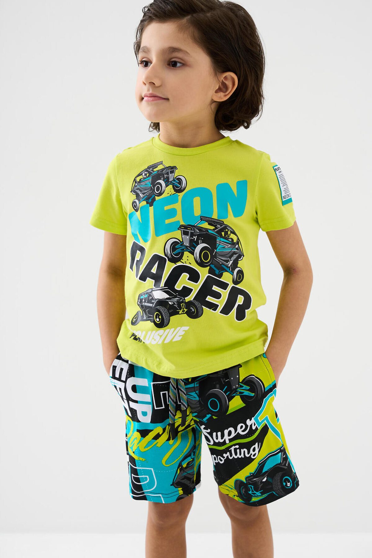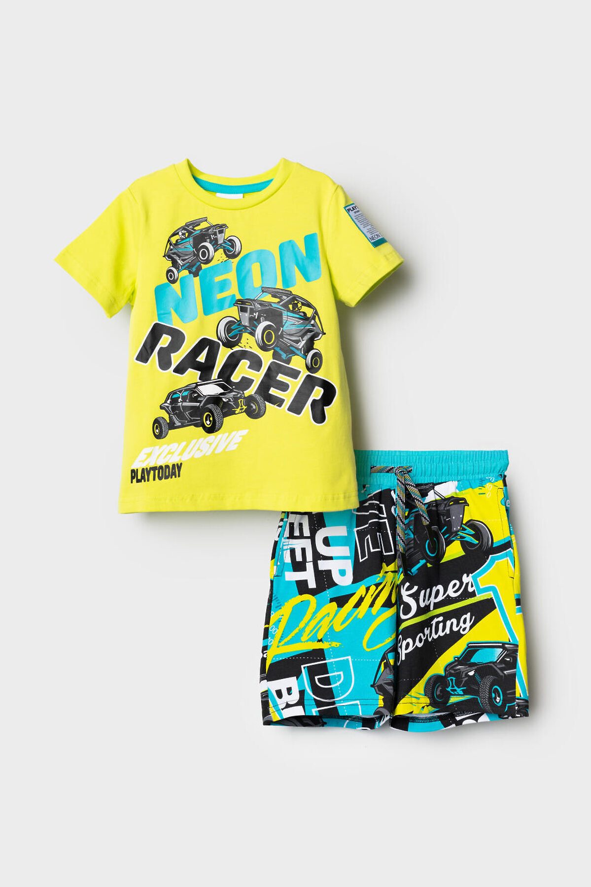 Детский костюм для мальчика. Состоит из футболки и шорт. Выполнен из хлопкового трикотажа. Футболка прямого кроя, с коротким рукавом. Яркий принт и нашивки в гоночной тематике. Шорты свободные, с эластичным поясом и шнурком для регулировки посадки. По бокам расположены карманы.