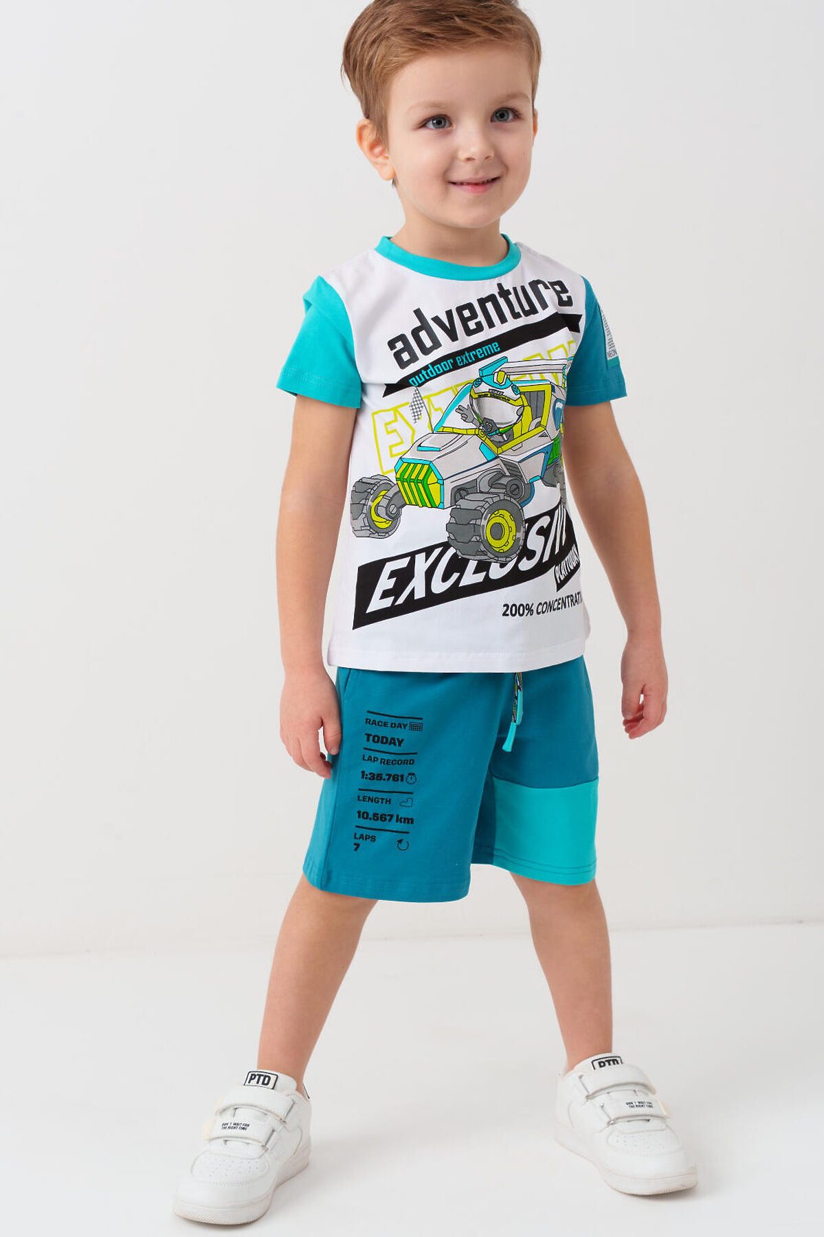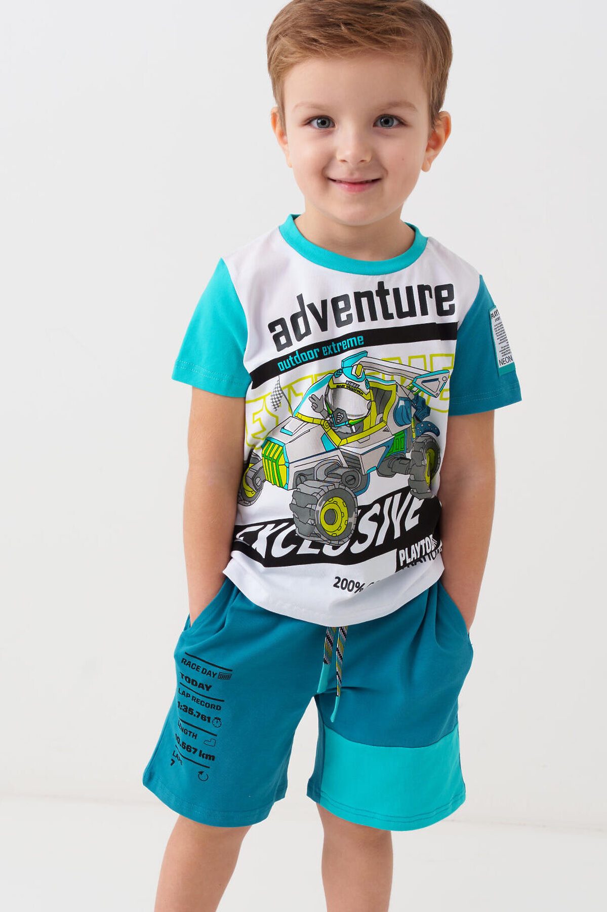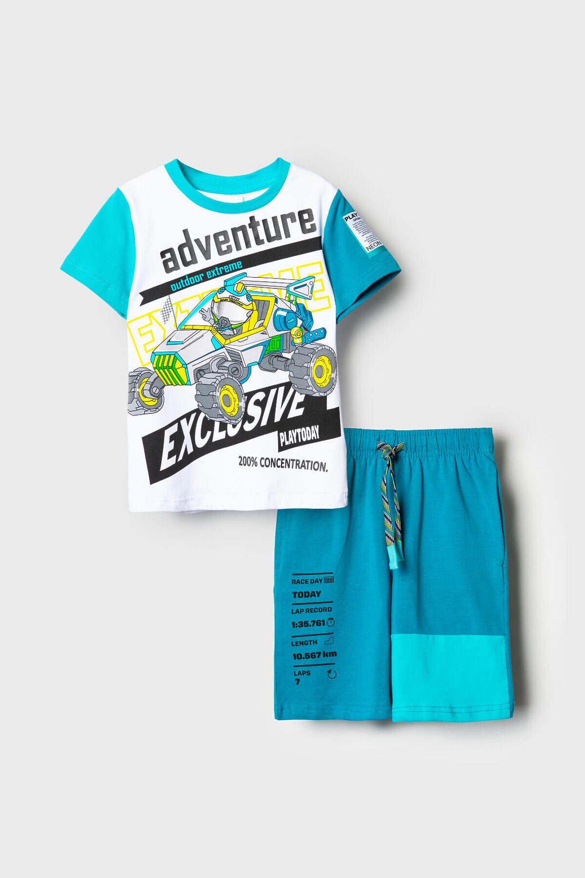 Детский костюм для мальчика. Состоит из футболки и шорт. Выполнен из хлопкового трикотажа. Футболка прямого кроя, с коротким рукавом. Яркий принт и нашивки в гоночной тематике. Шорты свободные, с эластичным поясом и шнурком для регулировки посадки. По бокам расположены карманы.