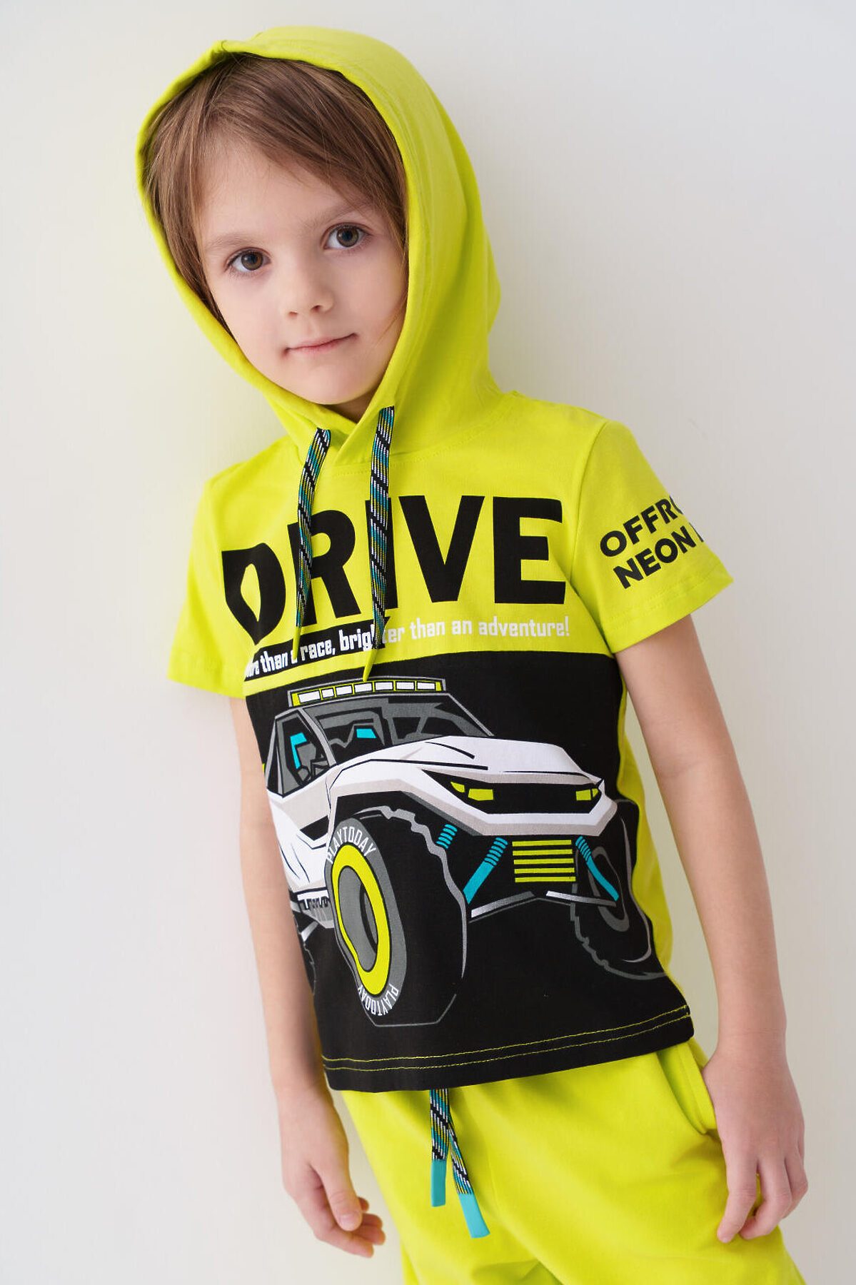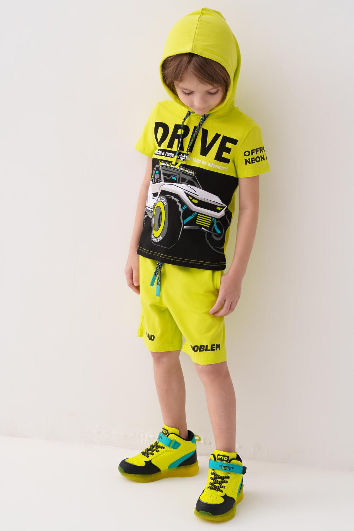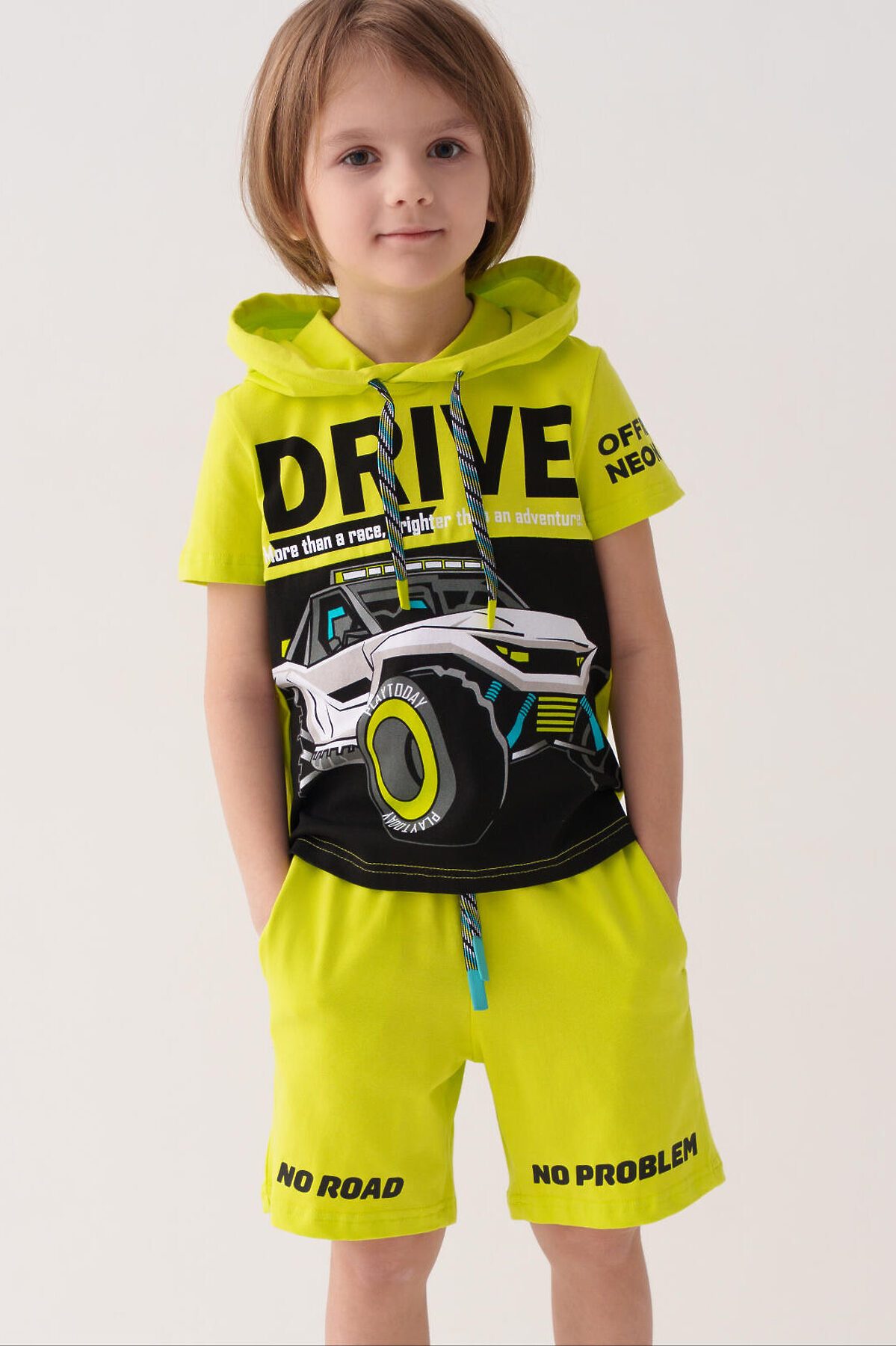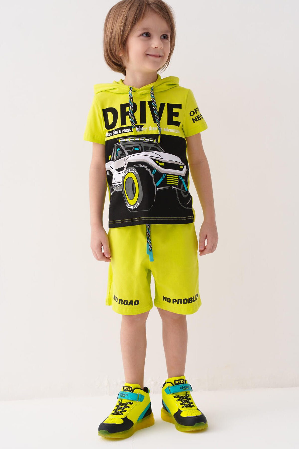 Детский костюм для мальчика. Состоит из футболки и шорт. Выполнен из хлопкового трикотажа. Футболка прямого кроя с капюшоном. Регулировка капюшона шнуром. Яркий принт и гоночной тематике. Шорты свободные, с эластичным поясом и шнурком для регулировки посадки. По бокам расположены карманы.