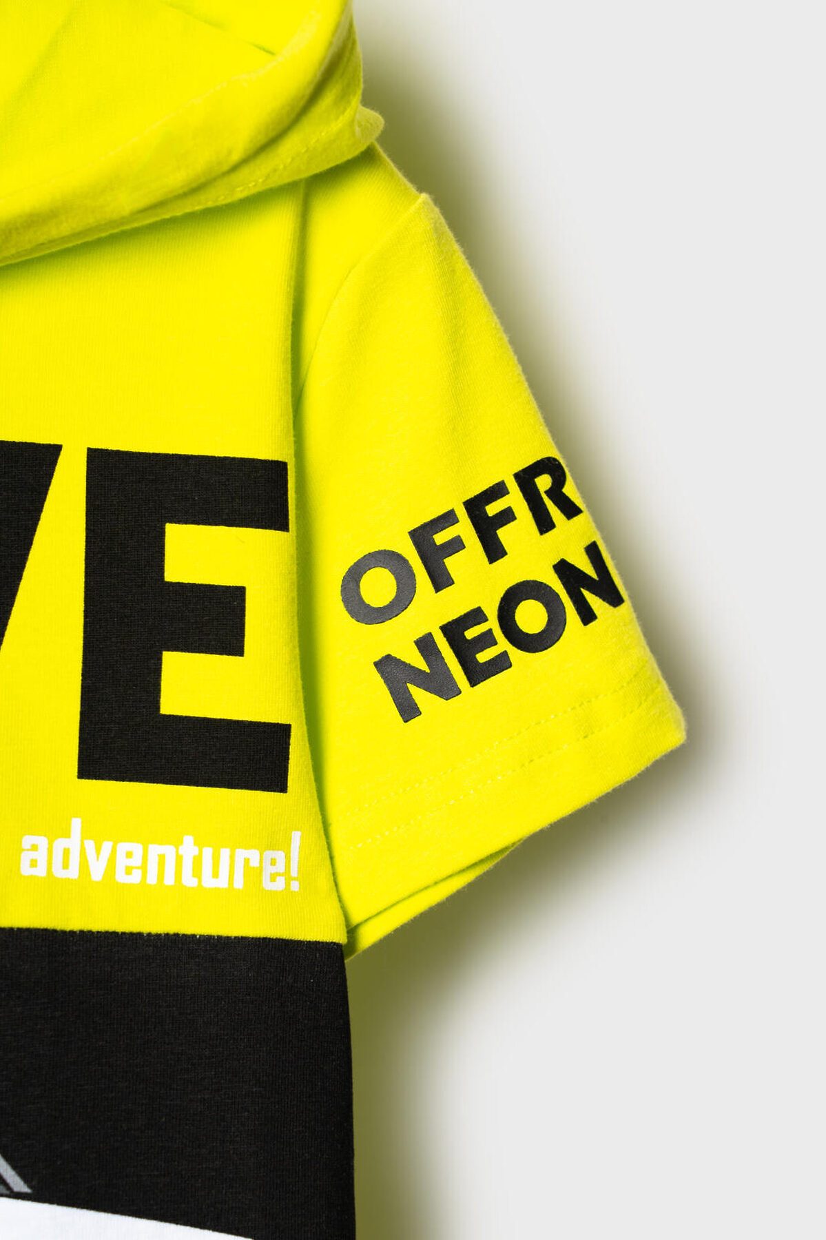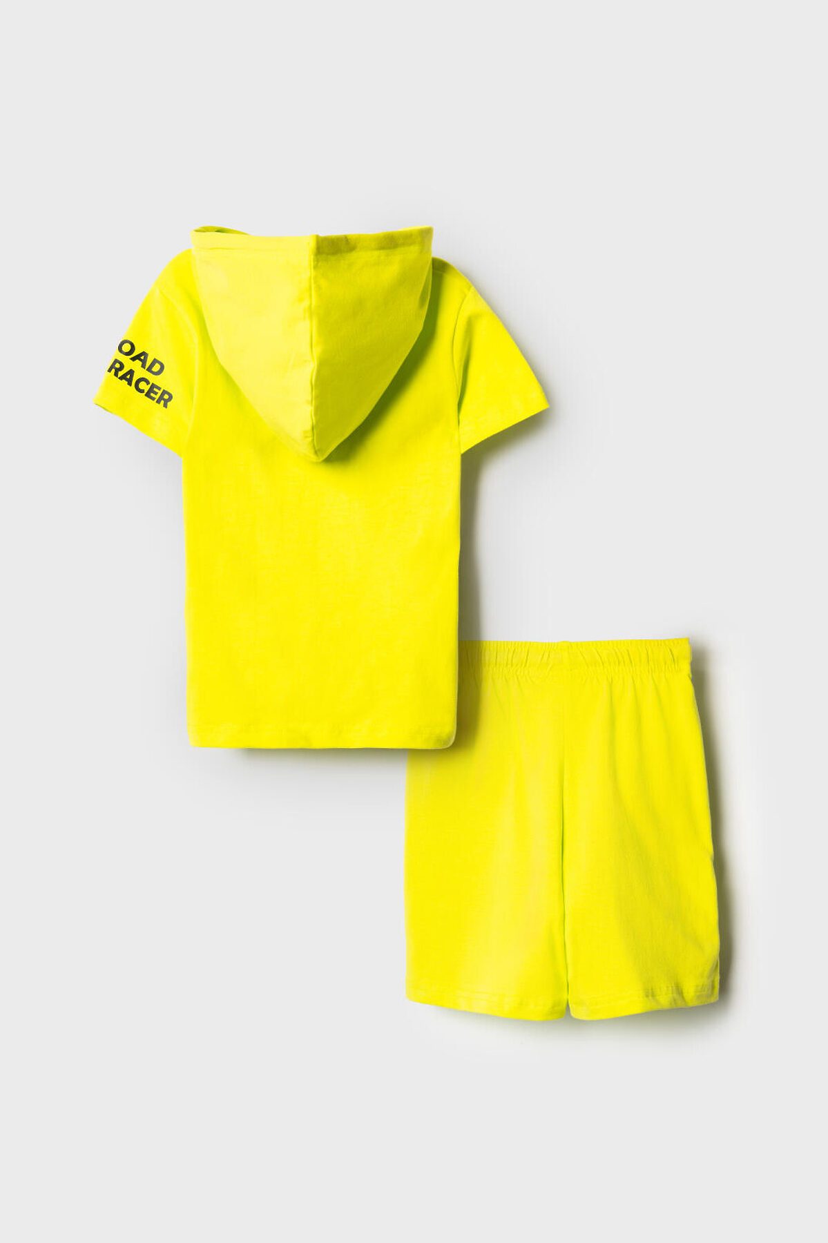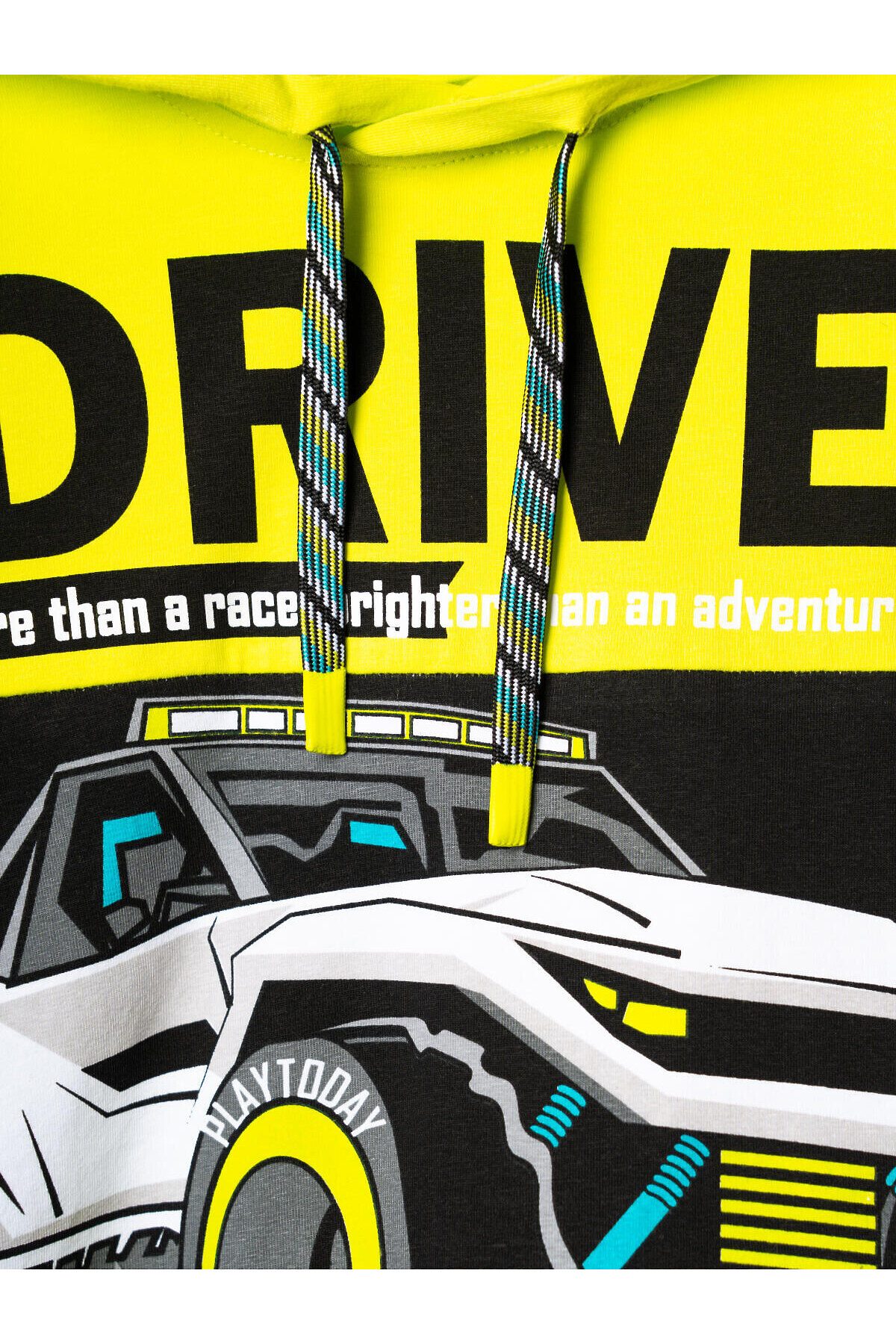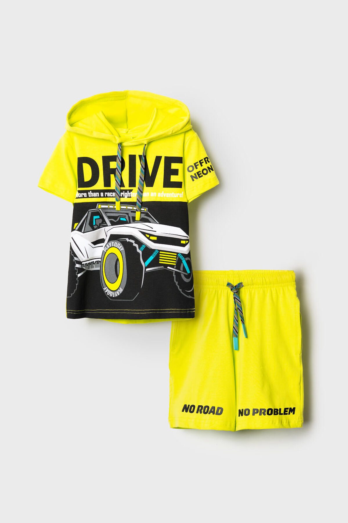 Детский костюм для мальчика. Состоит из футболки и шорт. Выполнен из хлопкового трикотажа. Футболка прямого кроя с капюшоном. Регулировка капюшона шнуром. Яркий принт и гоночной тематике. Шорты свободные, с эластичным поясом и шнурком для регулировки посадки. По бокам расположены карманы.