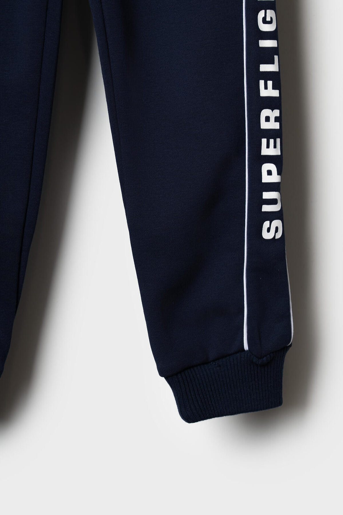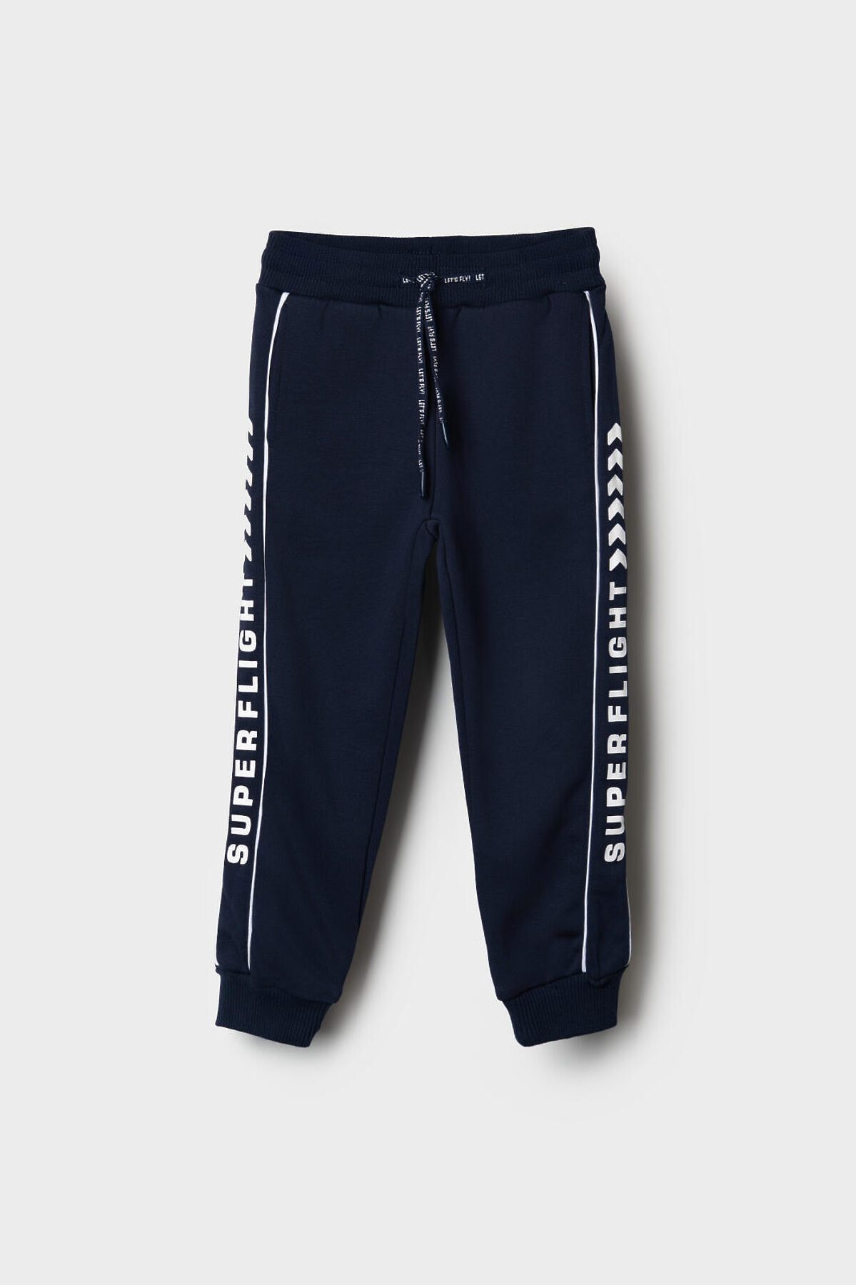 Брюки-джоггеры детские для мальчика. Выполнены из хлопкового трикотажа футер без начеса. Модель прямого кроя со средней посадкой на талии. Пояс выполнен на резинке, дополнительно регулируется шнурком. По бокам — удобные карманы. В нижней части брючин предусмотрены эластичные трикотажные манжеты для лучшей фиксации. Украшены лампасами и принтами.