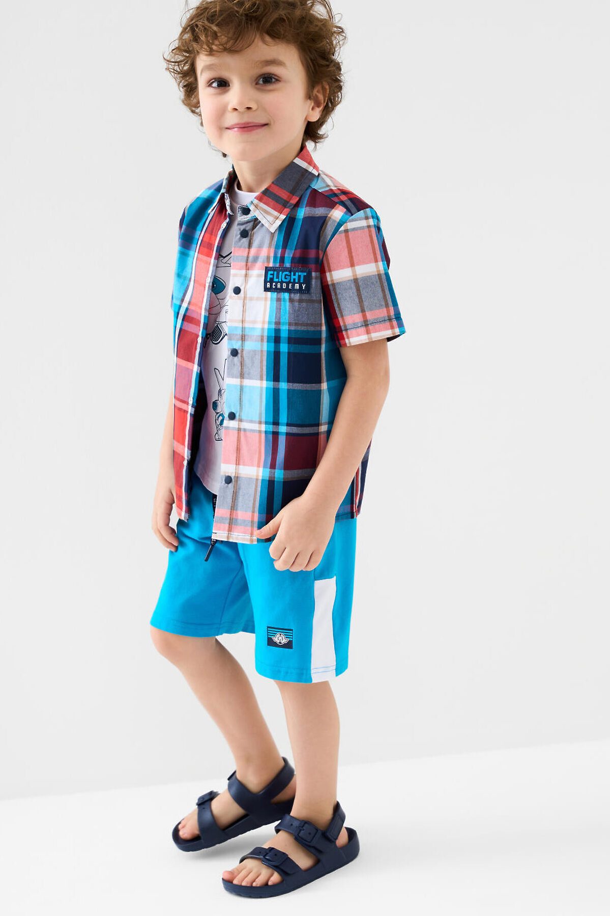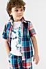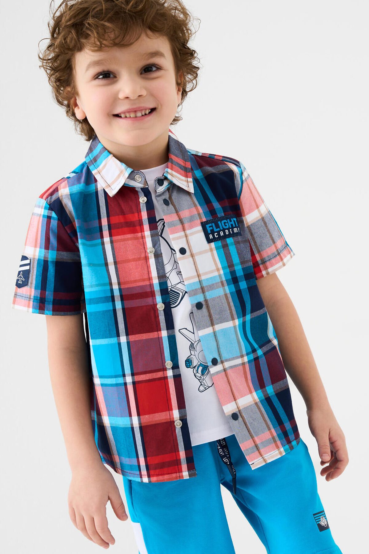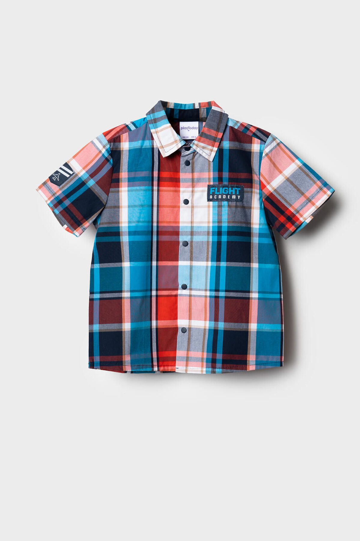 Детская рубашка в клетку для мальчика. Модель прямого кроя, с коротким рукавом. Выполнена из хлопковой ткани поплин. У изделия классический отложной воротник и удобная застежка на кнопки. На груди расположен яркий принт, а на правом рукаве — декоративная нашивка с изображением самолета.