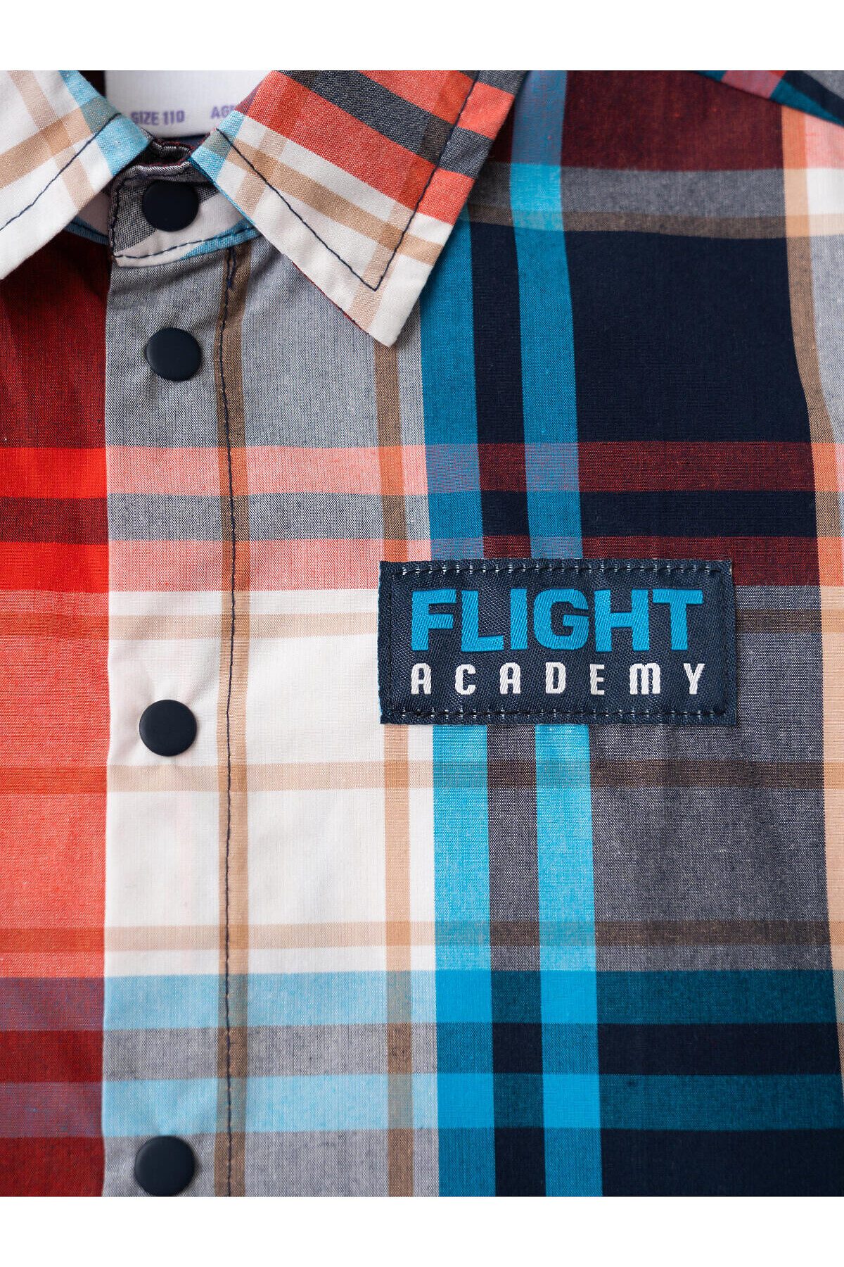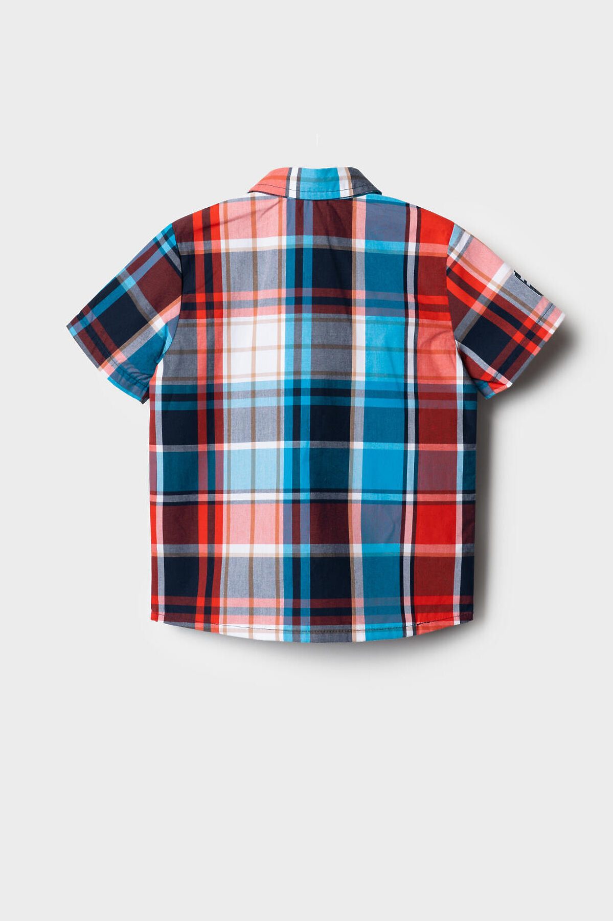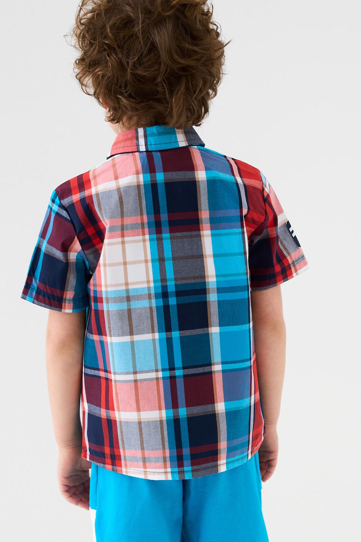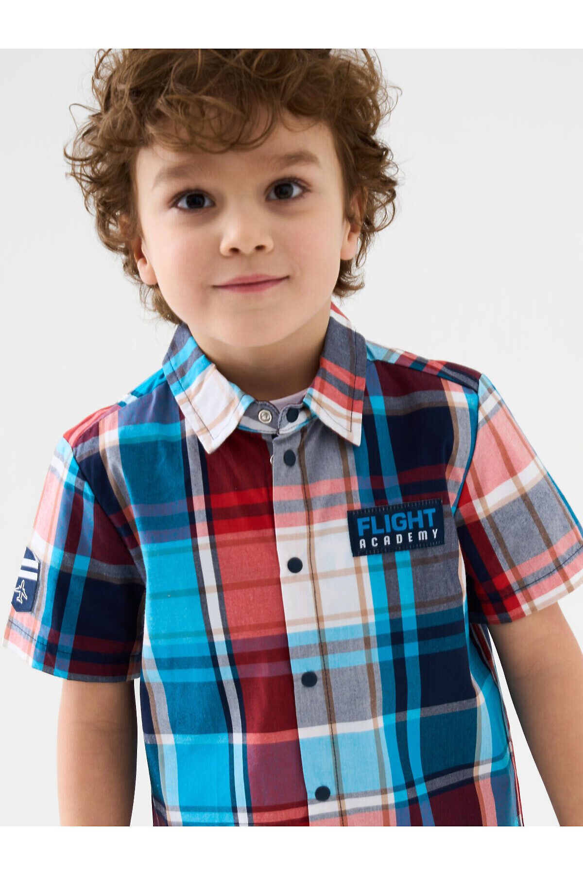 Детская рубашка в клетку для мальчика. Модель прямого кроя, с коротким рукавом. Выполнена из хлопковой ткани поплин. У изделия классический отложной воротник и удобная застежка на кнопки. На груди расположен яркий принт, а на правом рукаве — декоративная нашивка с изображением самолета.