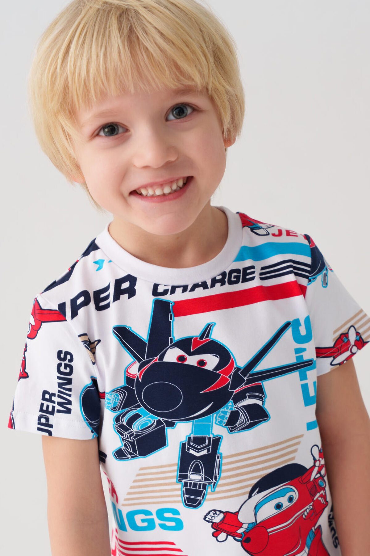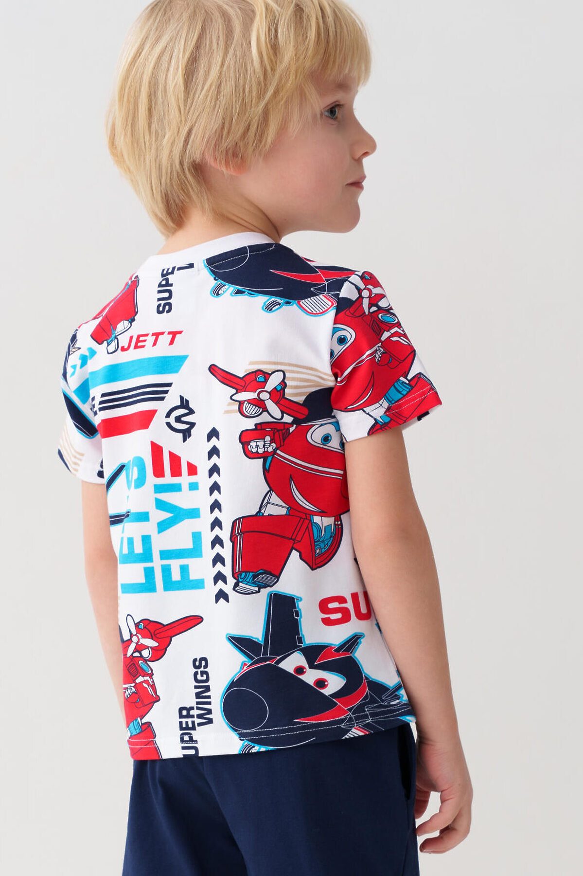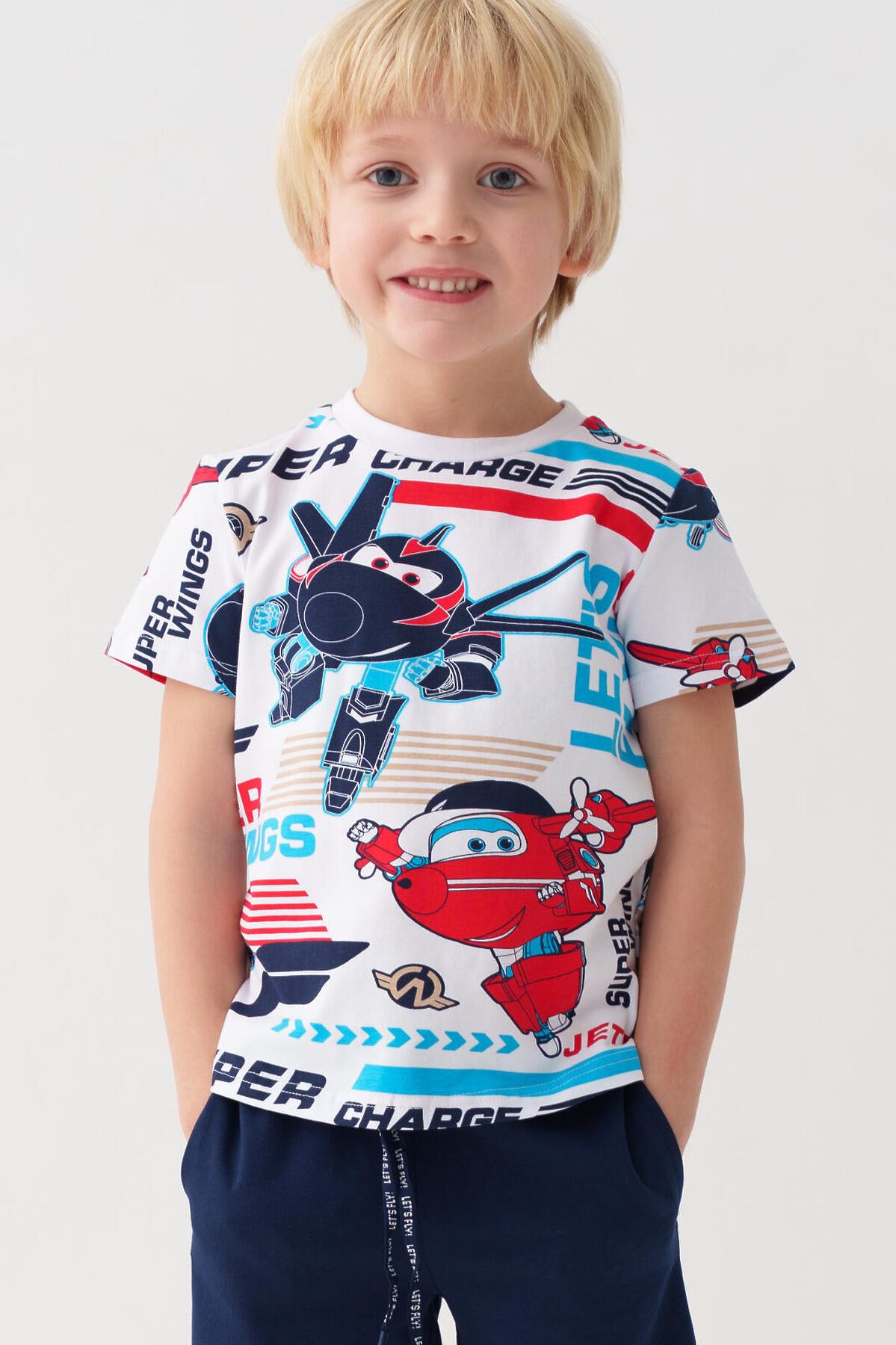 Детская футболка для мальчика. Модель прямого кроя, выполнена из эластичного хлопкового трикотажа джерси. Яркие принты с мультяшными героями "Super Wings". Горловина круглая, обработана эластичным рибом.