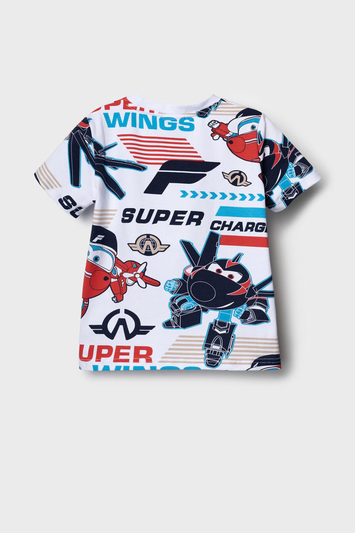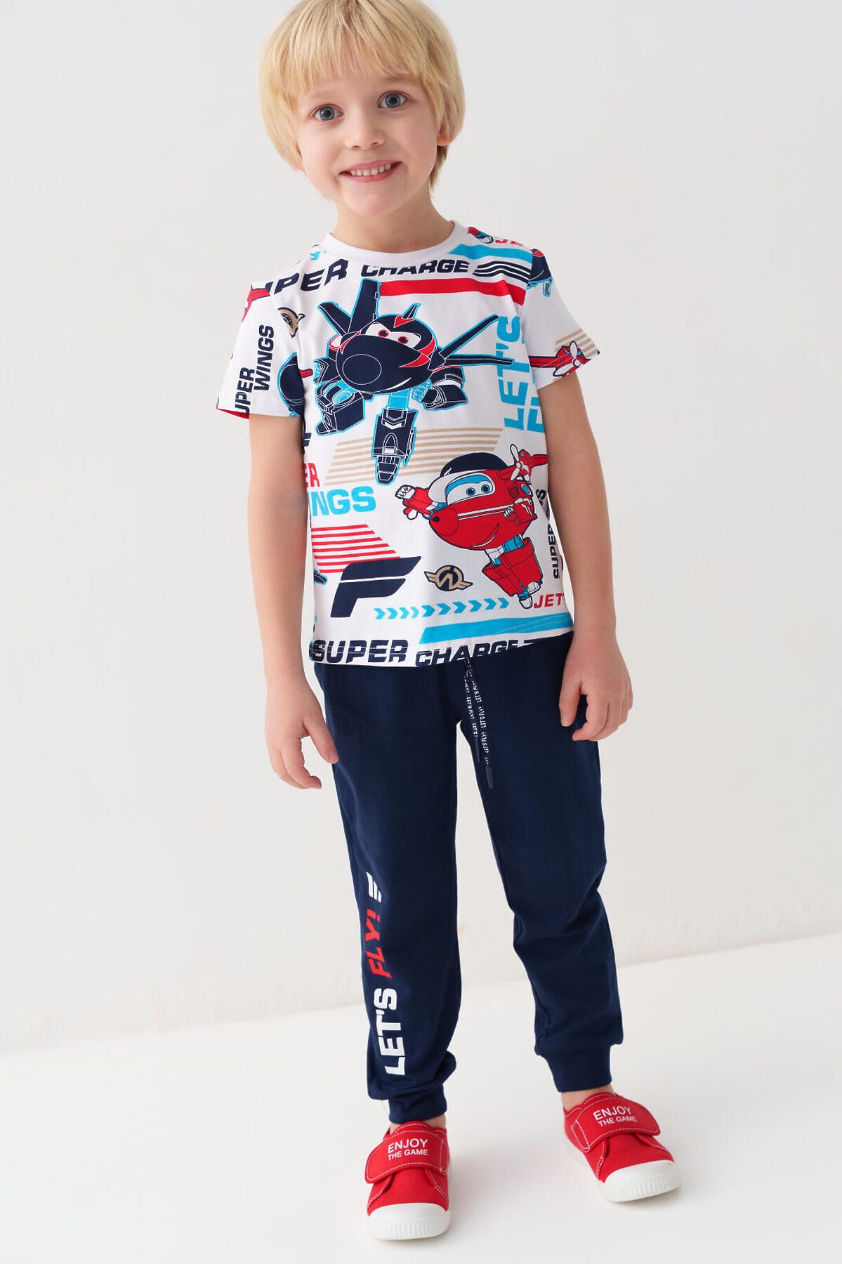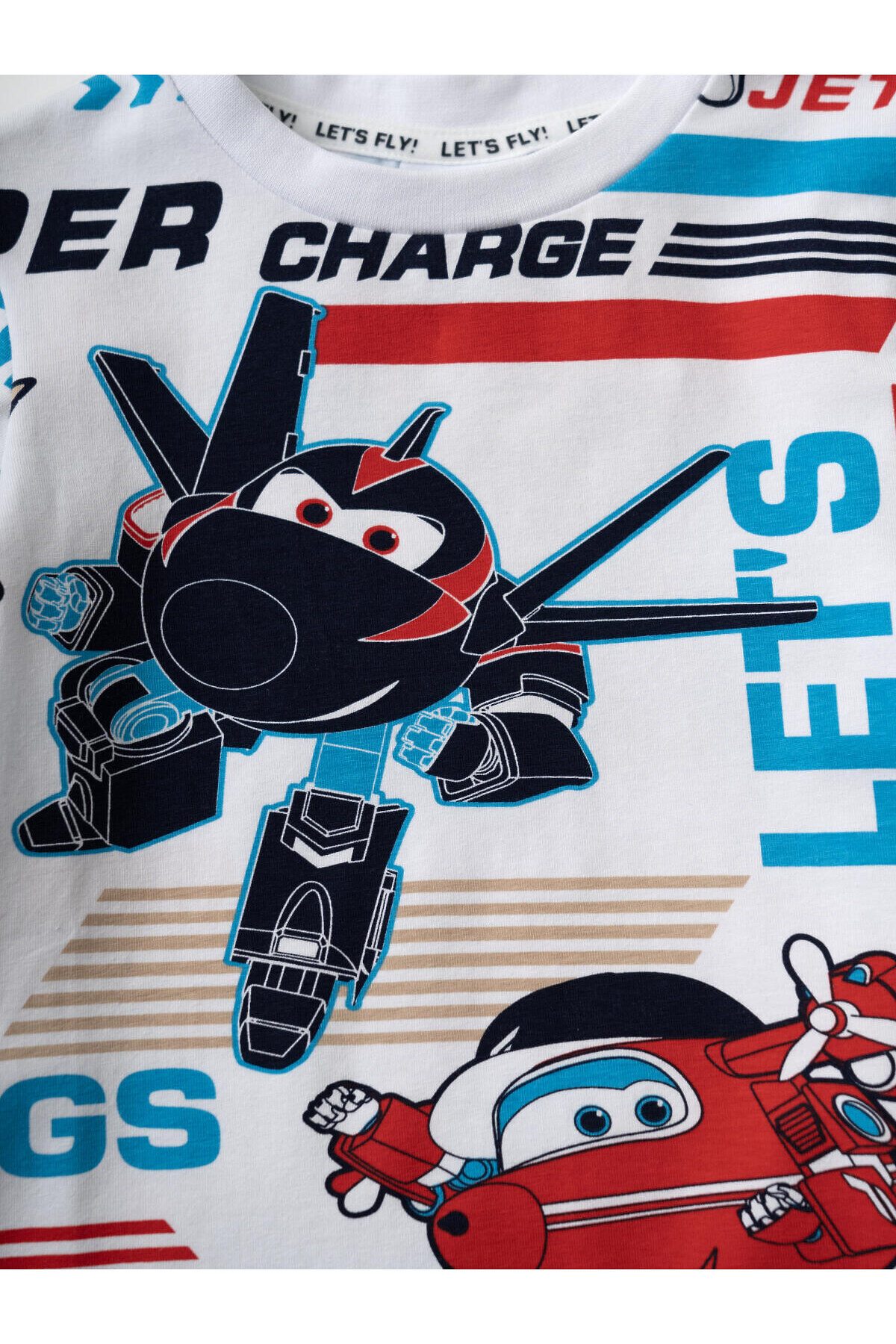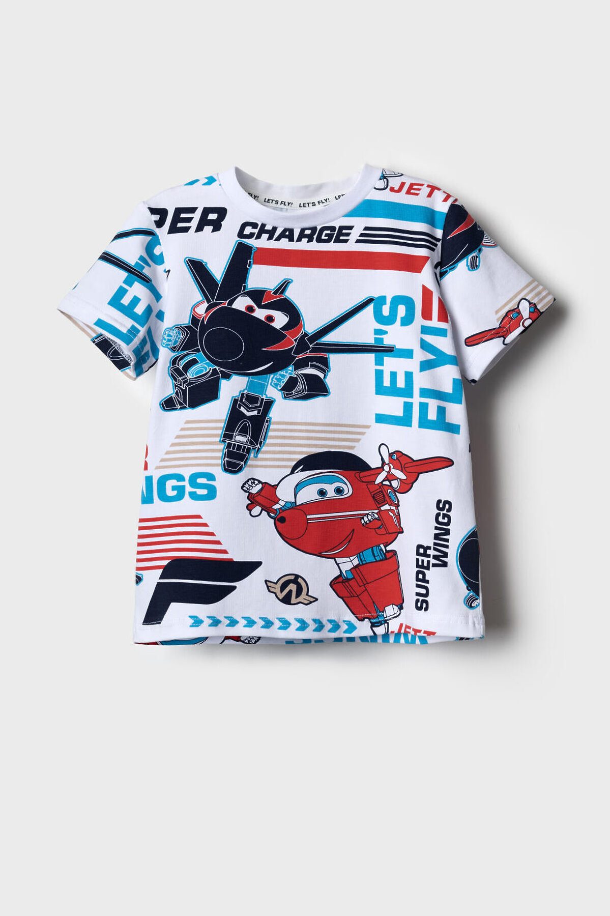 Детская футболка для мальчика. Модель прямого кроя, выполнена из эластичного хлопкового трикотажа джерси. Яркие принты с мультяшными героями "Super Wings". Горловина круглая, обработана эластичным рибом.