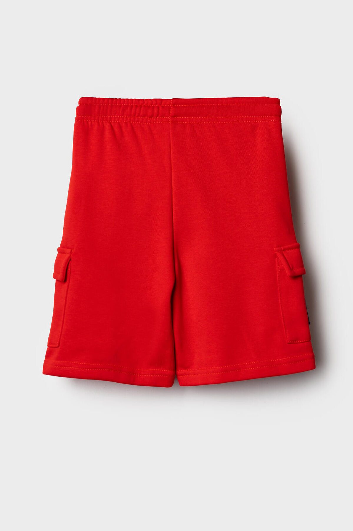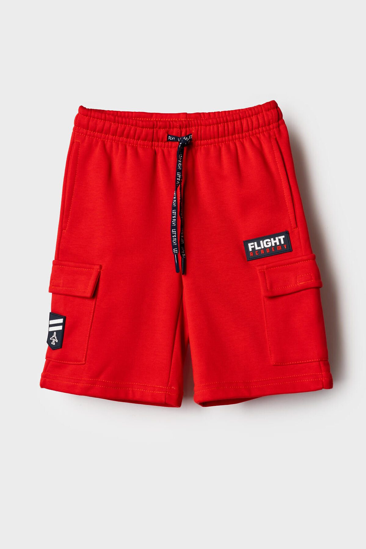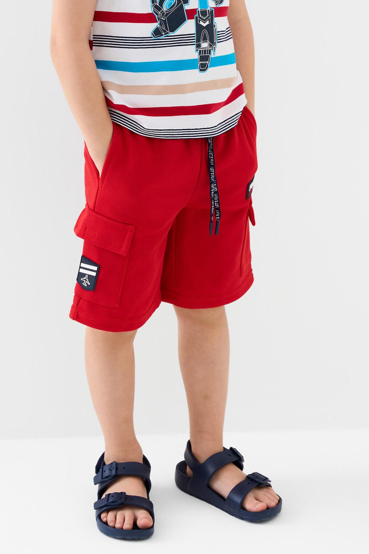 Шорты детские для мальчика. Модель свободного кроя из мягкого, хлопкового трикотажа футер. Удобная посадка обеспечивается эластичным поясом со шнуром. Спереди — декоративные нашивки, боковые карманы и накладные карманы-карго.