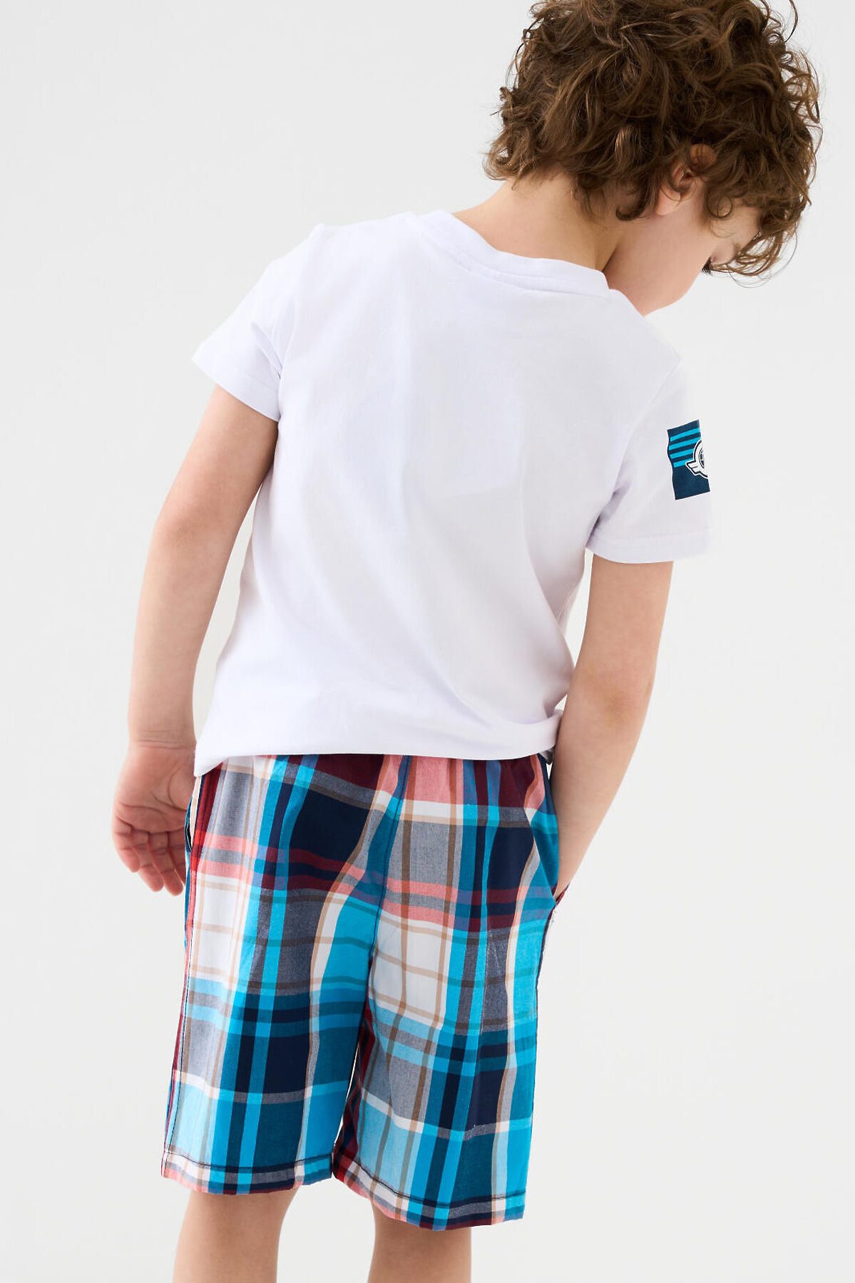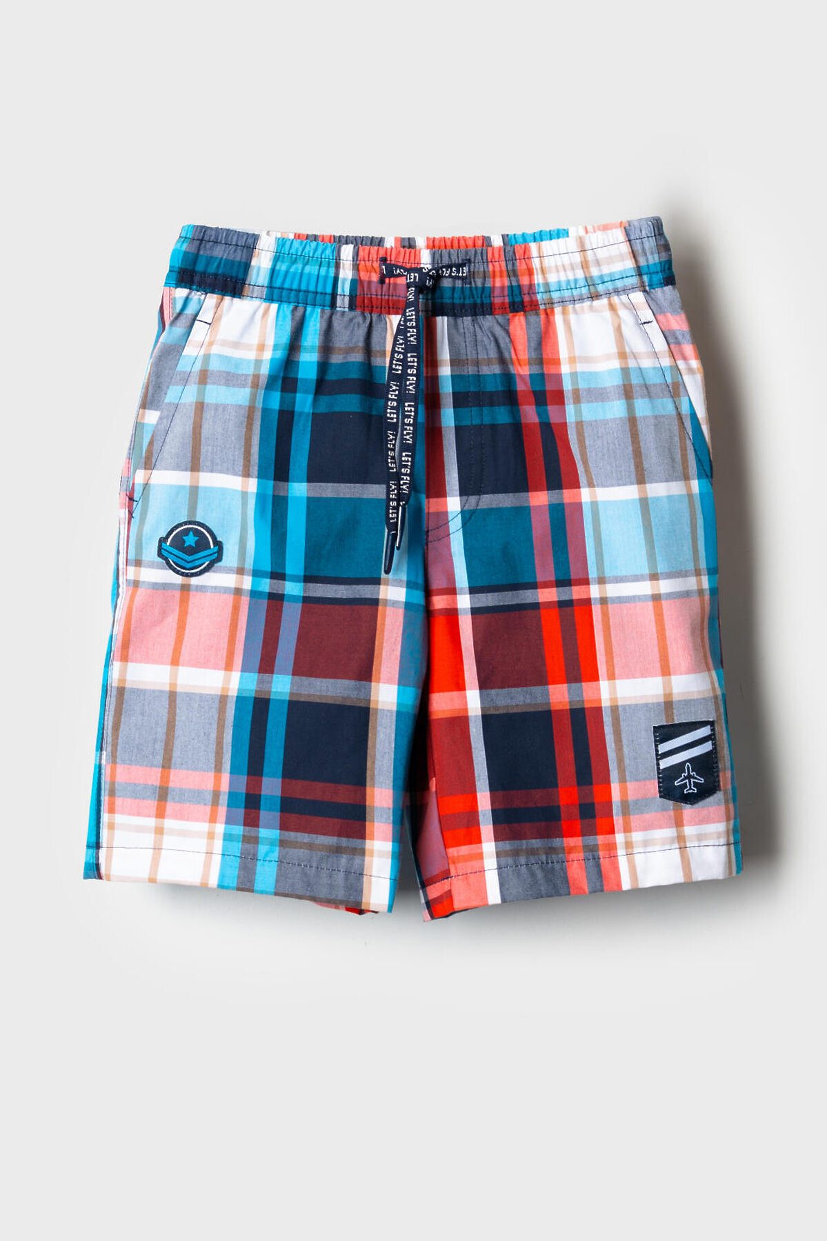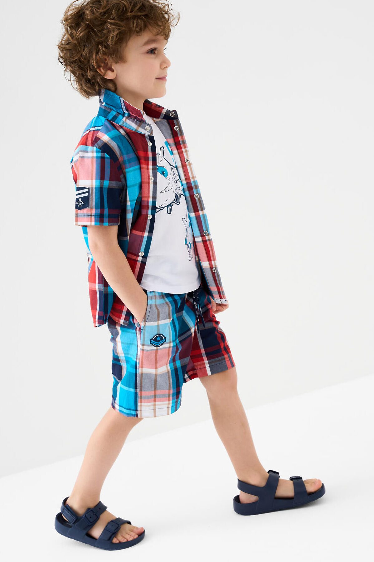 Детские шорты для мальчика. Модель прямого кроя из дышащего, хлопкового поплина. Удобная посадка обеспечивается эластичным поясом со шнуром. Спереди — боковые карманы и декоративные нашивки.