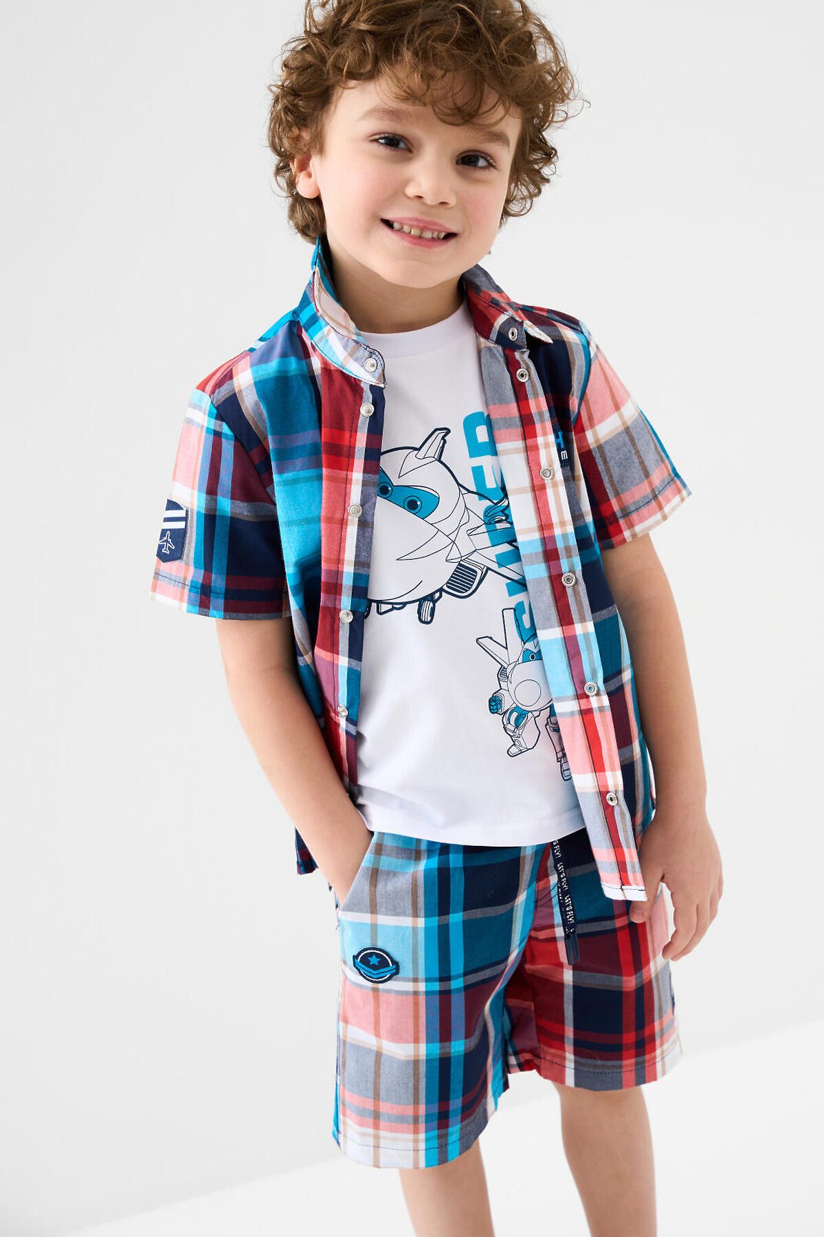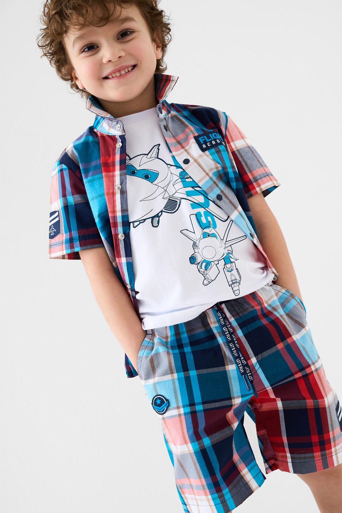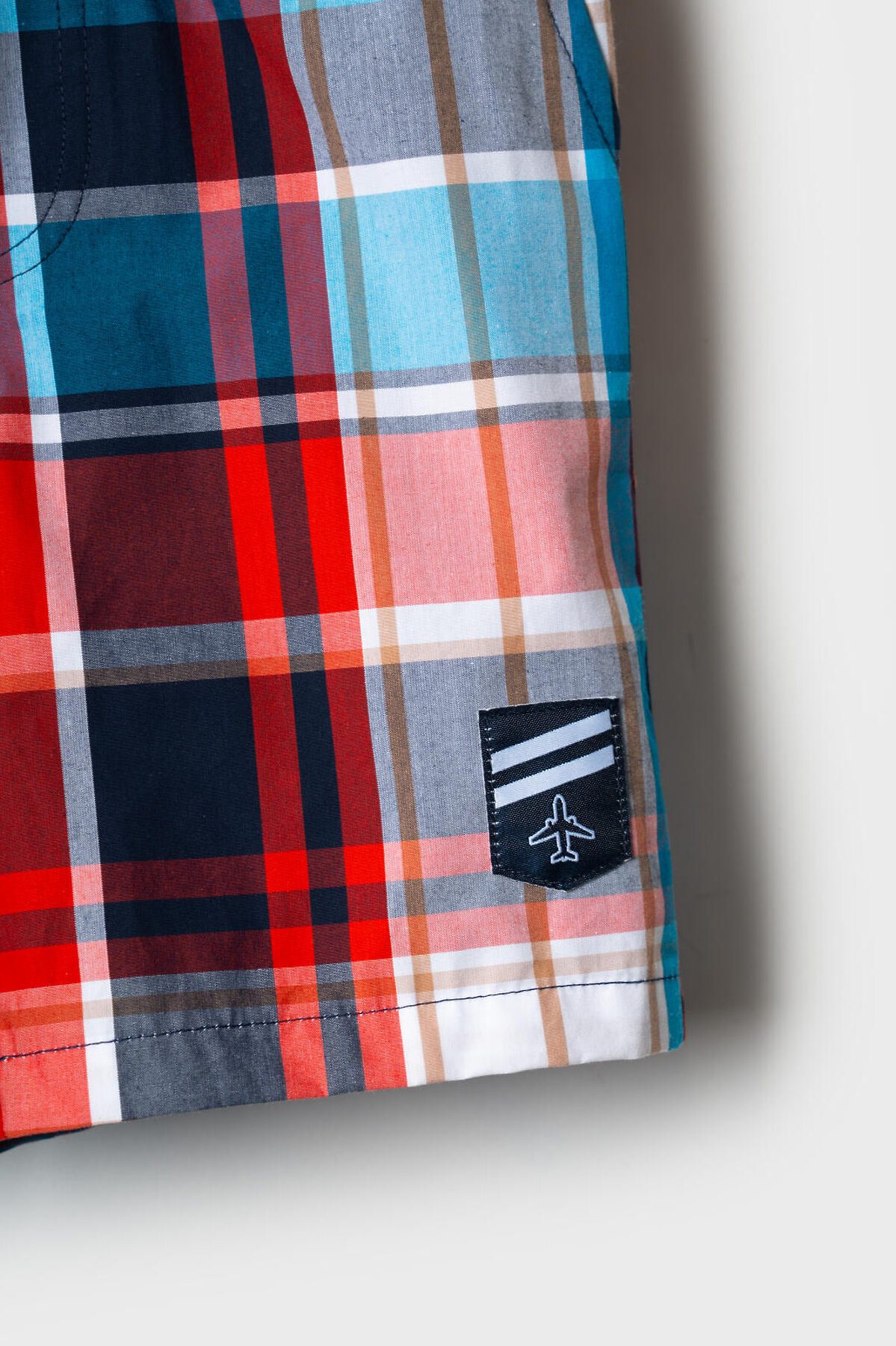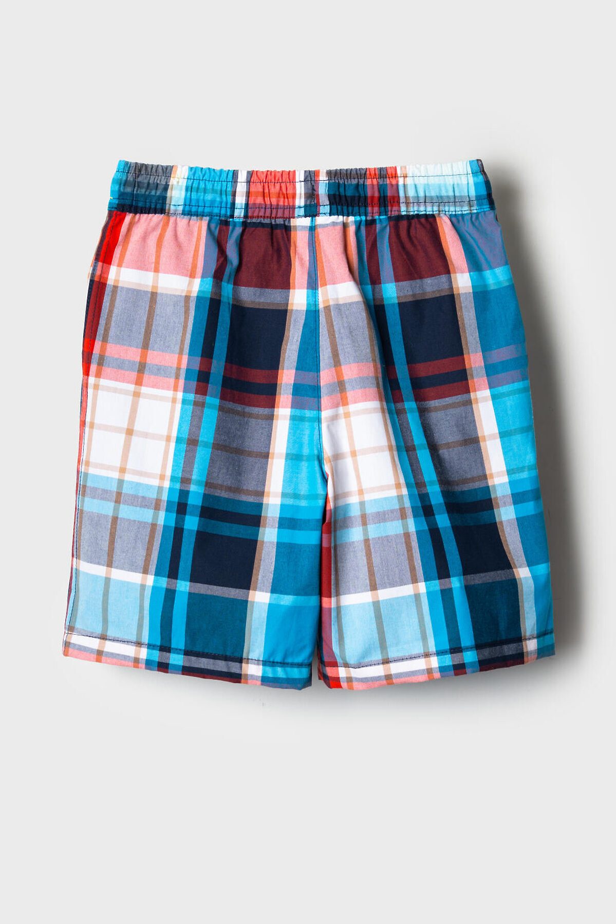 Детские шорты для мальчика. Модель прямого кроя из дышащего, хлопкового поплина. Удобная посадка обеспечивается эластичным поясом со шнуром. Спереди — боковые карманы и декоративные нашивки.