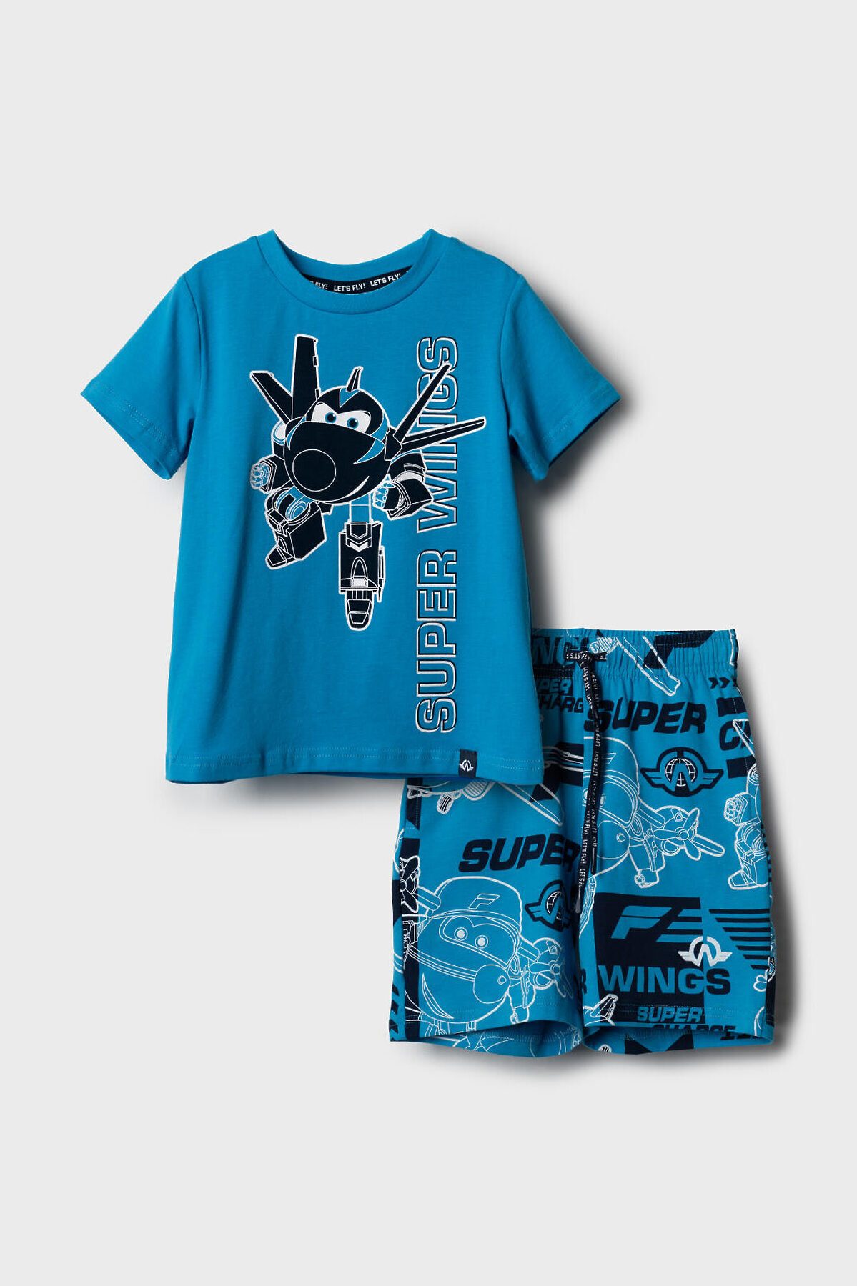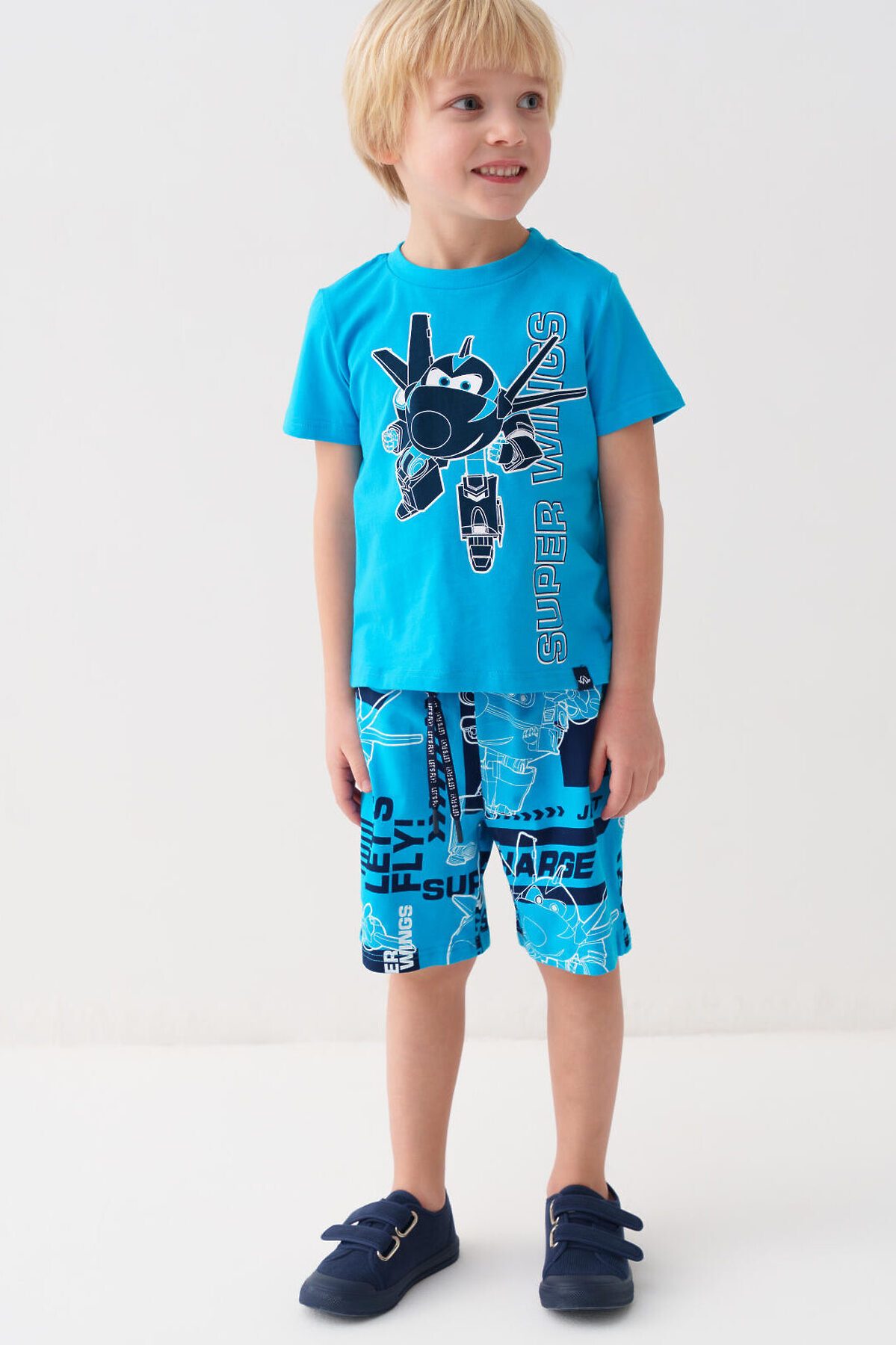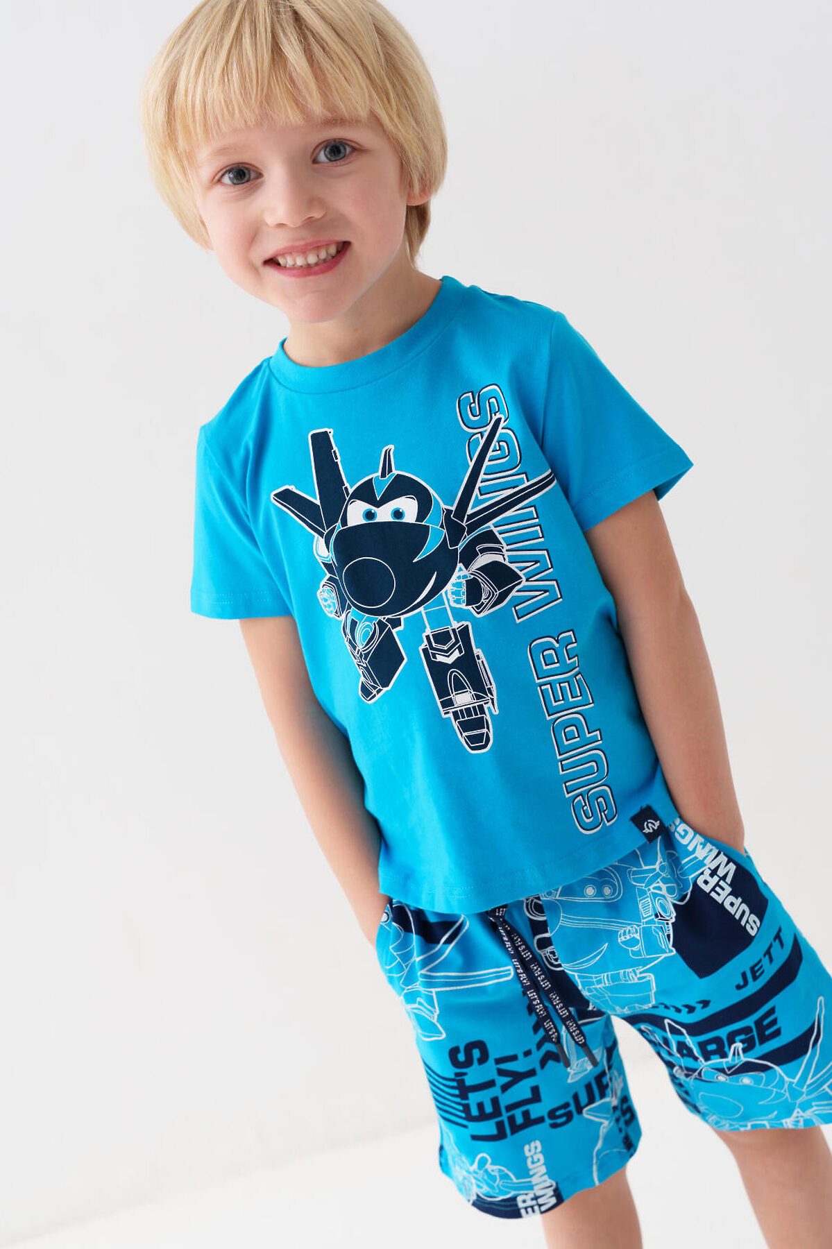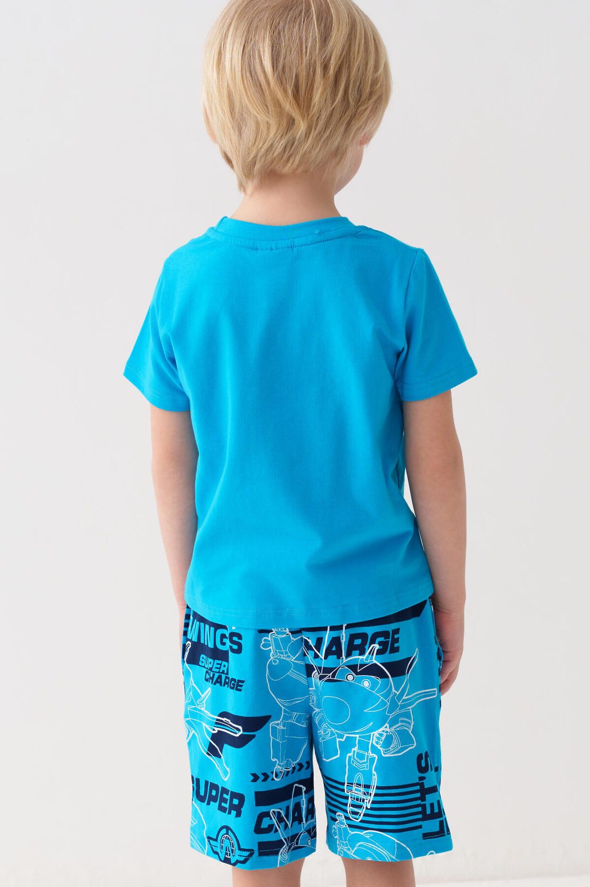 Детский костюм для мальчика. Состоит из футболки и шорт. Выполнен из хлопкового трикотажа джерси. Футболка прямого кроя, с коротким рукавом. Яркий принт и нашивка с любимыми персонажами "Super Wings". Шорты свободные, с эластичным поясом и шнурком для регулировки посадки. По бокам расположены карманы.
