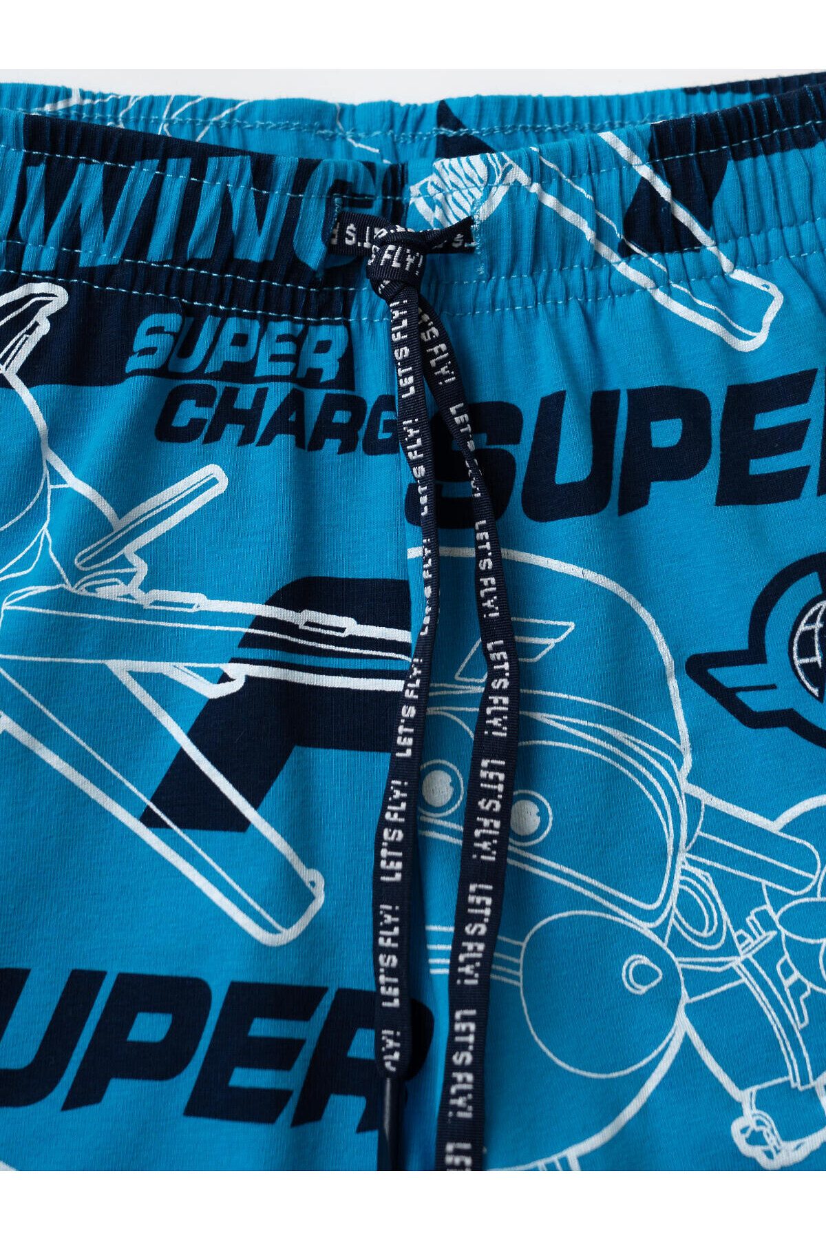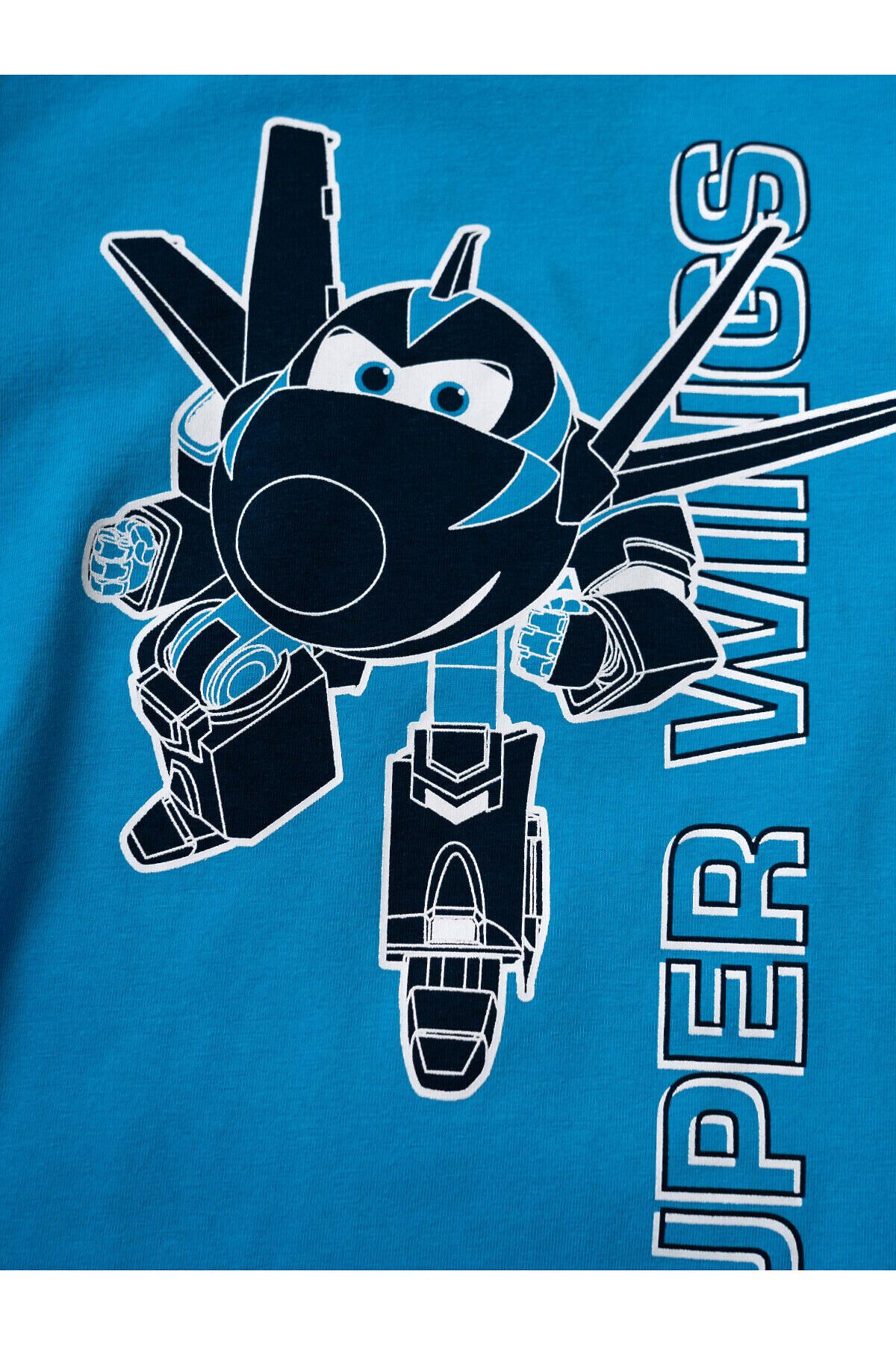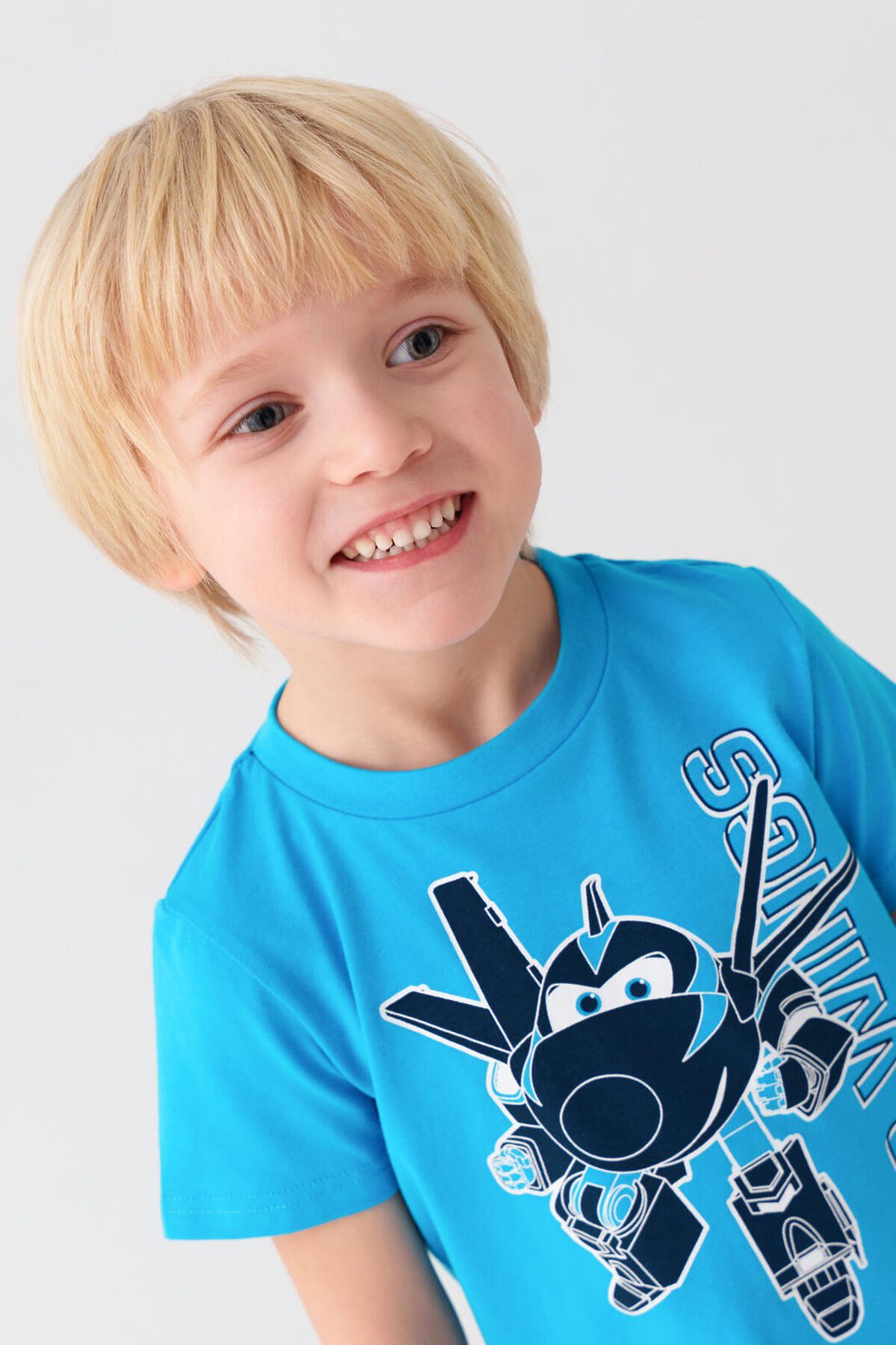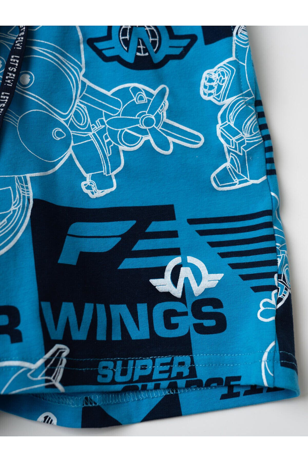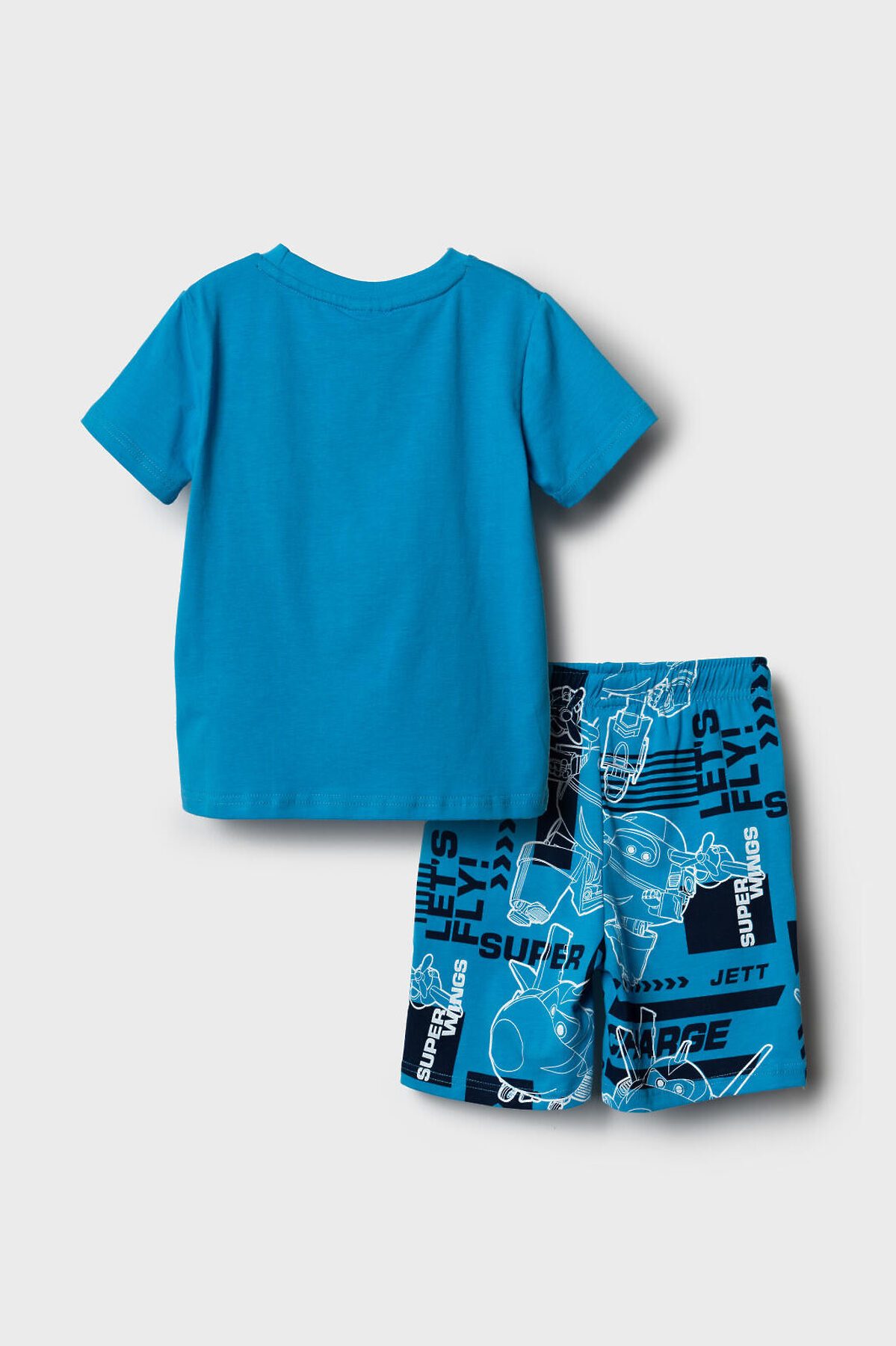 Детский костюм для мальчика. Состоит из футболки и шорт. Выполнен из хлопкового трикотажа джерси. Футболка прямого кроя, с коротким рукавом. Яркий принт и нашивка с любимыми персонажами "Super Wings". Шорты свободные, с эластичным поясом и шнурком для регулировки посадки. По бокам расположены карманы.