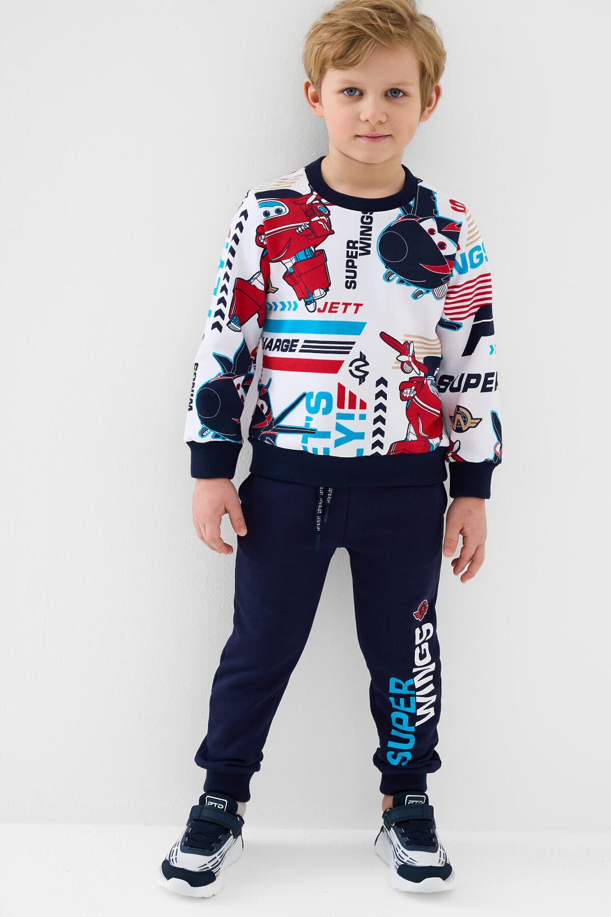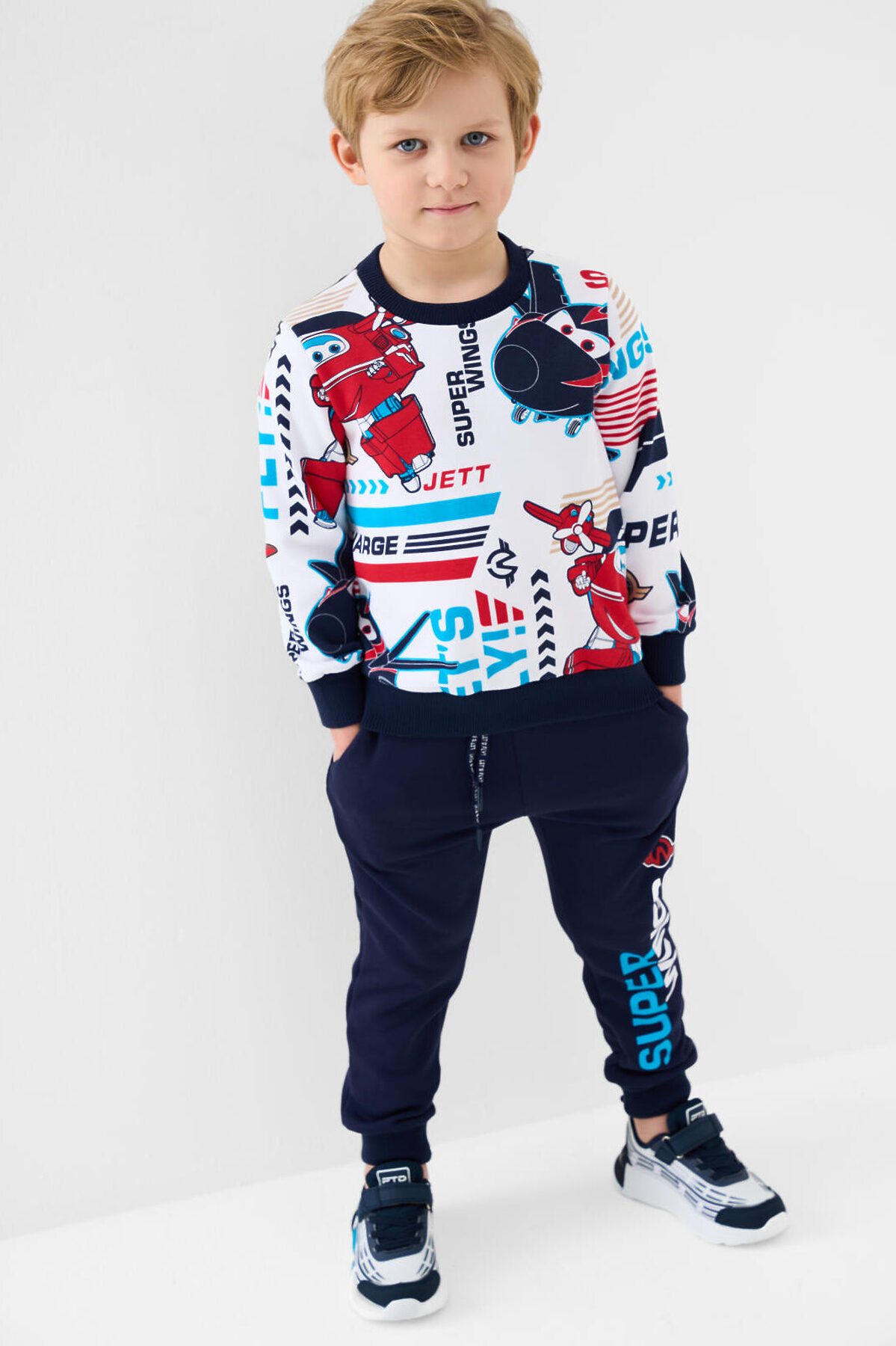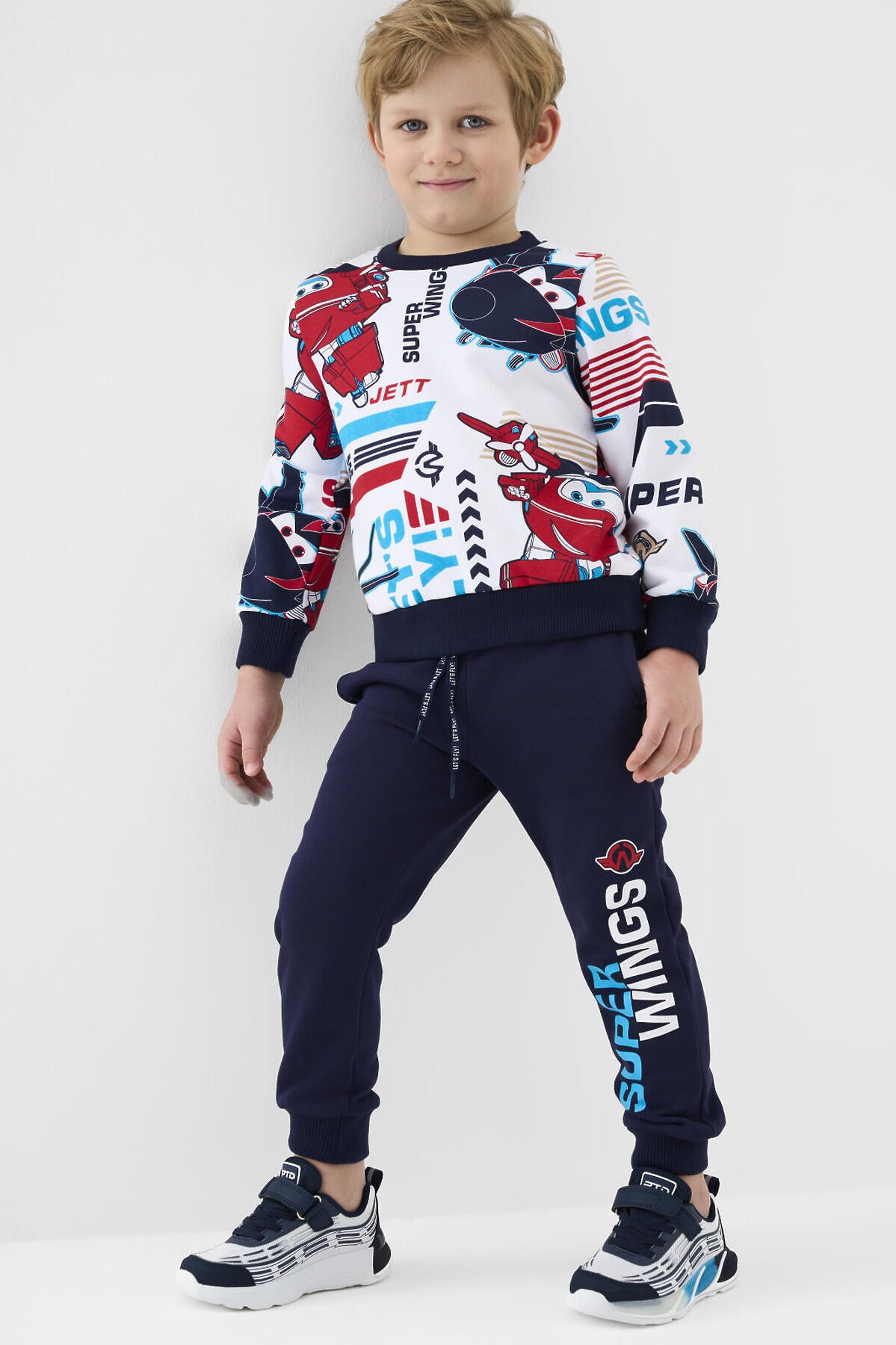 Детский спортивный костюм для мальчика. Комплект выполнен из хлопкового футера и состоит из свитшота и джогеров на резинке. Толстовка прямого кроя с красочным принтом "Super Wings". Манжеты и пояс выполнены из эластичного риба, благодаря чему изделие хорошо держит форму. Брюки джоггеры — комфортные, с эластичным поясом и шнуром для регулировки посадки. Удобные боковые карманы. Низ штанин собран на резинку.