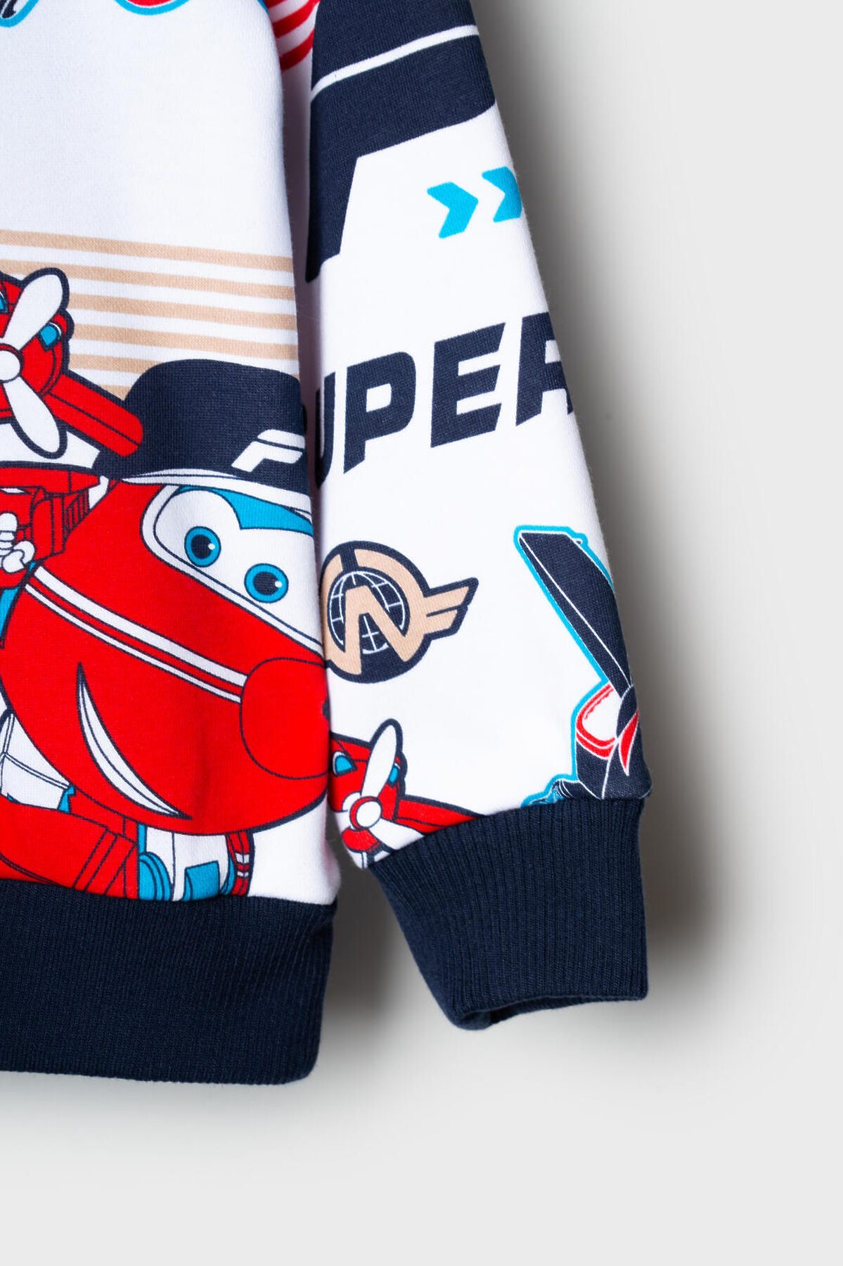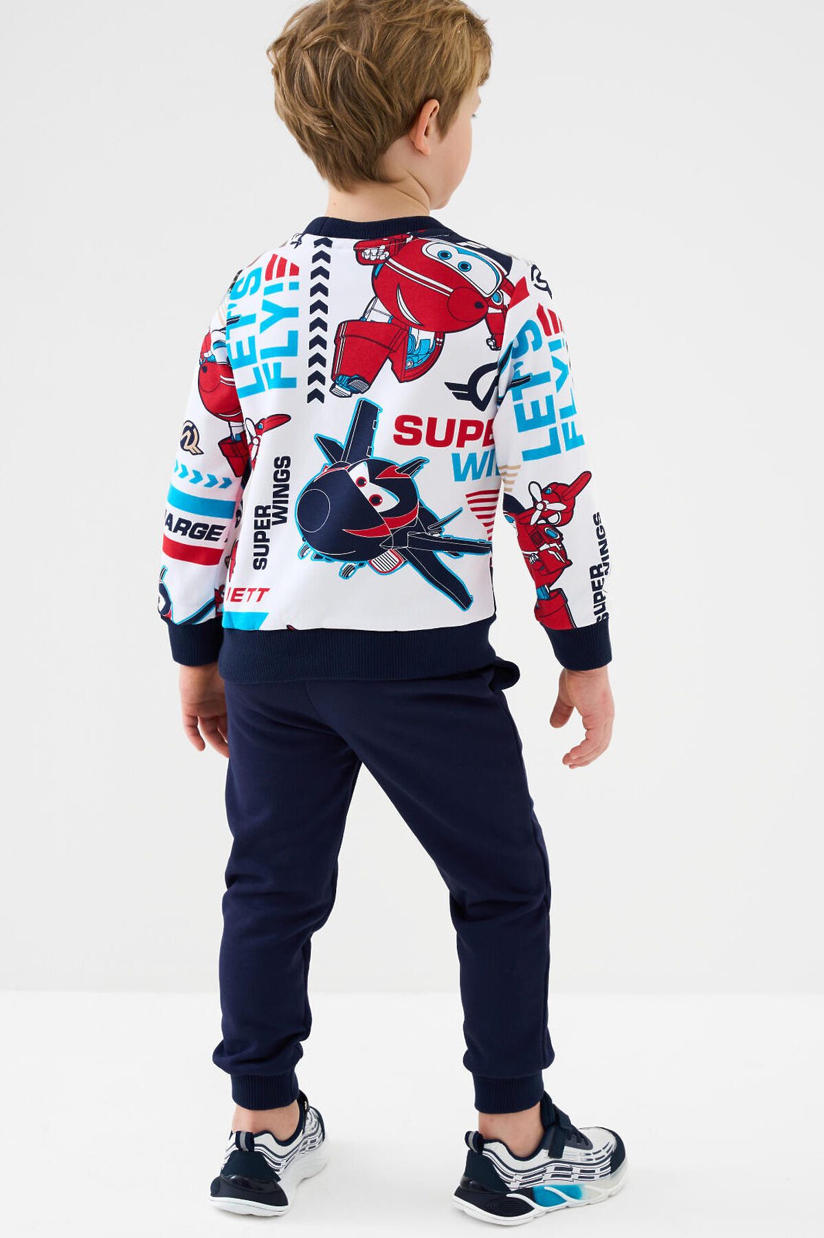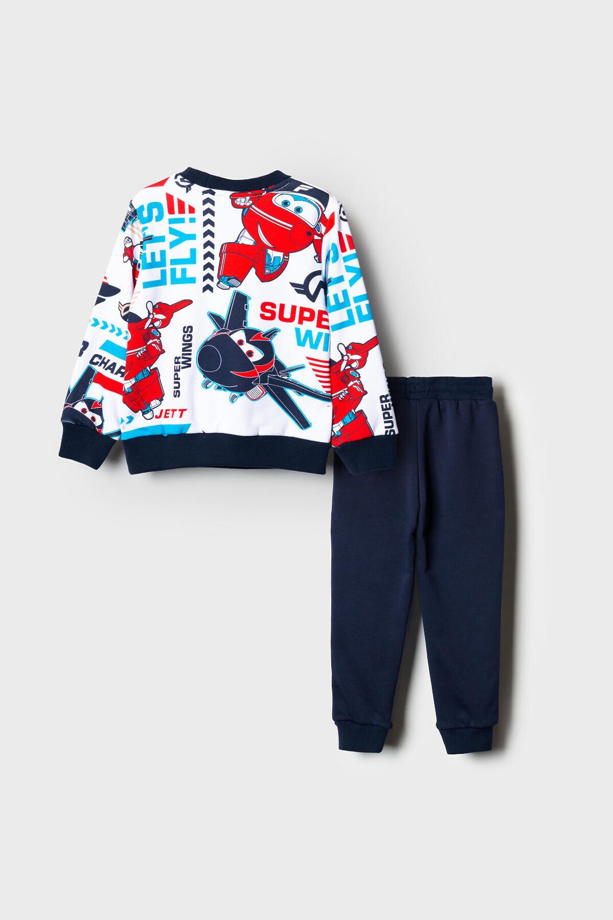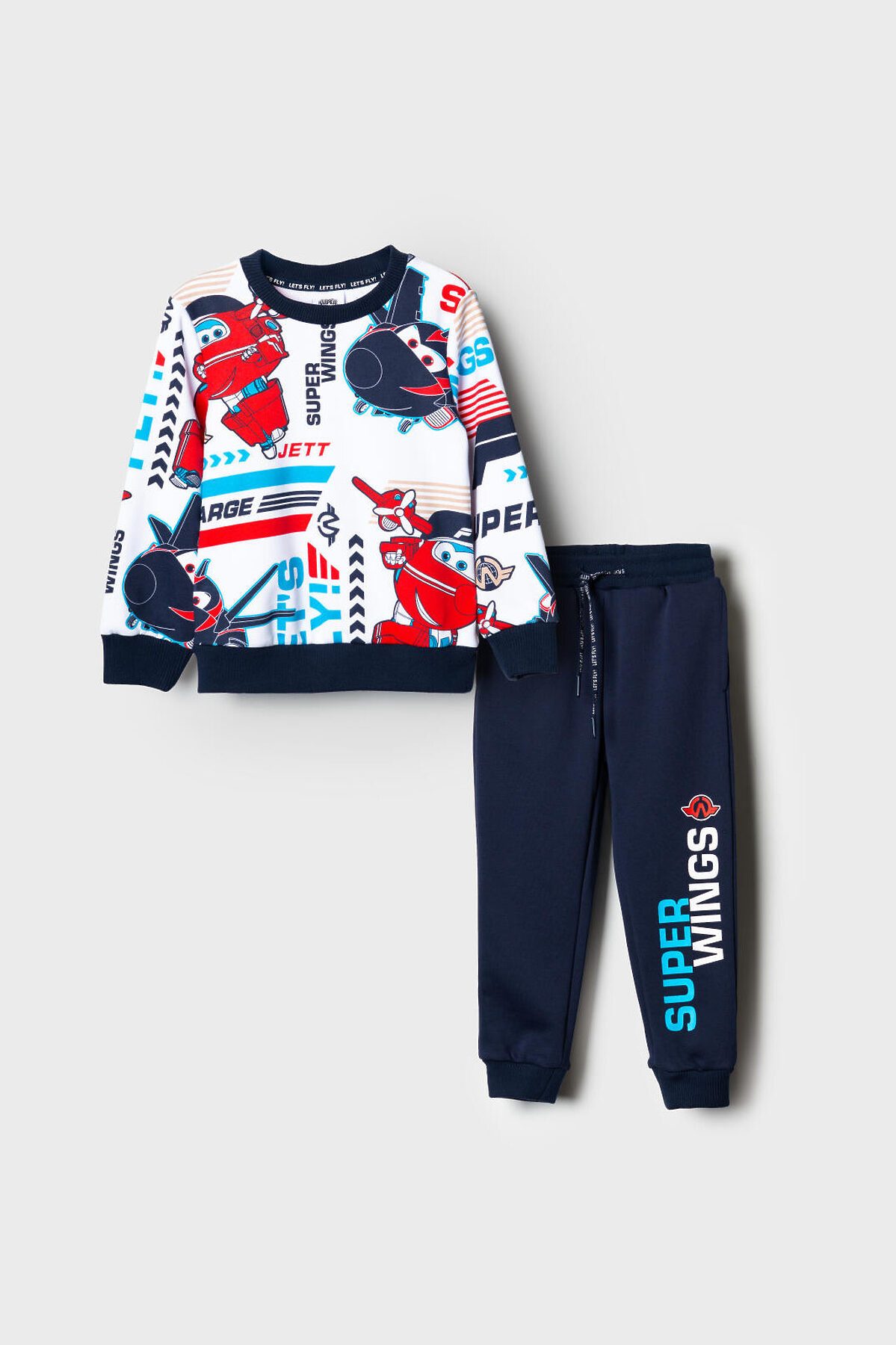 Детский спортивный костюм для мальчика. Комплект выполнен из хлопкового футера и состоит из свитшота и джогеров на резинке. Толстовка прямого кроя с красочным принтом "Super Wings". Манжеты и пояс выполнены из эластичного риба, благодаря чему изделие хорошо держит форму. Брюки джоггеры — комфортные, с эластичным поясом и шнуром для регулировки посадки. Удобные боковые карманы. Низ штанин собран на резинку.