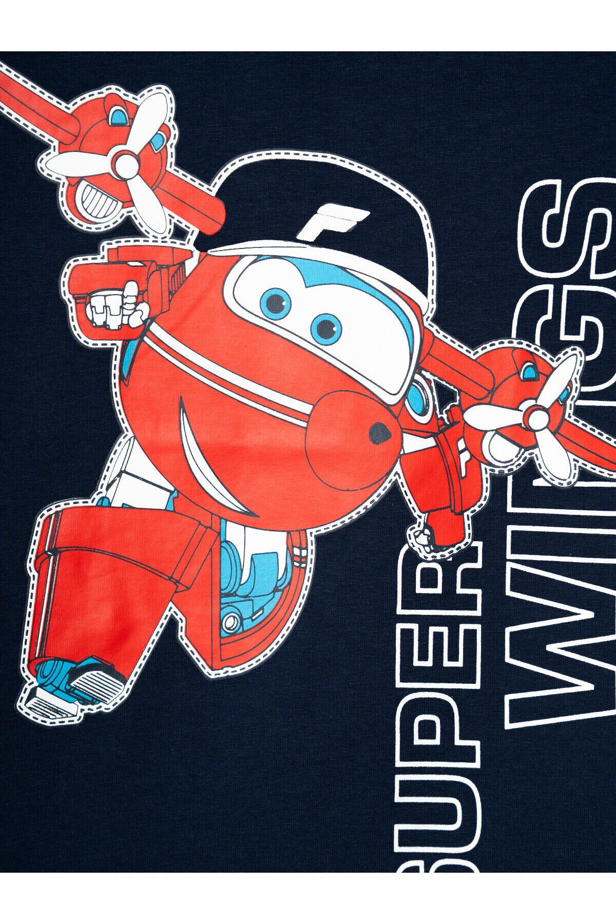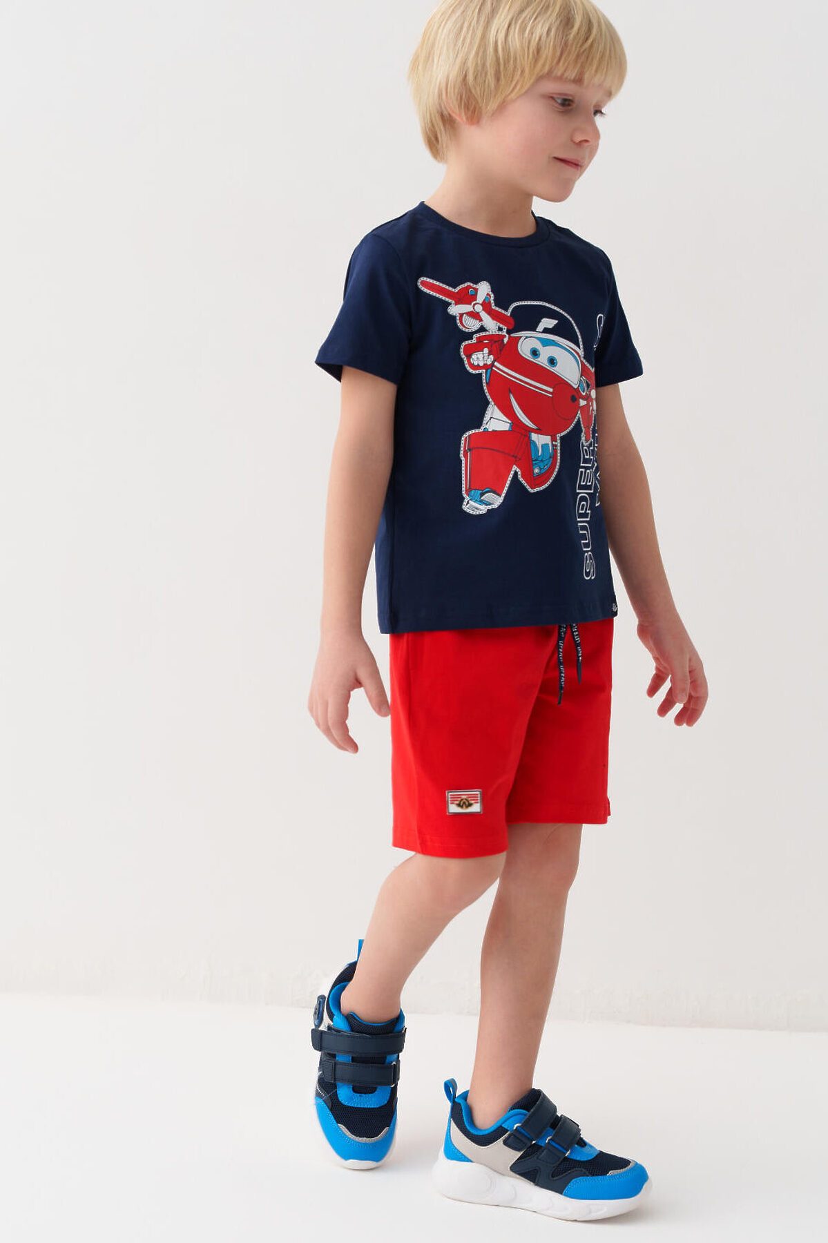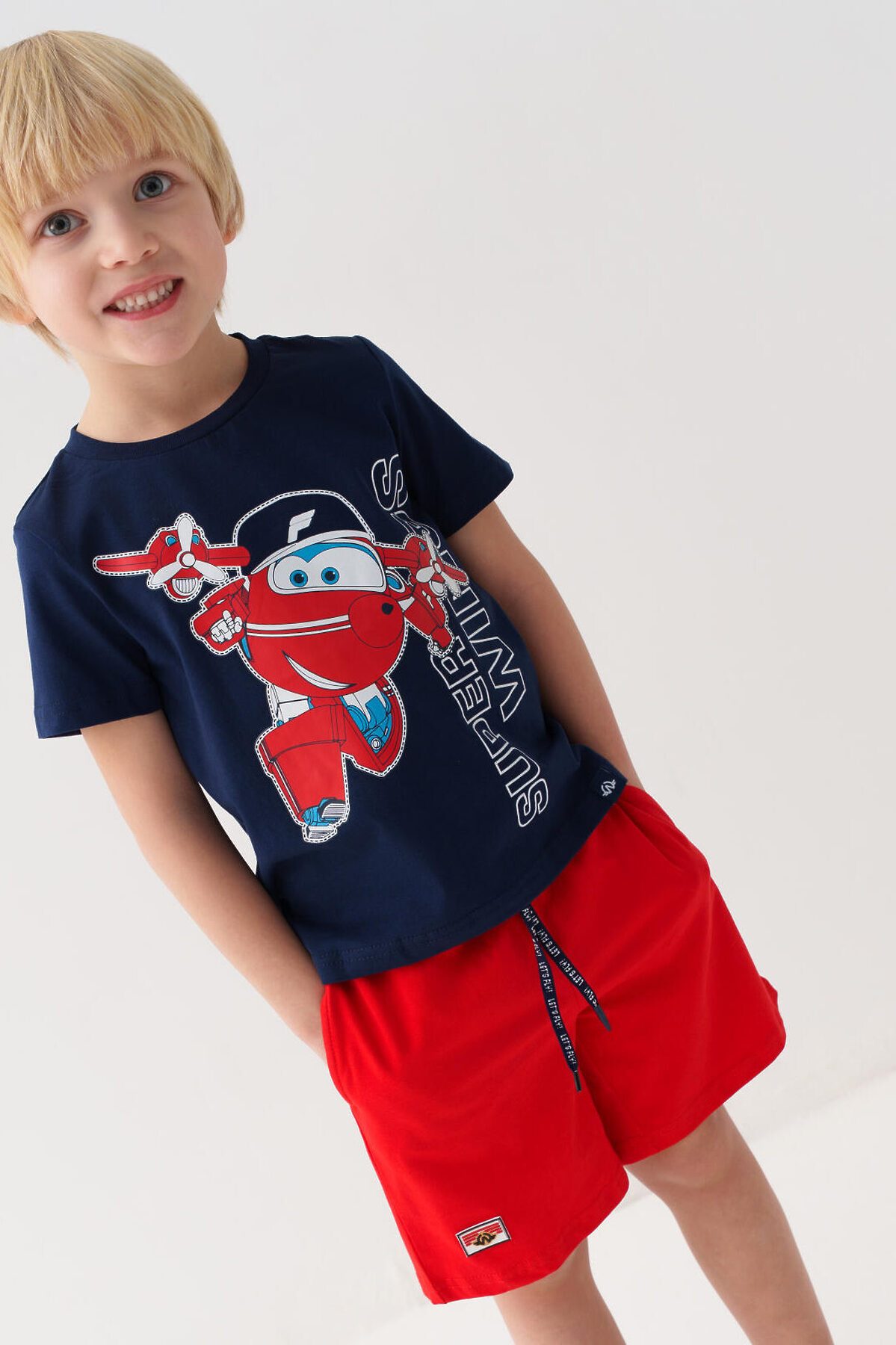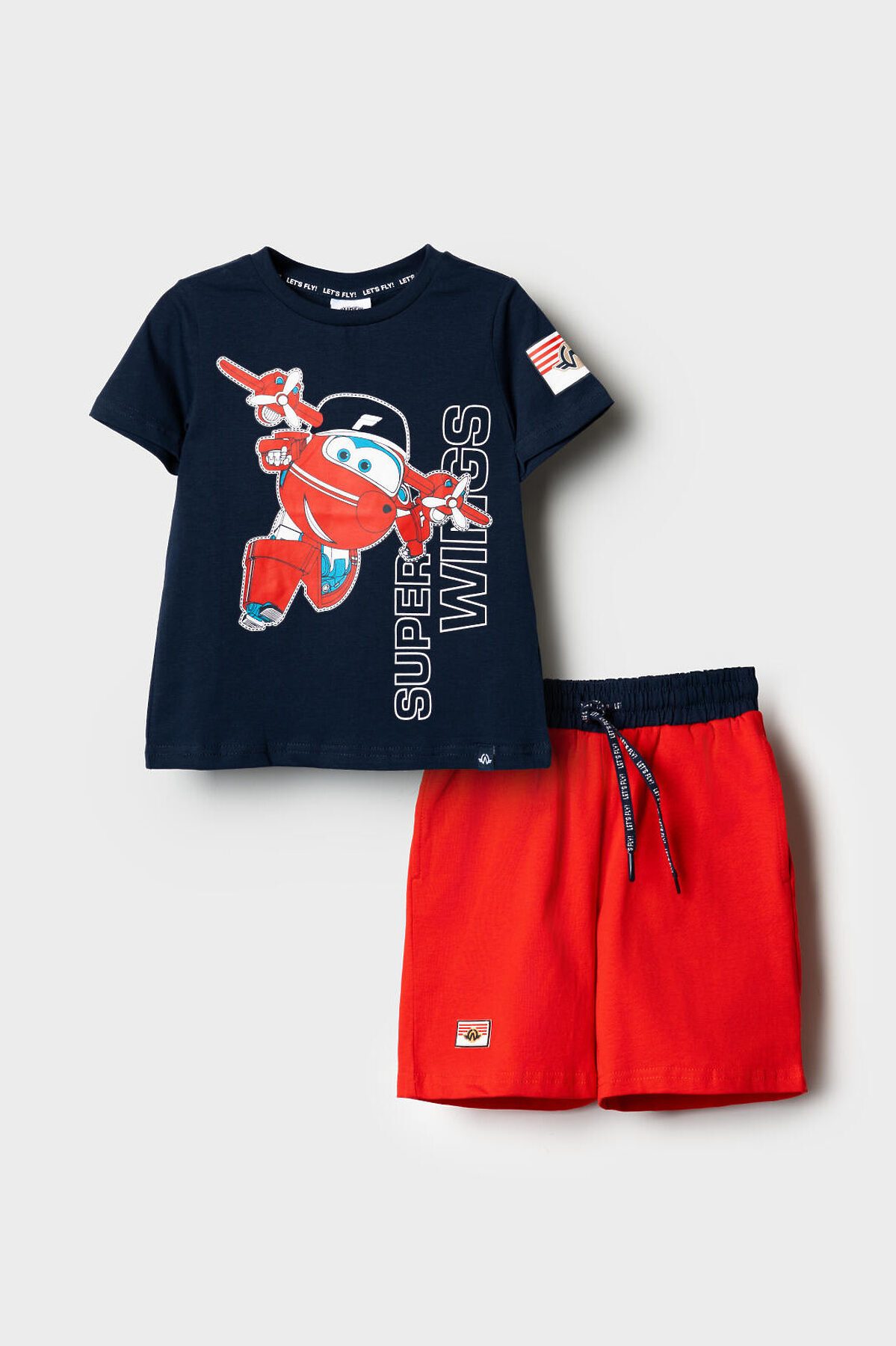 Детский костюм для мальчика. Состоит из футболки и шорт. Выполнен из хлопкового трикотажа. Футболка прямого кроя, с коротким рукавом. Яркий принт и нашивки с любимыми персонажами "Super Wings". Шорты свободные, с эластичным поясом и шнурком для регулировки посадки. По бокам расположены карманы.