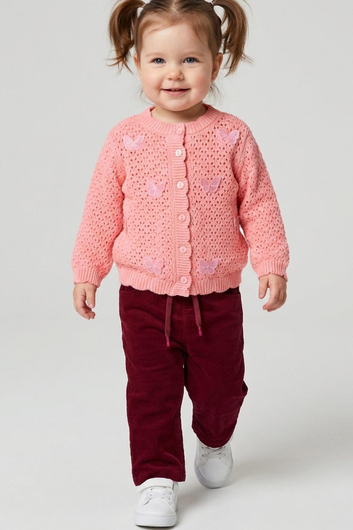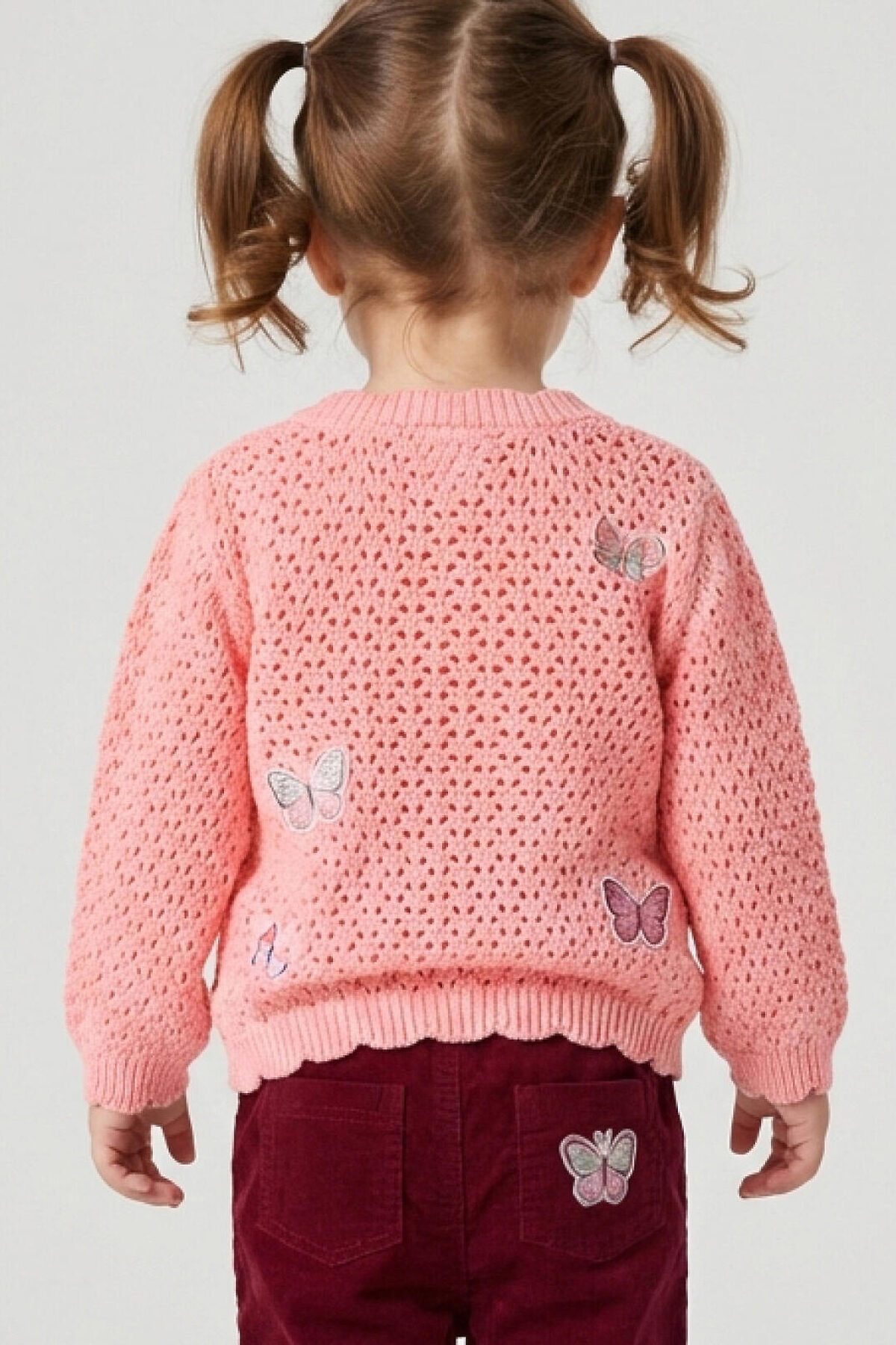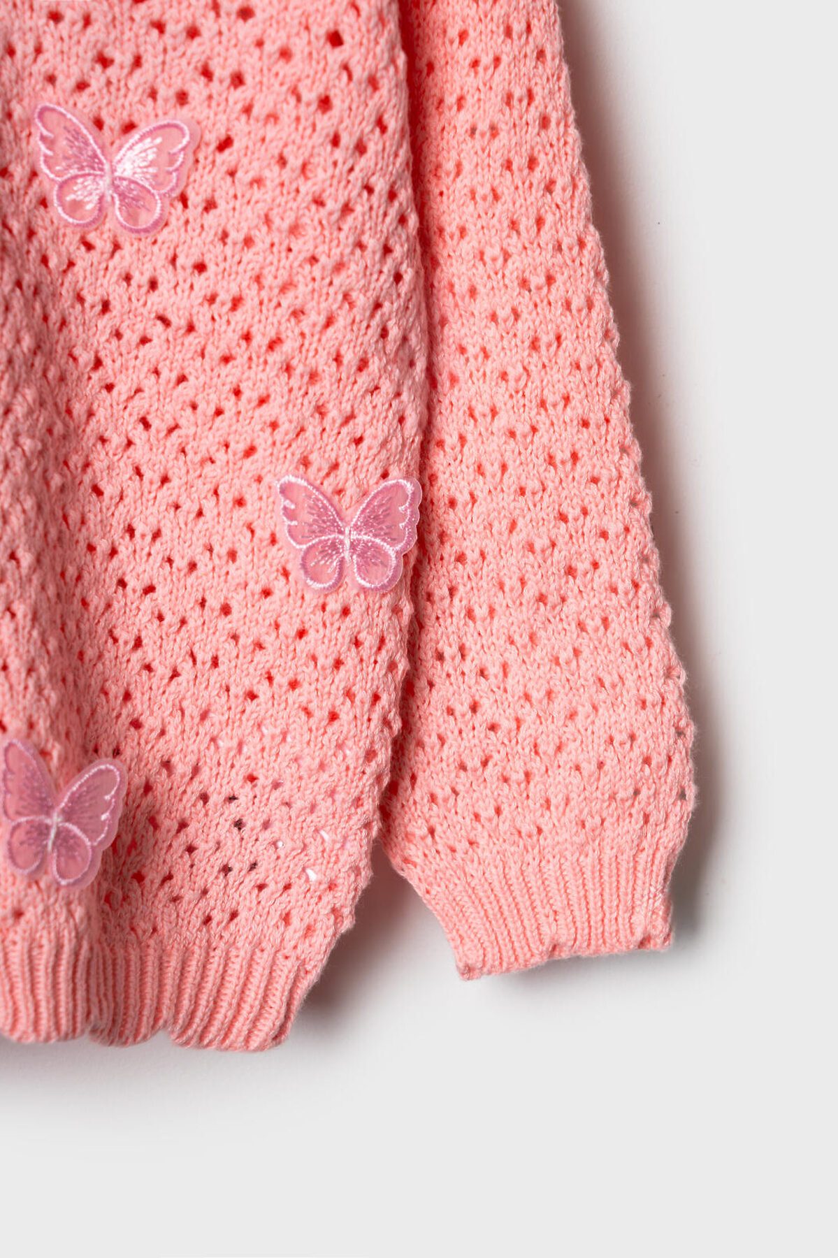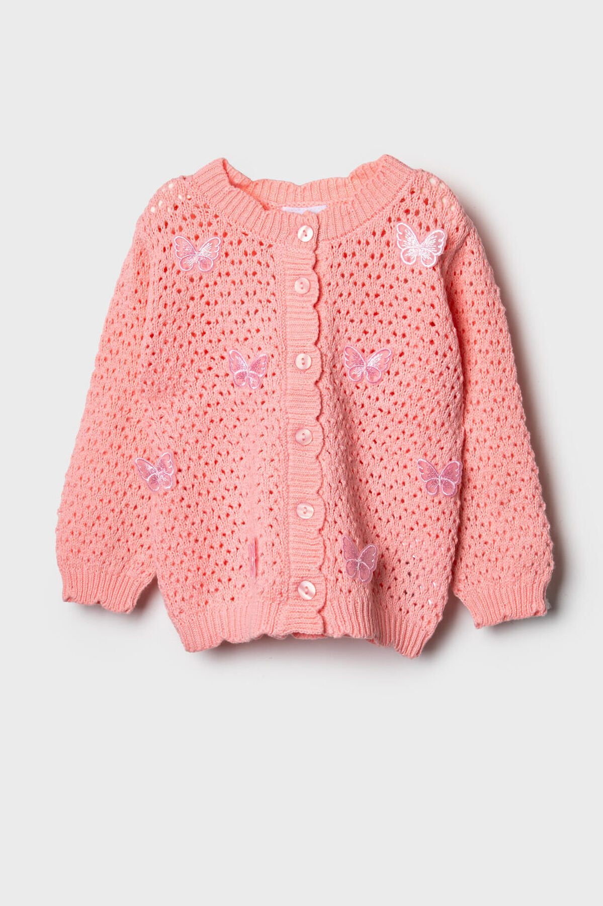 Детский кардиган для девочки. Модель из мягкого, вязаного трикотажа. Круглая горловина, длинные рукава и аккуратная застежка на пуговицах спереди. Основной акцент – декоративные вязаные бабочки.