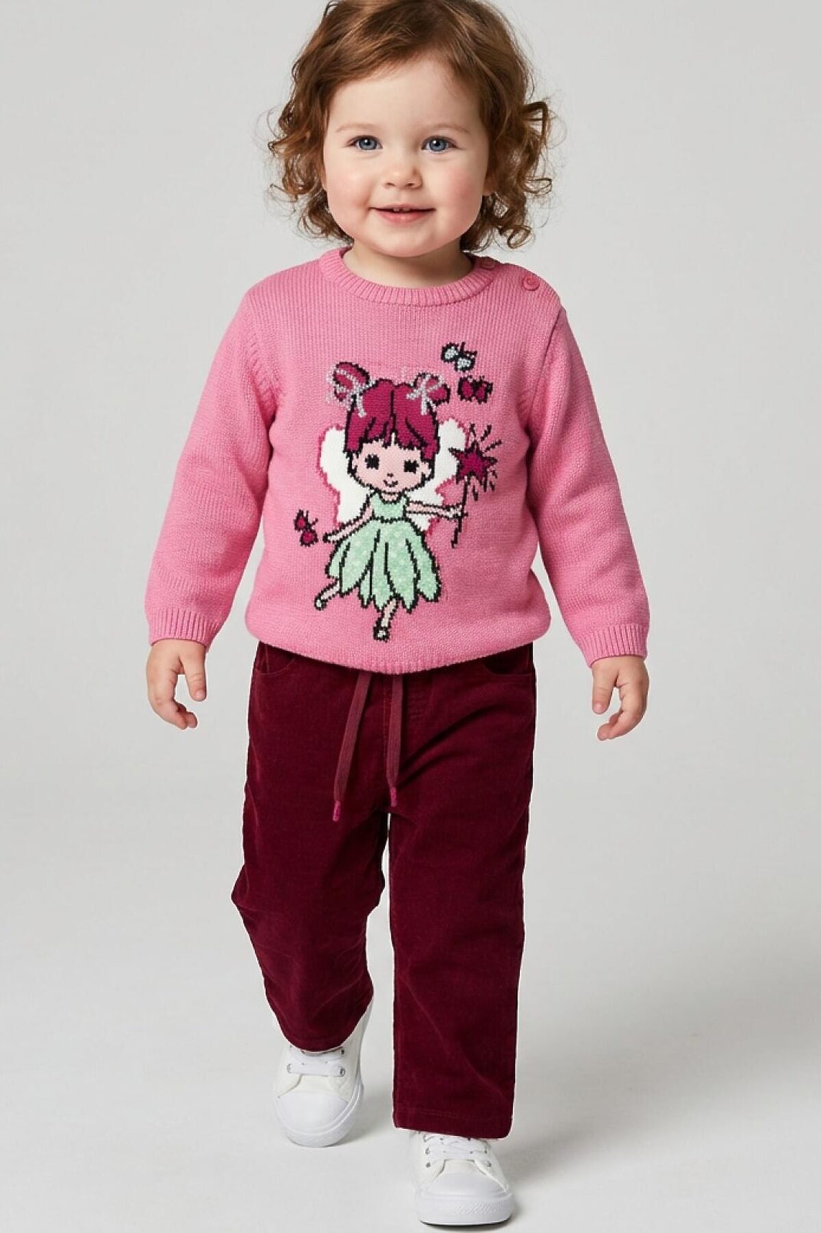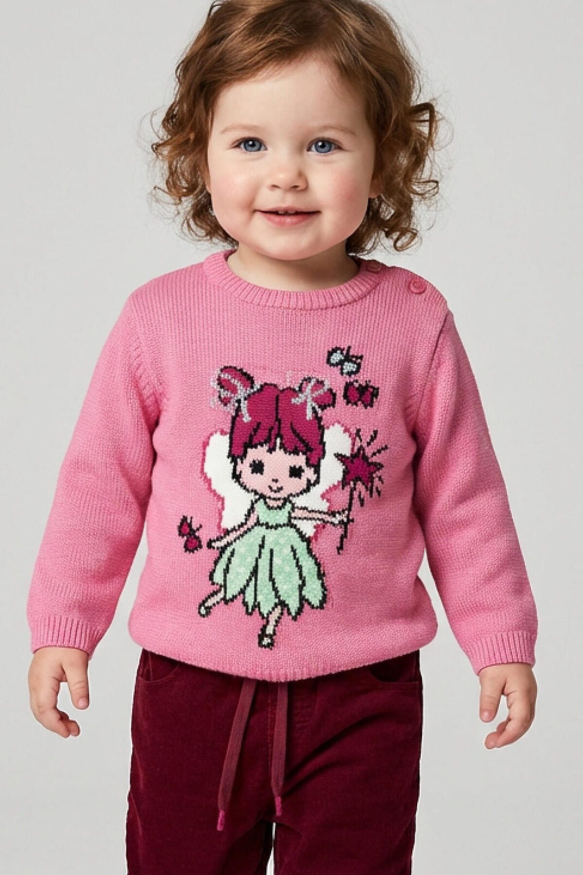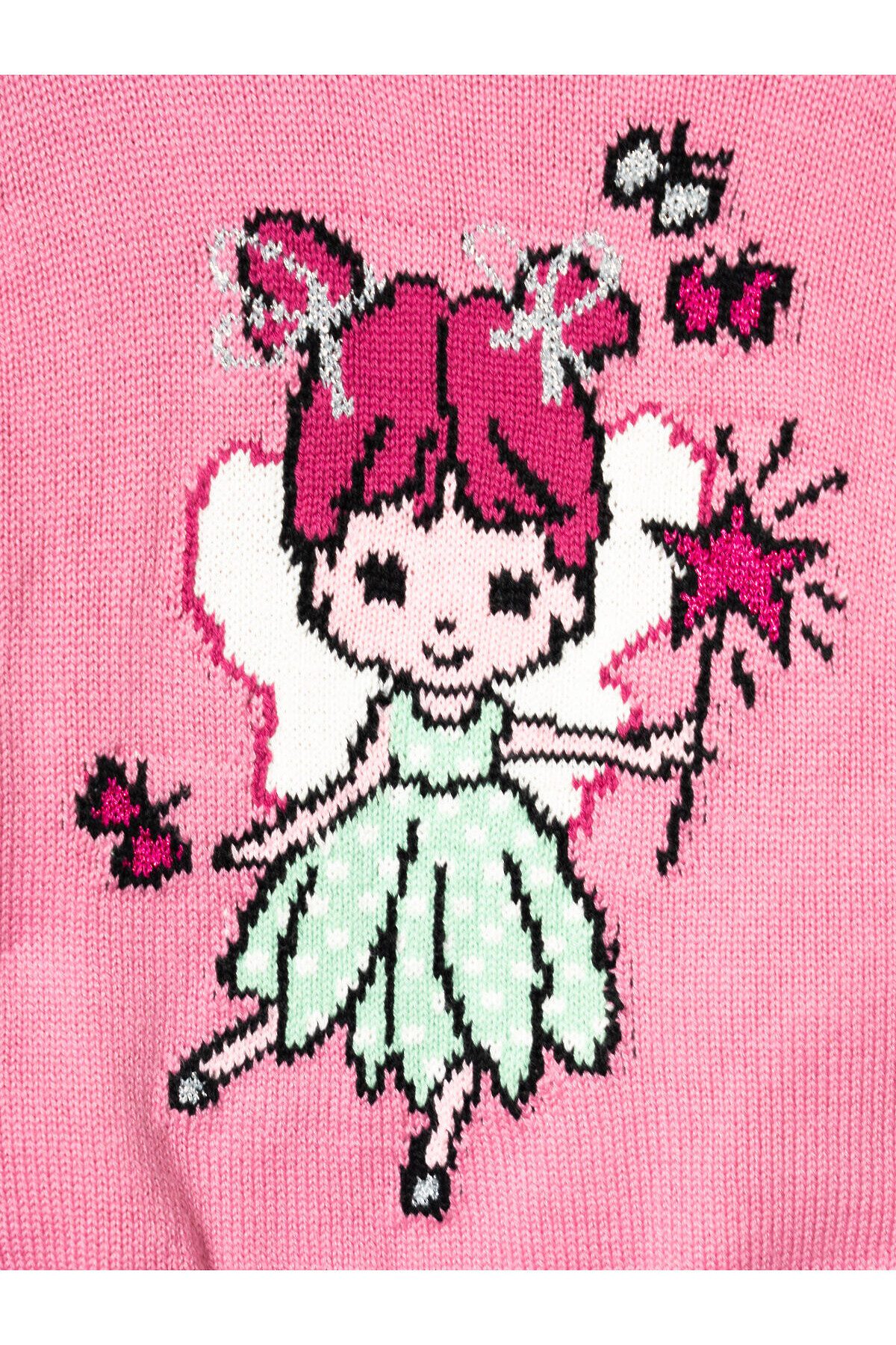 Детский джемпер для девочки. Модель из мягкого, хлопкового трикотажа. На груди расположен крупный жаккардовый рисунок с изображением феи, бабочек и волшебной палочки. В волосах феи и на палочке добавлены блестящие элементы из люрекса. Рукава длинные, с мягкими манжетами. Круглая горловина и низ также обработаны эластичной трикотажной резинкой. На плече предусмотрены кнопки для удобства надевания.