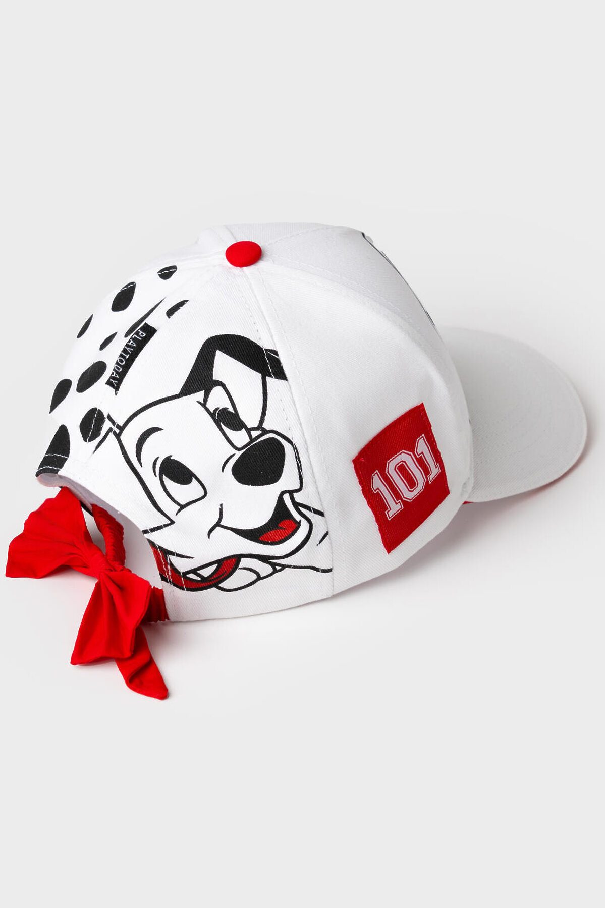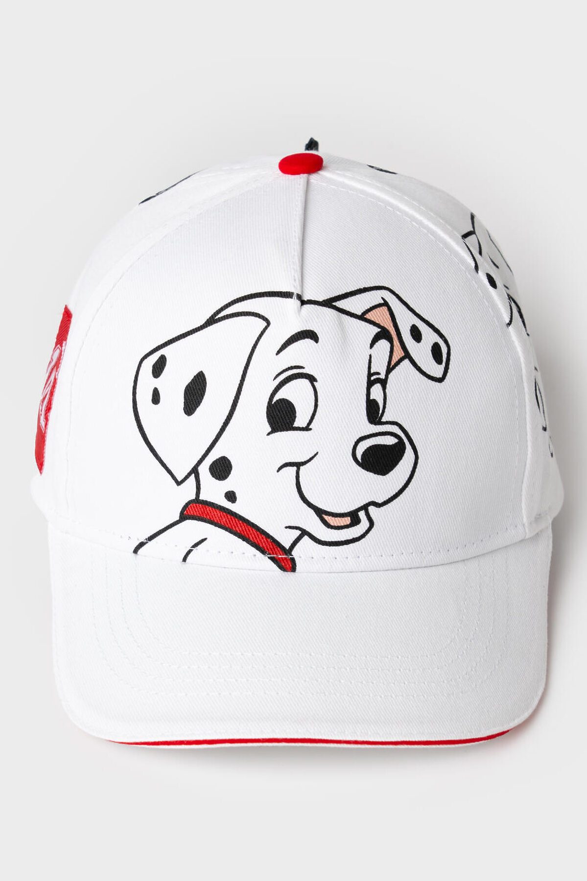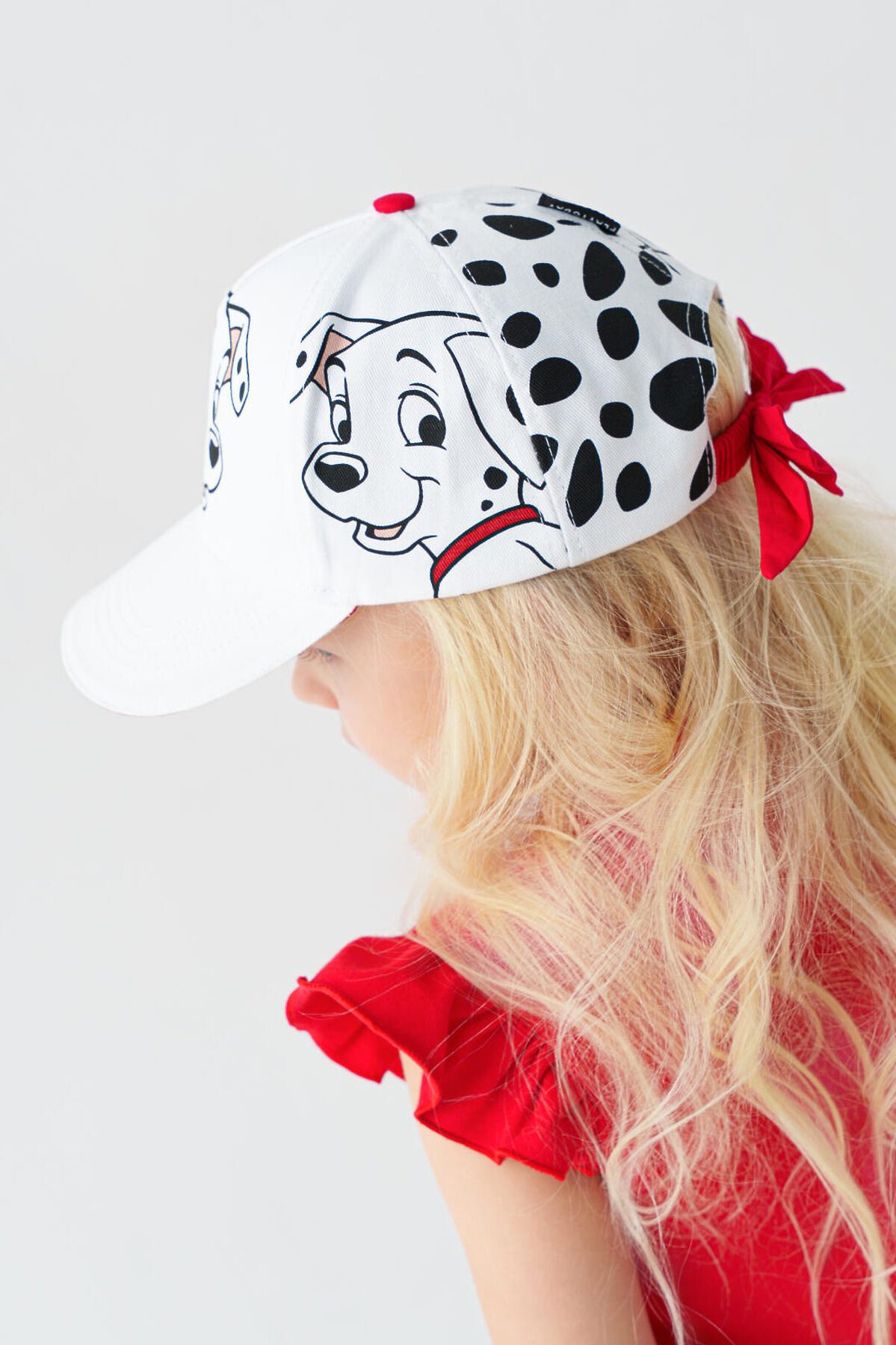 Стильная детская бейсболка для девочки. Выполнена из белой хлопковой ткани с насыщенным принтом с любимыми мультяшными героями - далматинцами. У бейсболки изогнутый козырек, классическая форма. Особое внимание привлекает большой красный бантик-резинка на задней части — он делает изделие особенно нарядным.