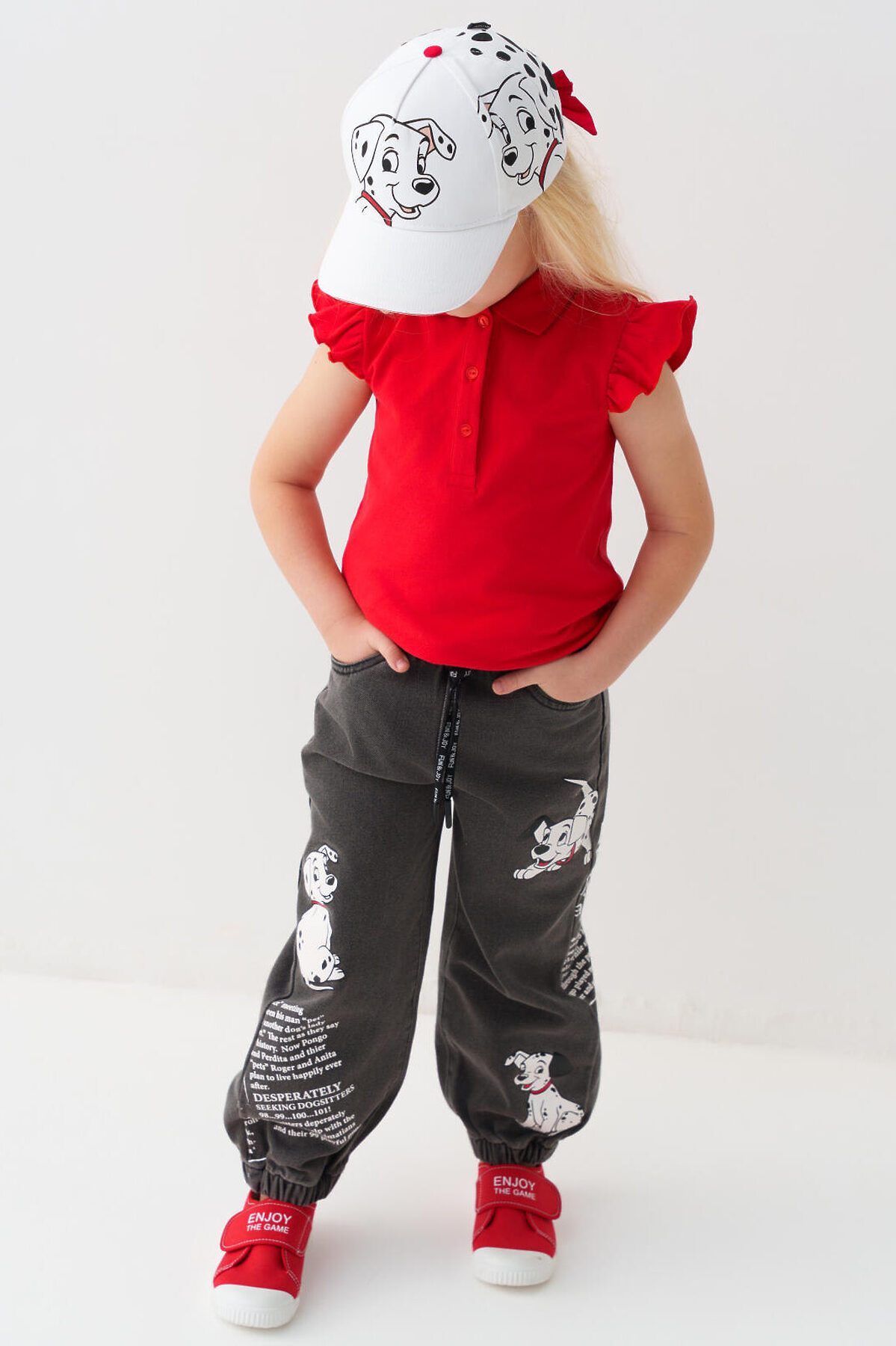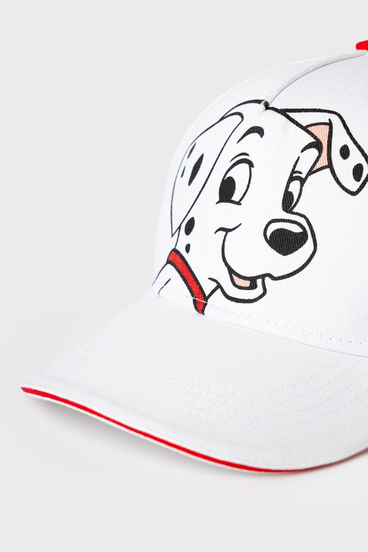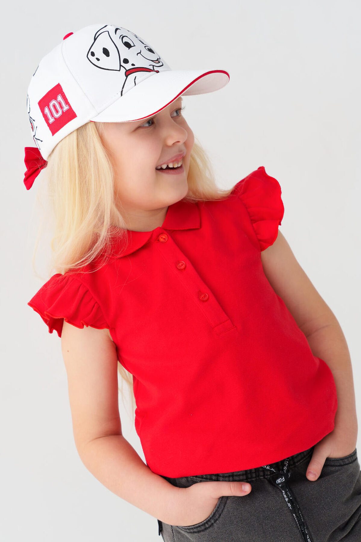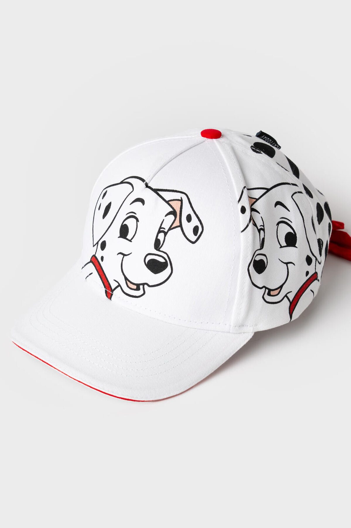 Стильная детская бейсболка для девочки. Выполнена из белой хлопковой ткани с насыщенным принтом с любимыми мультяшными героями - далматинцами. У бейсболки изогнутый козырек, классическая форма. Особое внимание привлекает большой красный бантик-резинка на задней части — он делает изделие особенно нарядным.