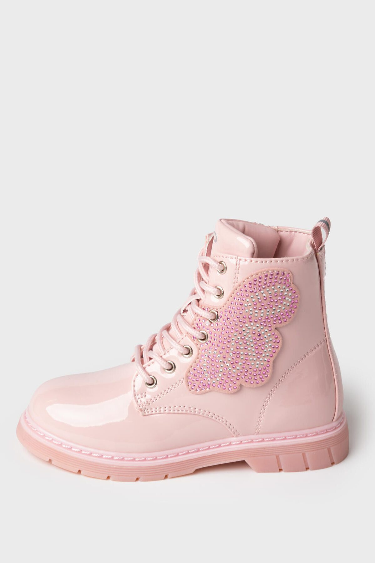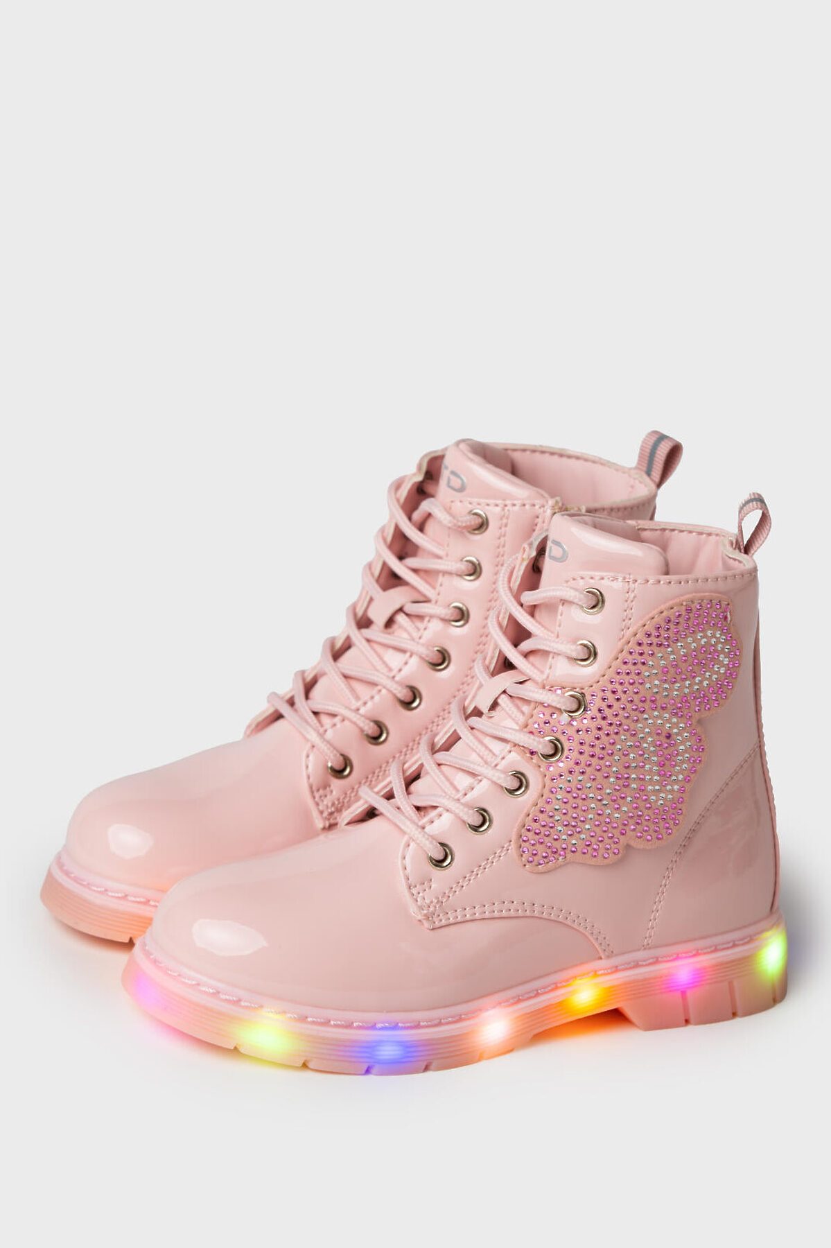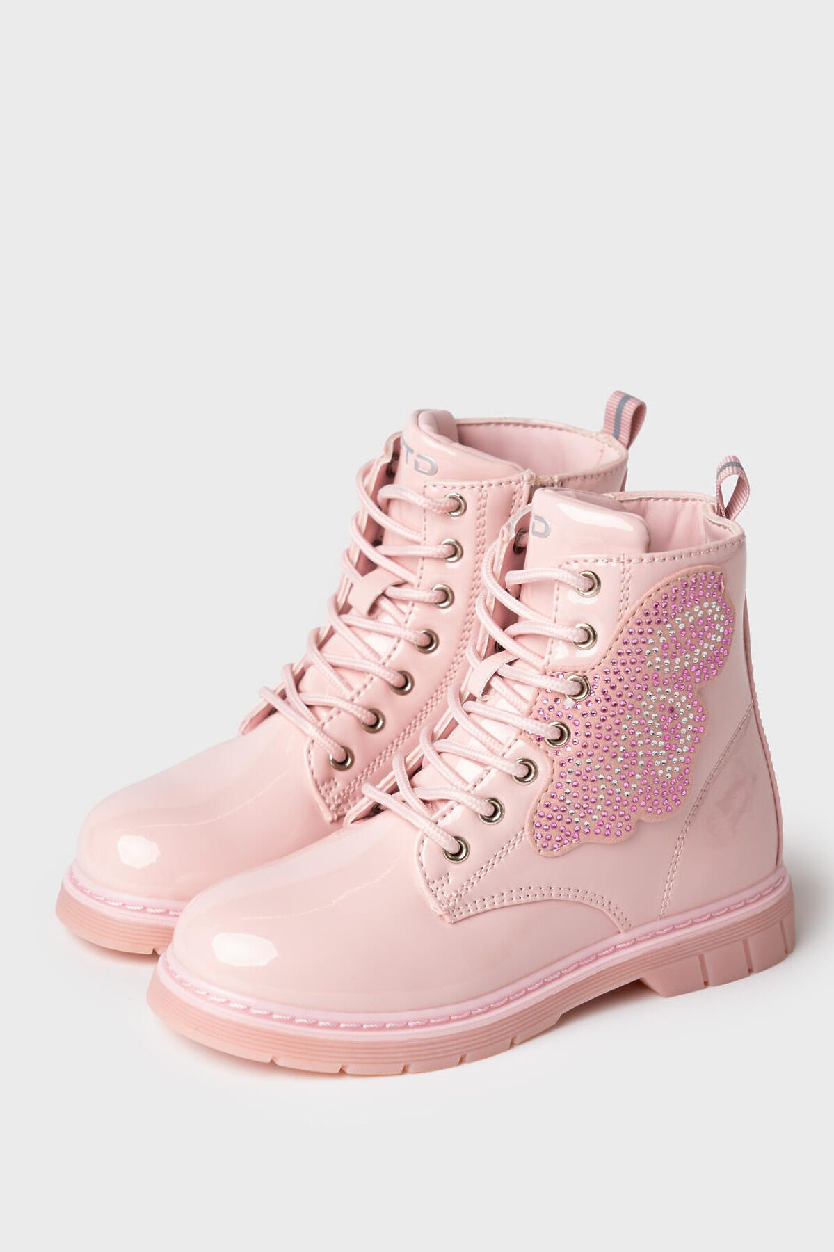 Трендовые розовые детские ботинки для девочки на шнурках. Изнутри имеется молния. Ботинки выполнены из лаковой искусственной кожи. Сбоку ботинки декорированы деталью в виде крыла бабочки, украшенной стразами и заклепками. В обуви стоит мягкая флисовая подкладка. Флисовая стелька вынимается для просушки. Формоустойчивый задник поддерживает стопу в правильном положении. Эргономичная форма колодки обеспечивает правильное формирование стопы ребенка. Подошва из ТПР не скользит и устойчива к истиранию. Подошва с мигающим элементом flashlight.