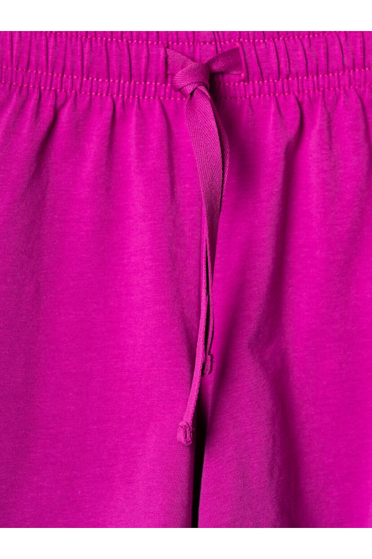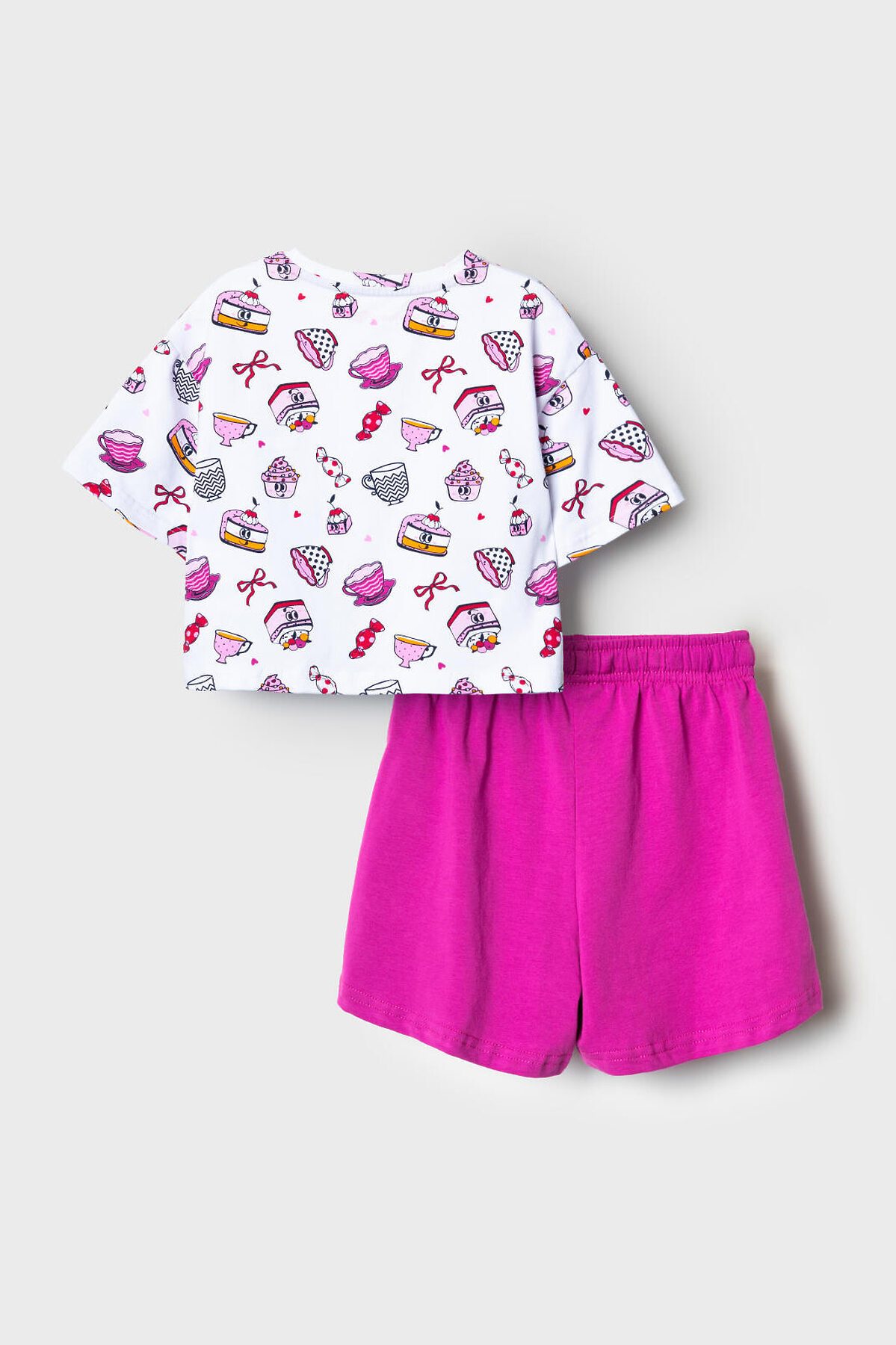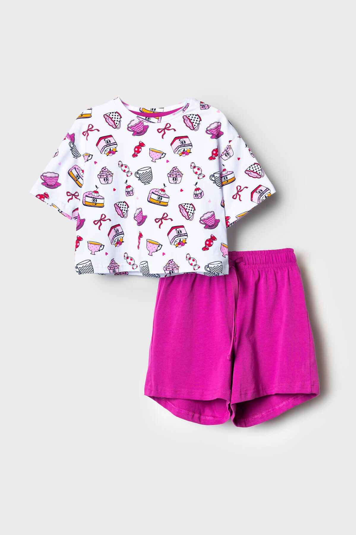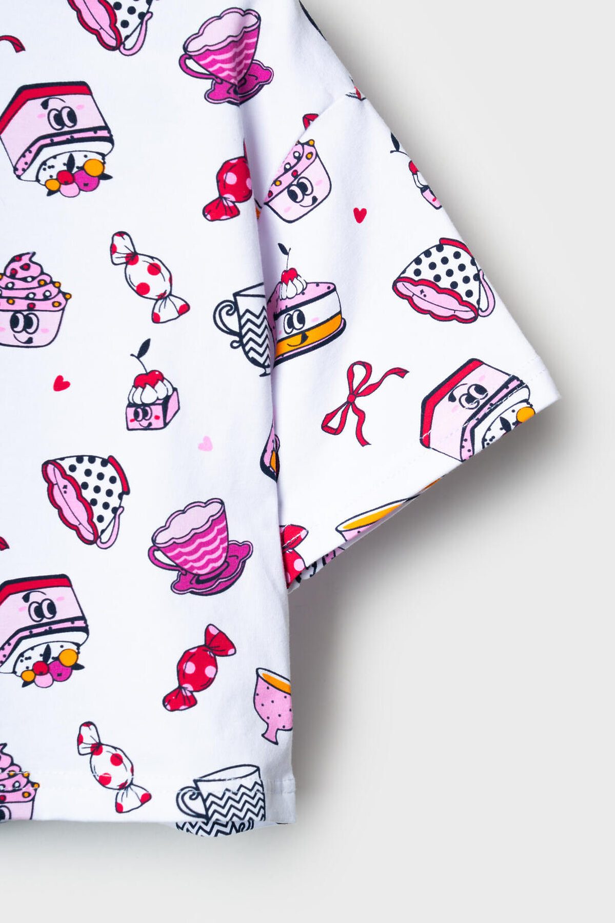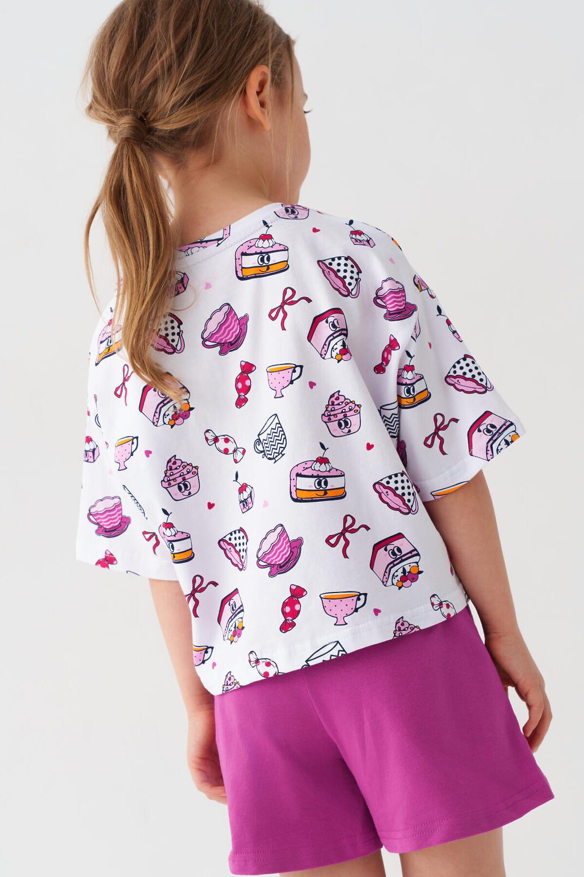 Детская пижама для девочки. Состоит из футболки оверсайз и шорт. Футболка белого цвета украшена ярким принтом с изображением сладостей — кексов, ягод, чашек. У неё короткие рукава и круглая горловина. Шорты однотонные с мягким эластичным поясом спереди. Пижама выполнена из мягкого, хлопкового трикотажа.