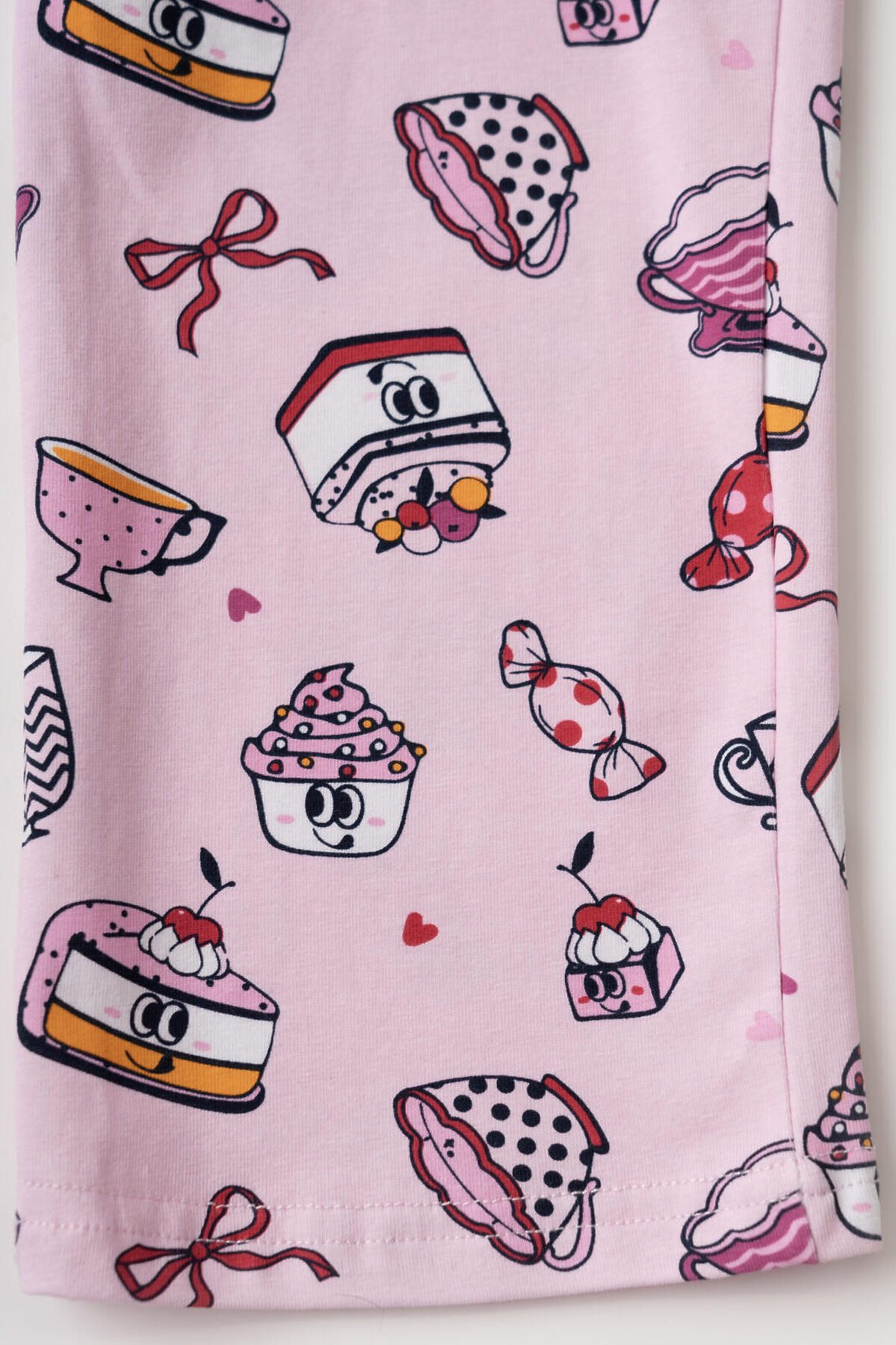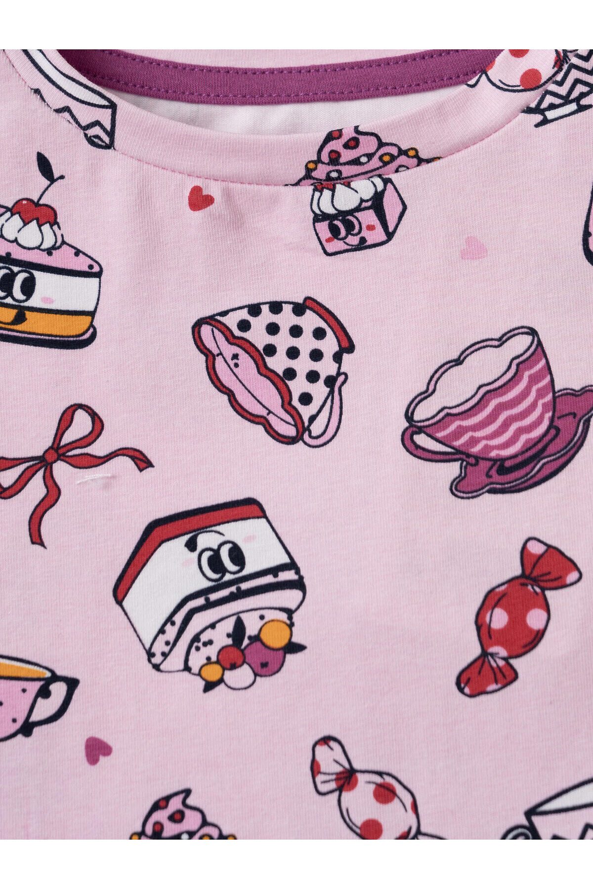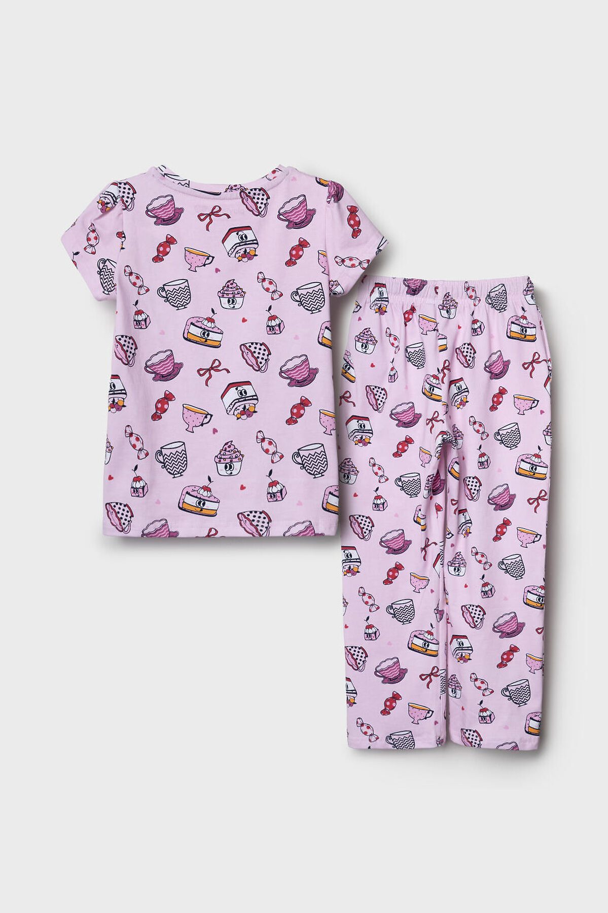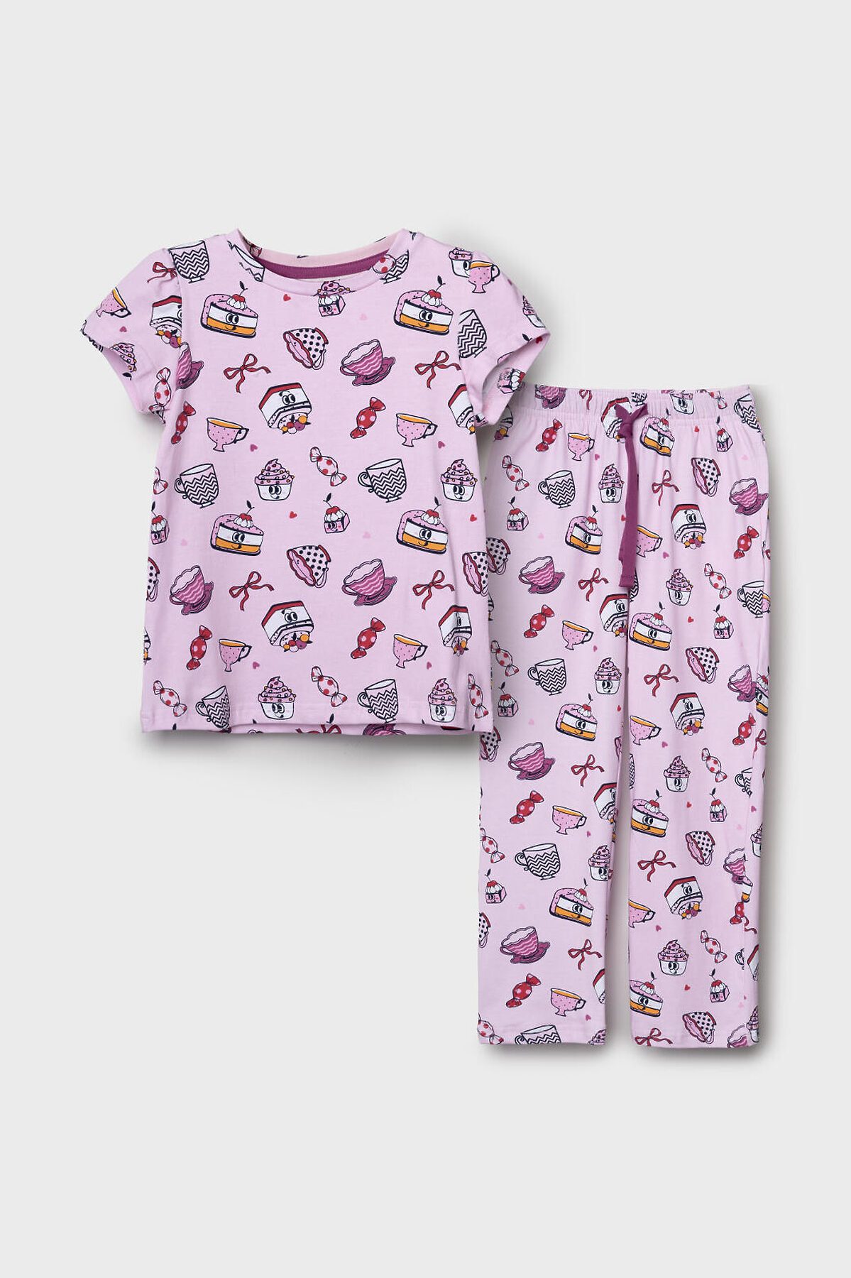 Детская пижама для девочки. Комплект состоит из футболки, свободного кроя с короткими рукавами и брюк. Изделие выполнено из мягкого, хлопкового трикотажа и украшено веселым принтом с пирожными, кексами, чашками и конфетами. На брюках мягкий пояс на резинке с декоративным шнурком.