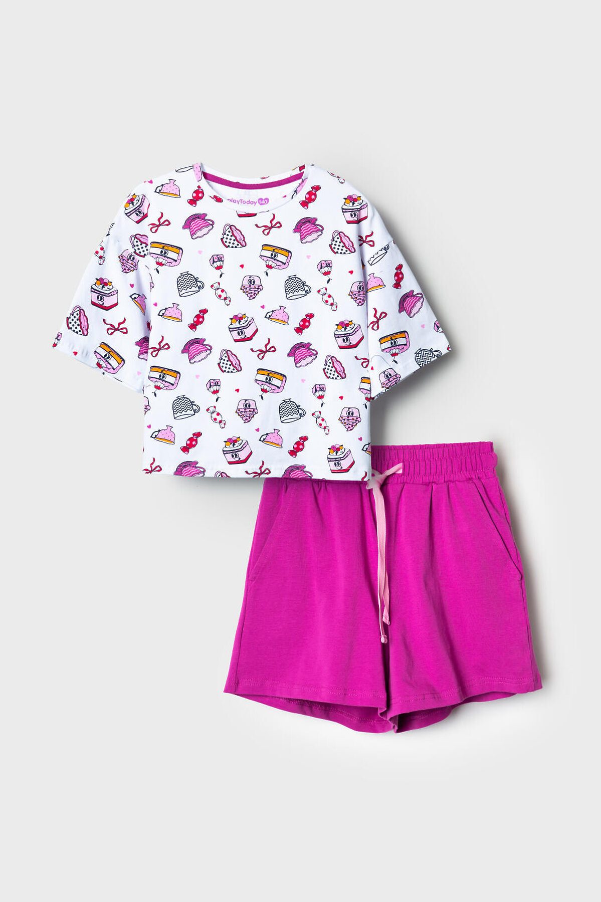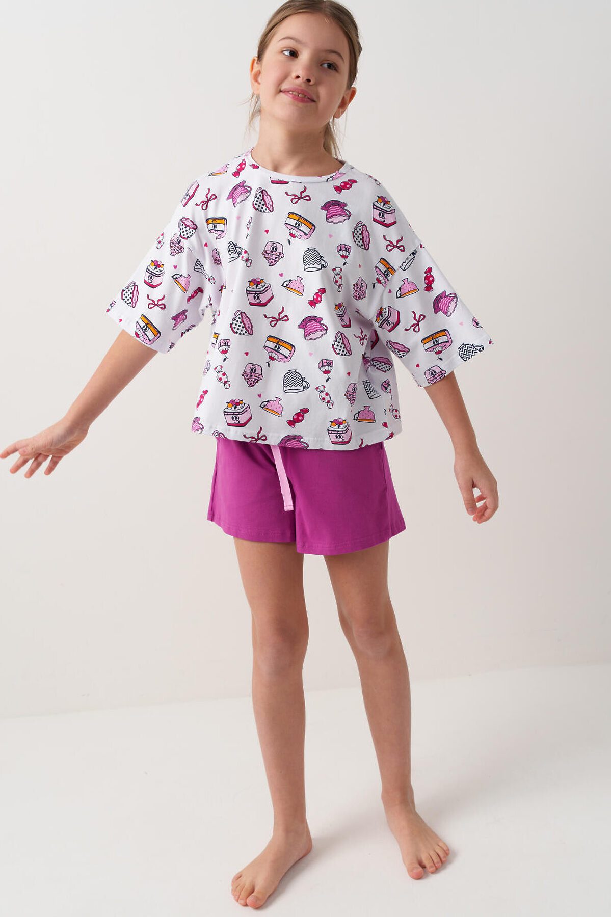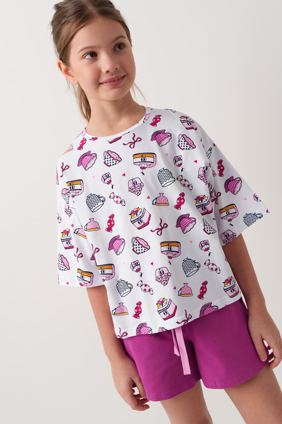 Пижама для девочки подростка. Состоит из оверсайз футболки с короткими рукавами и удобных шорт. Футболка украшена ярким принтом с милыми десертами, чашками и конфетами. Шорты однотонные с мягким поясом и декоративным шнурком. У шорт есть карманы. Комплект выполнен из мягкого, хлопкового трикотажа, приятного к телу.