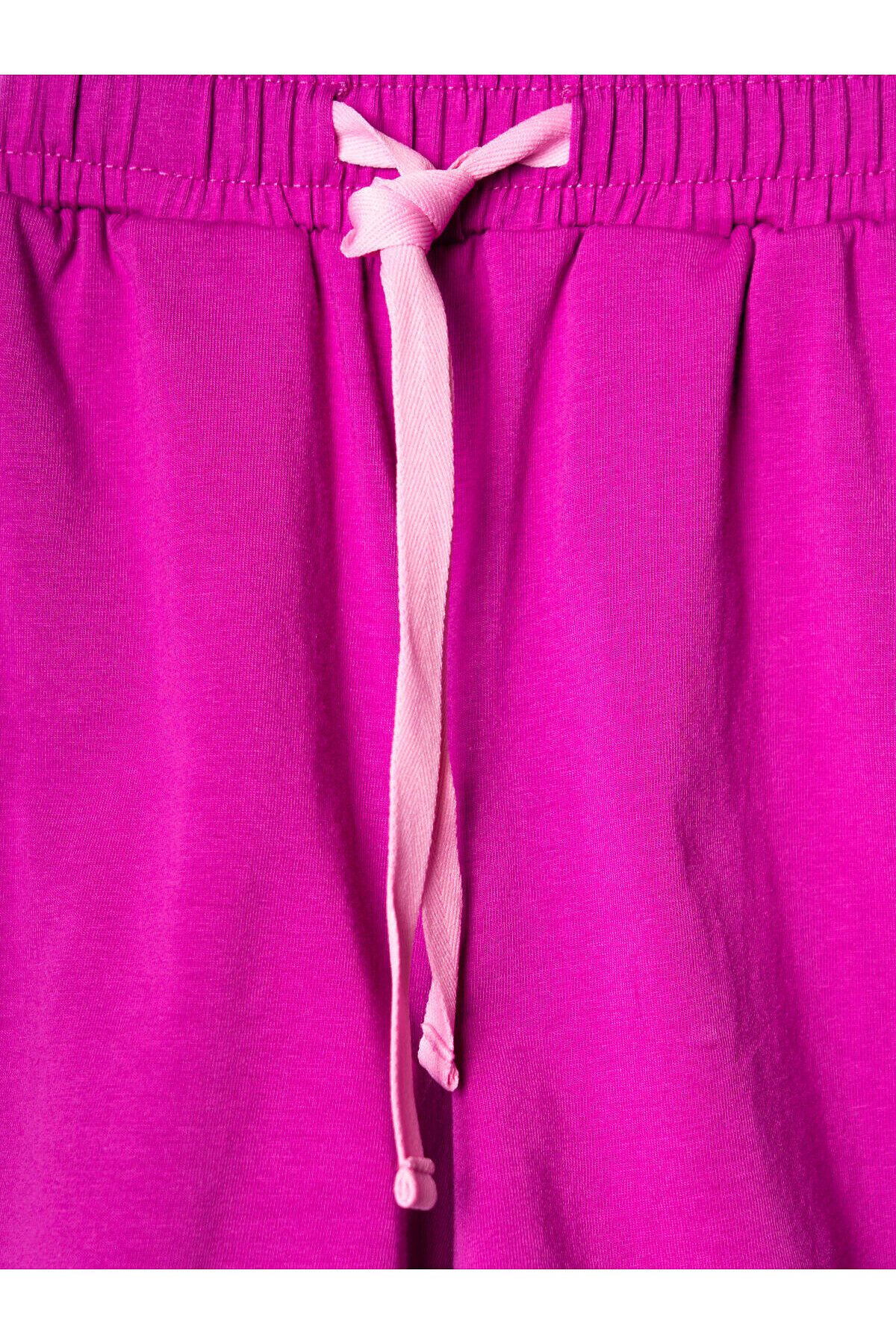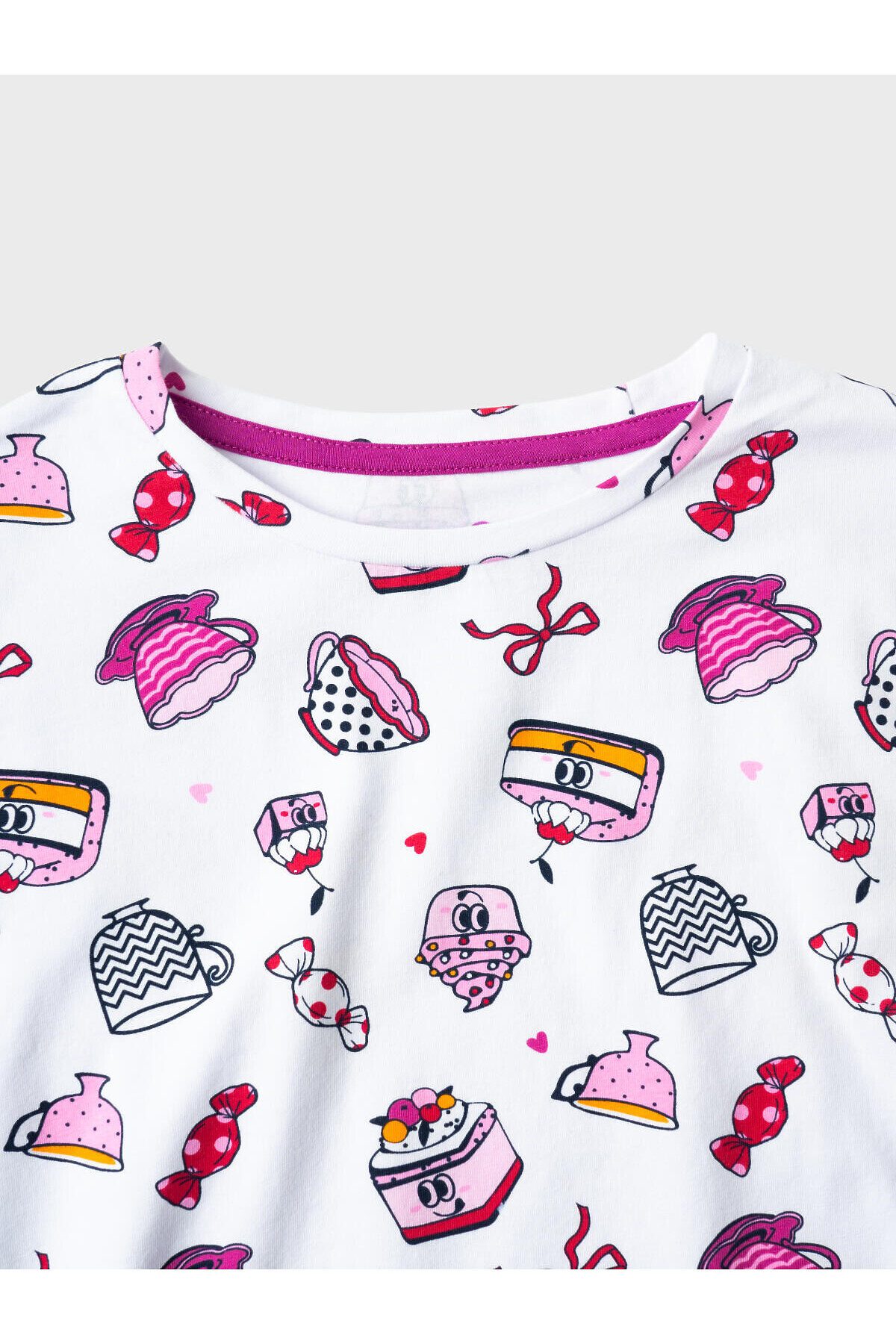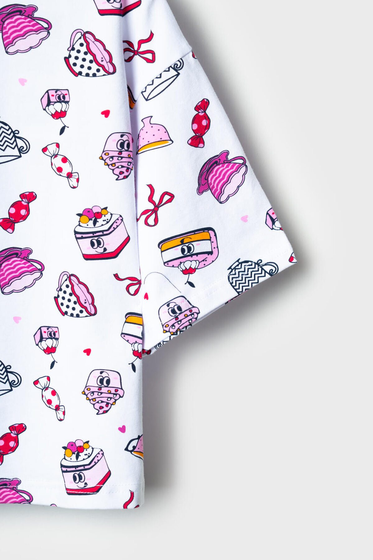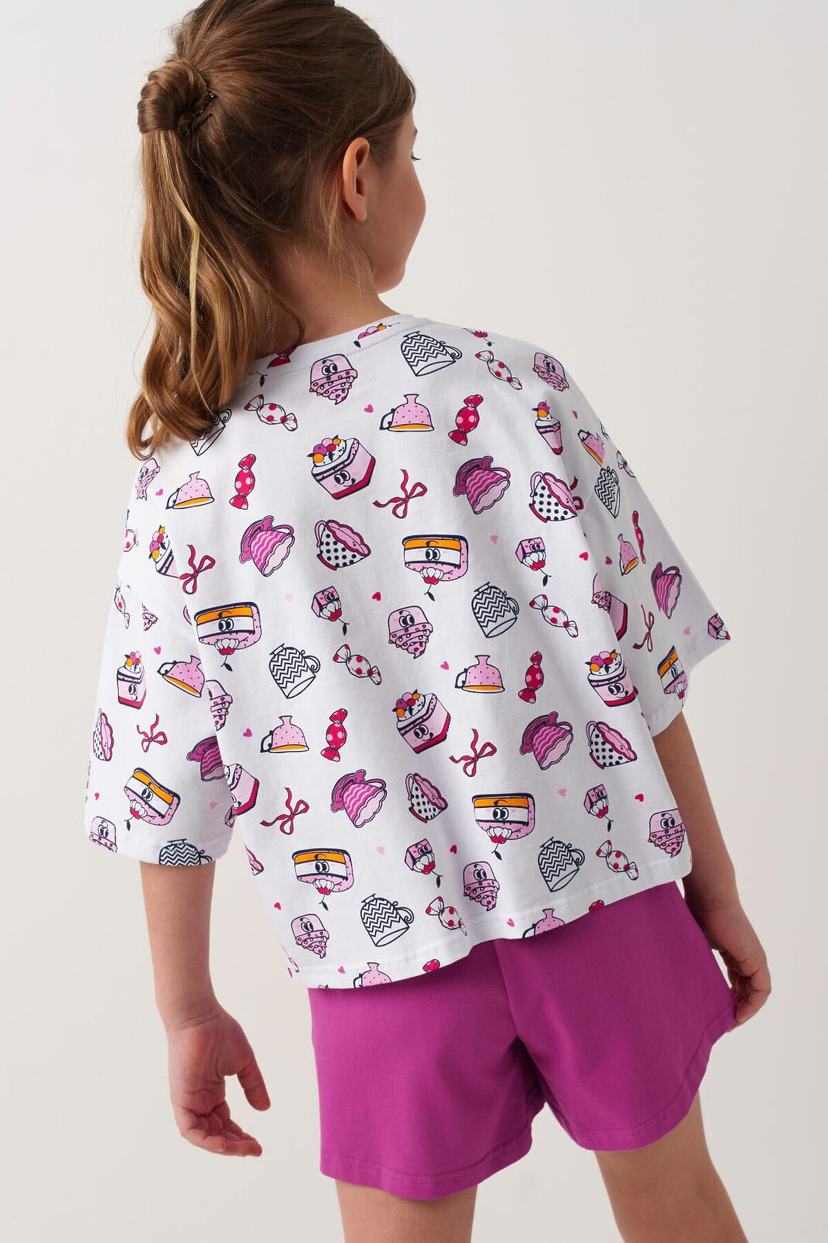 Пижама для девочки подростка. Состоит из оверсайз футболки с короткими рукавами и удобных шорт. Футболка украшена ярким принтом с милыми десертами, чашками и конфетами. Шорты однотонные с мягким поясом и декоративным шнурком. У шорт есть карманы. Комплект выполнен из мягкого, хлопкового трикотажа, приятного к телу.
