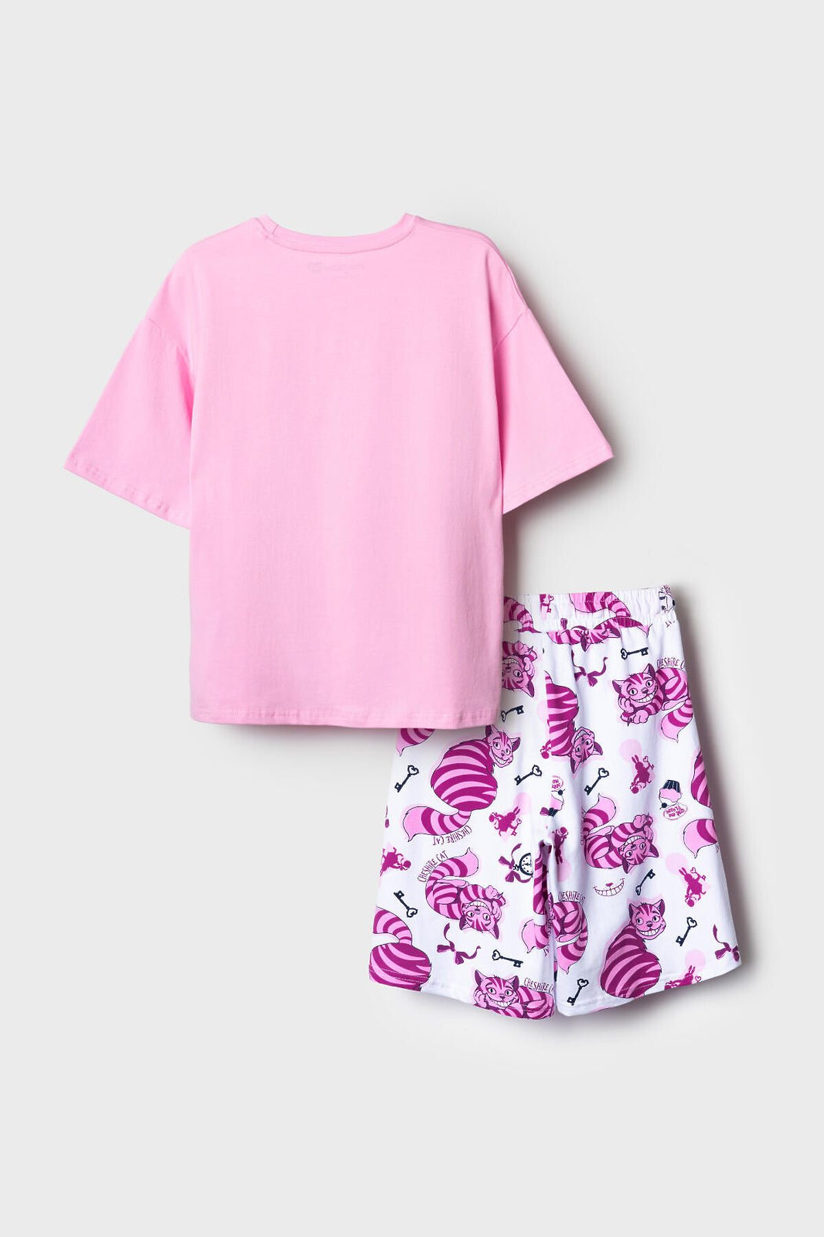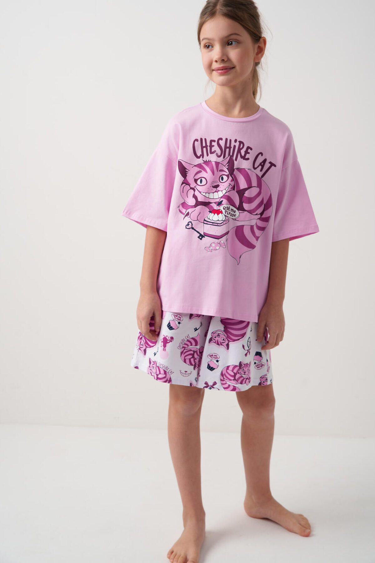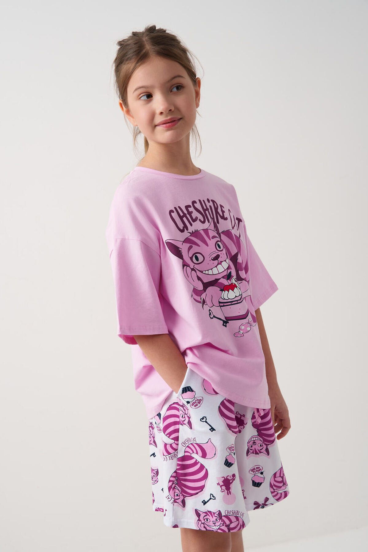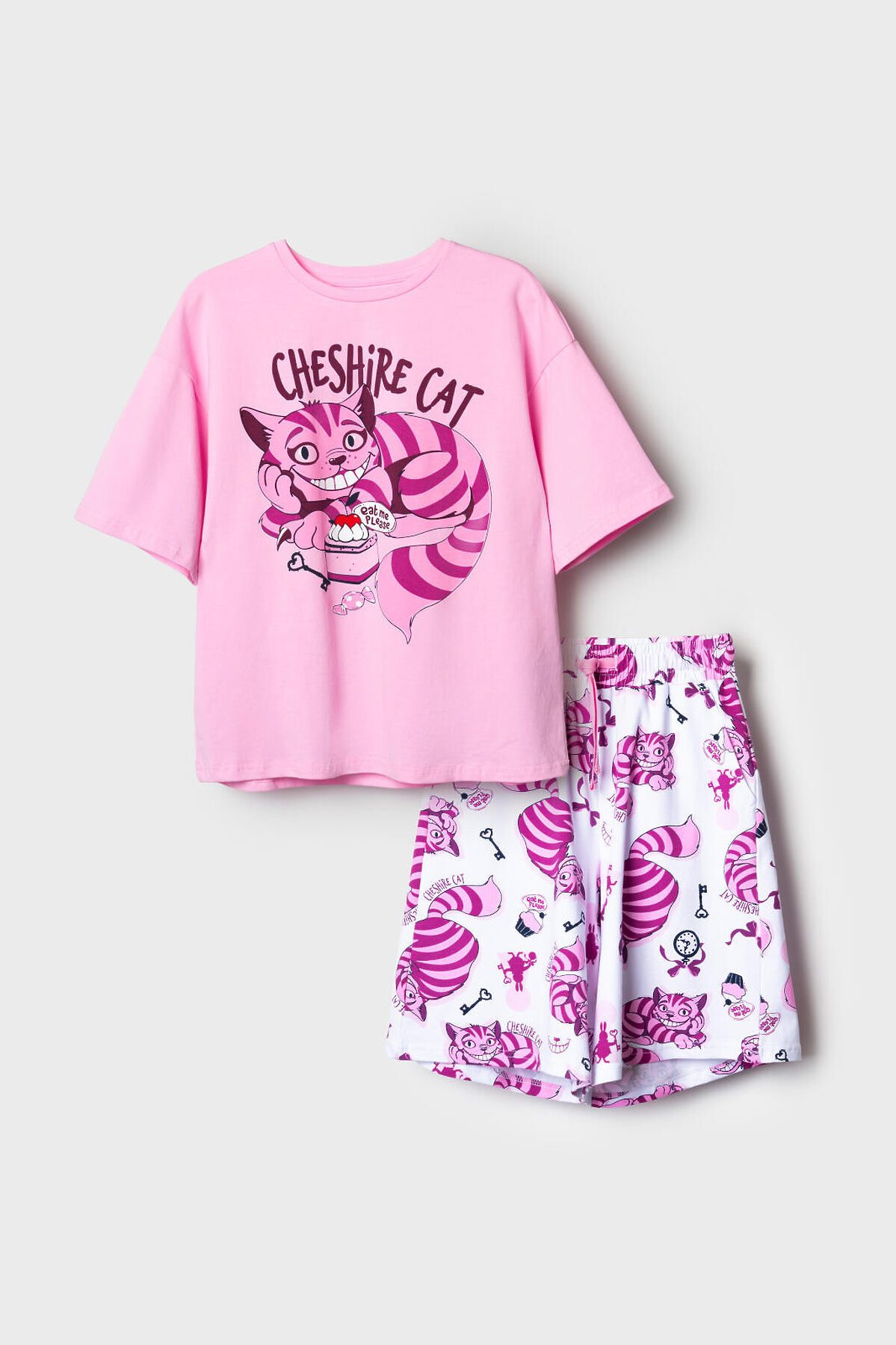 Пижама для девочки подростка. Состоит из розовой оверсайз футболки с ярким принтом Чеширского кота и белых шорт. У футболки круглый вырез и короткие рукава. Шорты на мягкой резинке с декоративным шнурком. Материал - хлопковый. дышащий трикотаж.