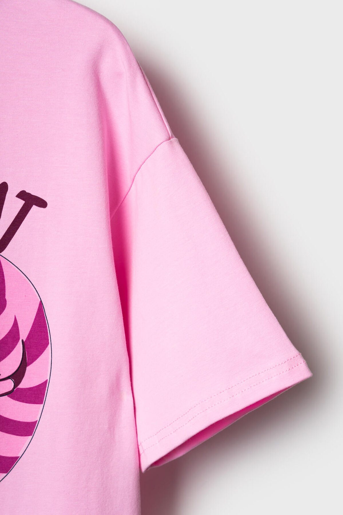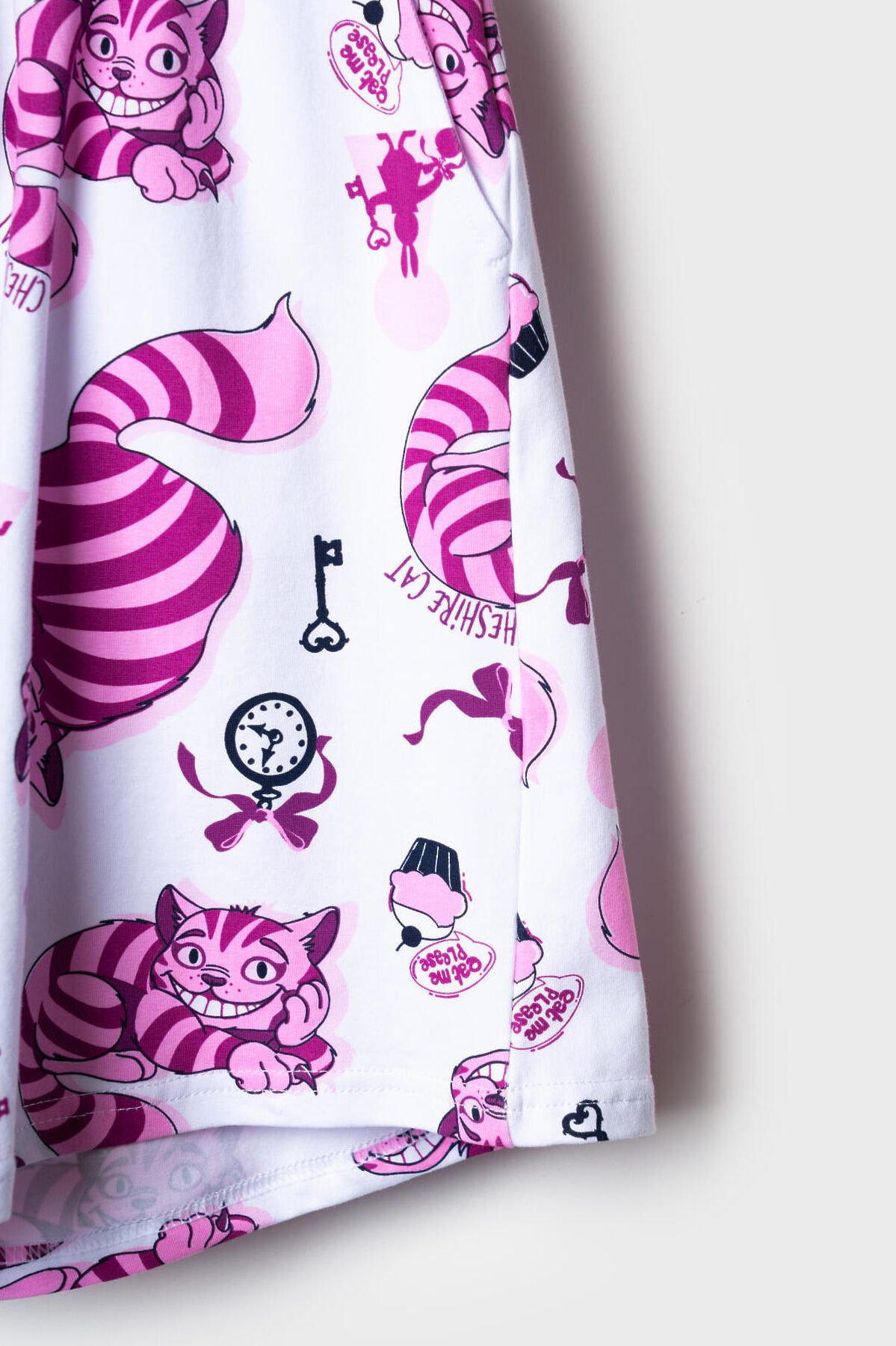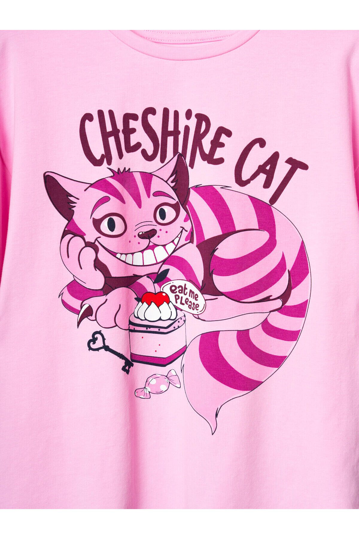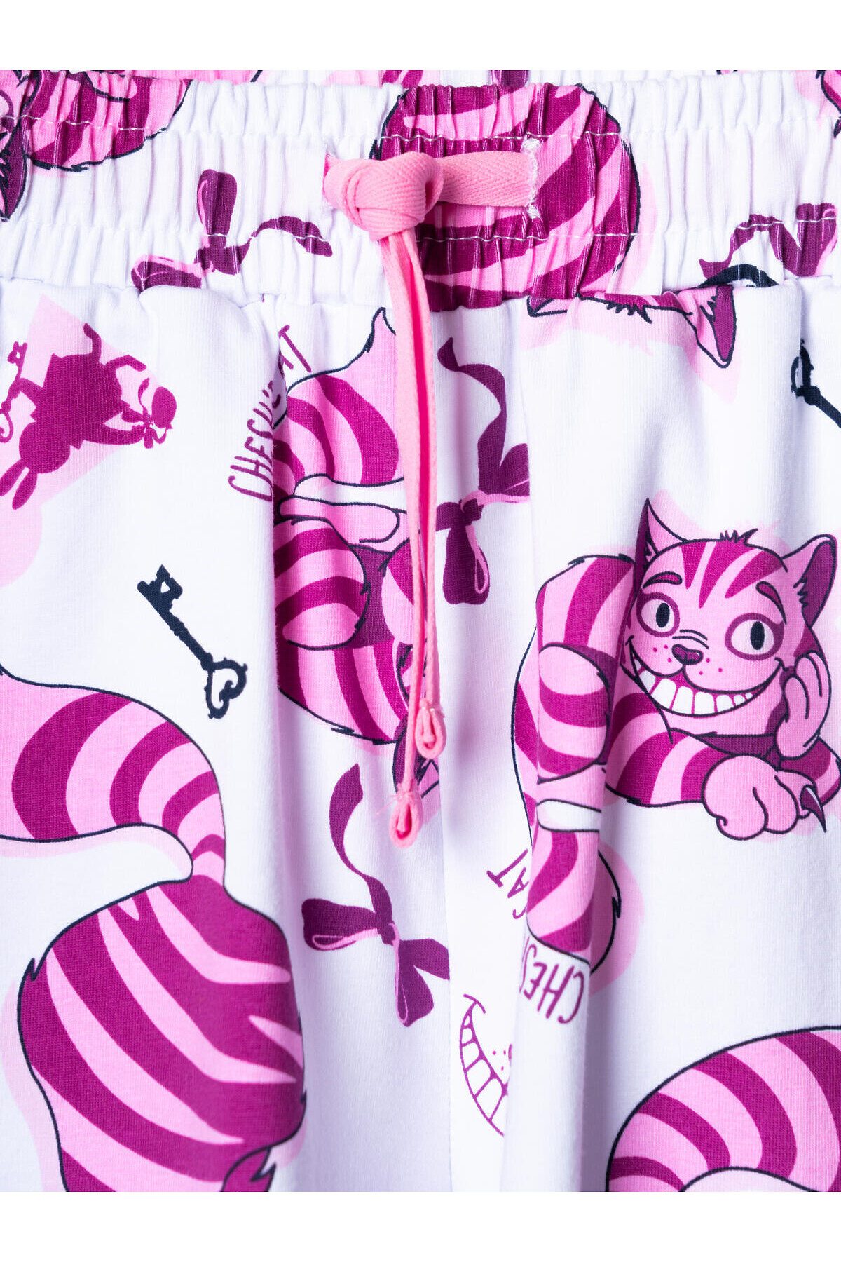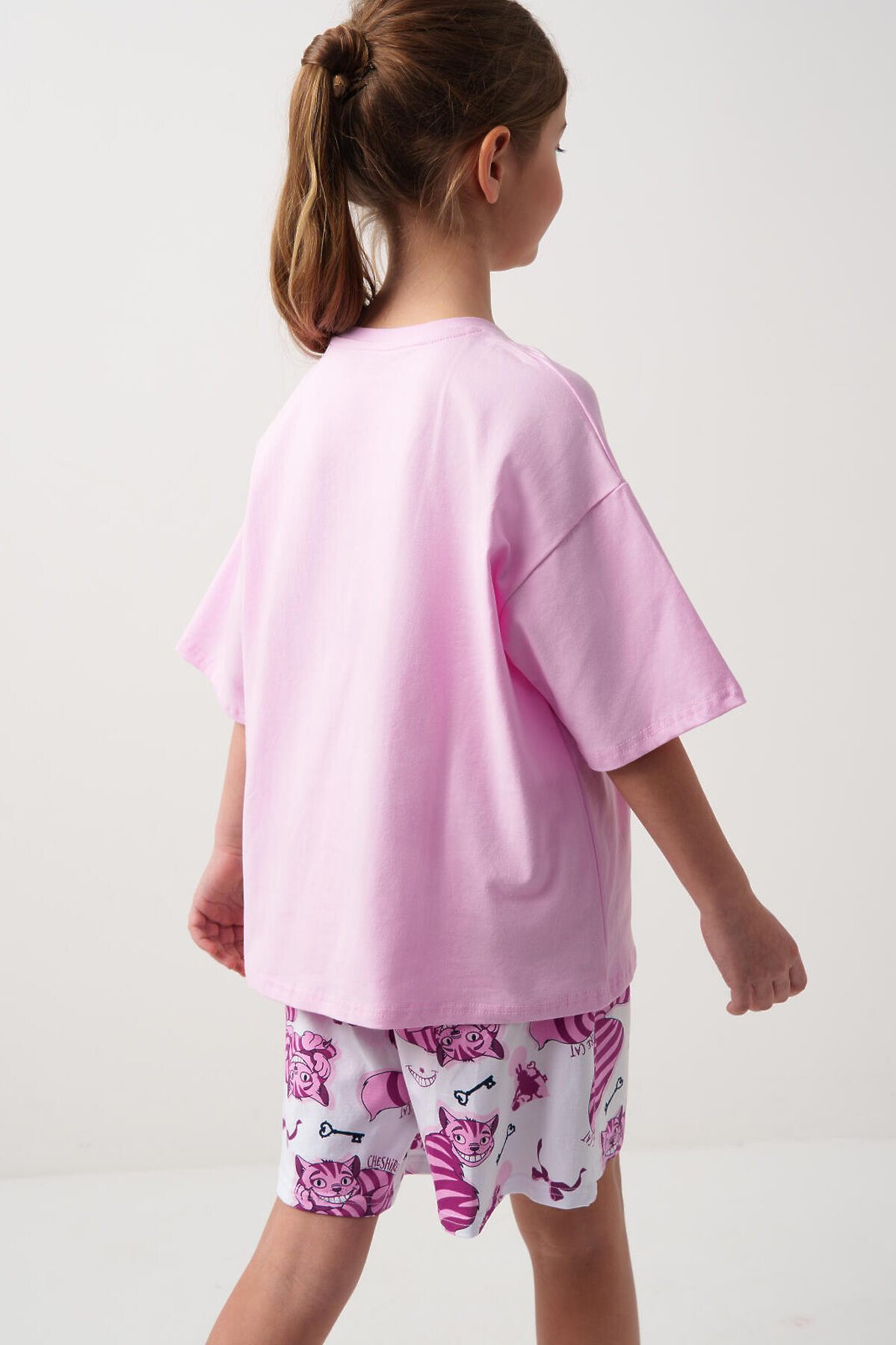 Пижама для девочки подростка. Состоит из розовой оверсайз футболки с ярким принтом Чеширского кота и белых шорт. У футболки круглый вырез и короткие рукава. Шорты на мягкой резинке с декоративным шнурком. Материал - хлопковый. дышащий трикотаж.