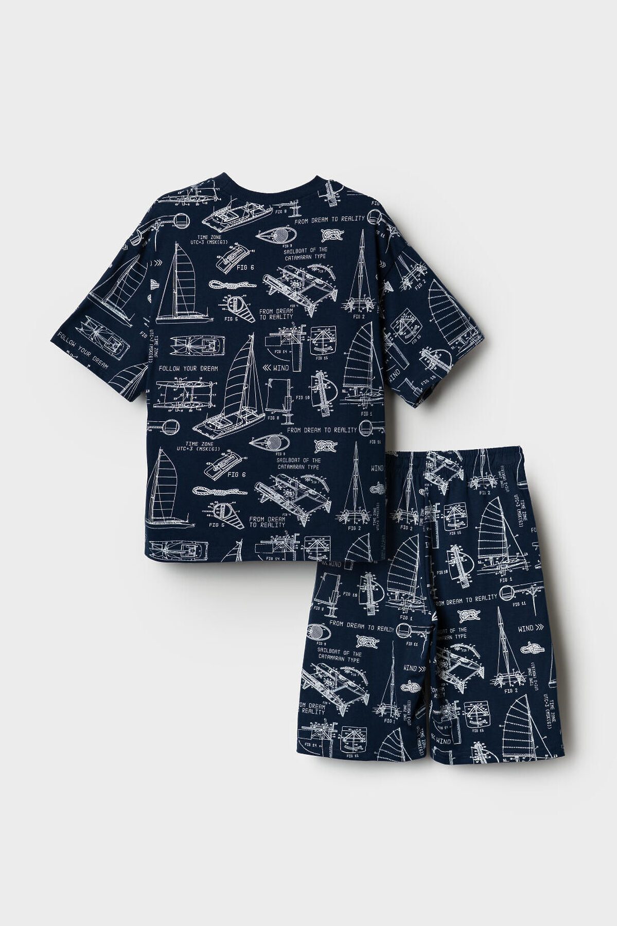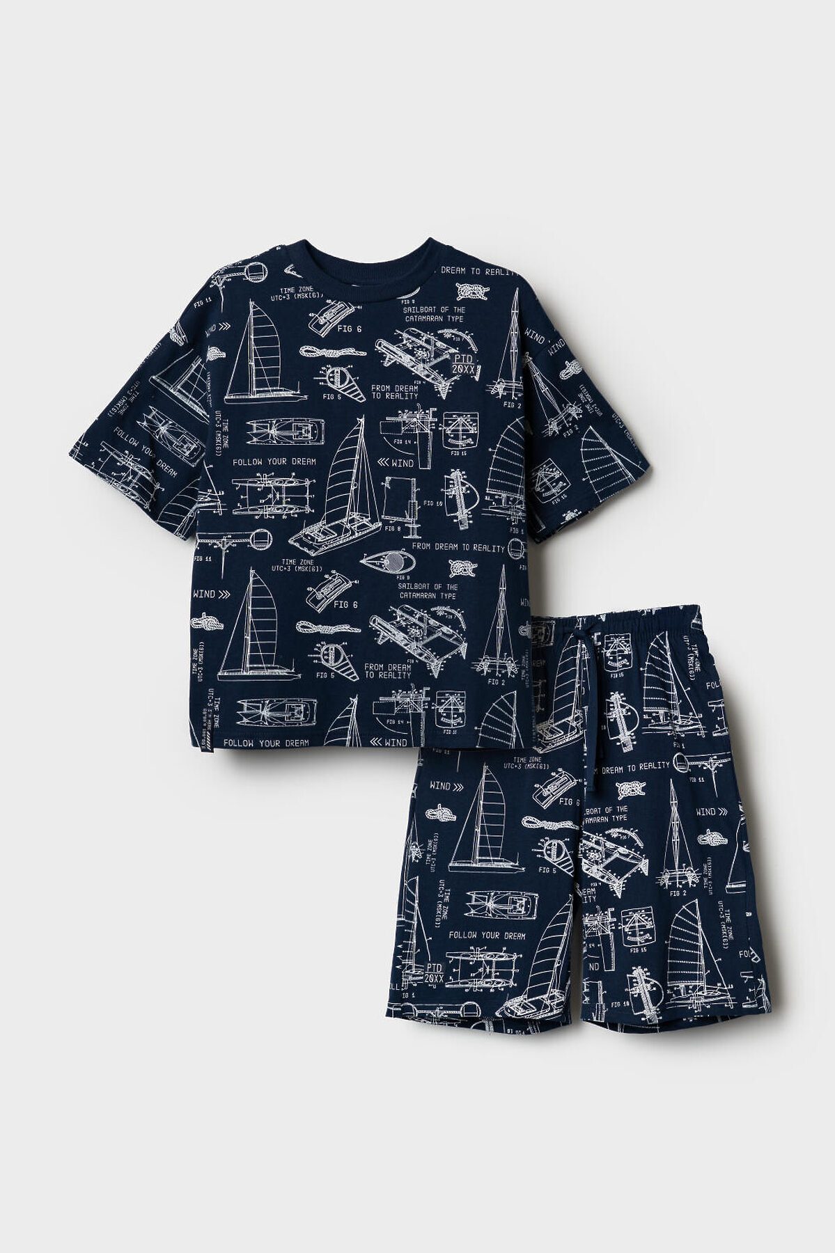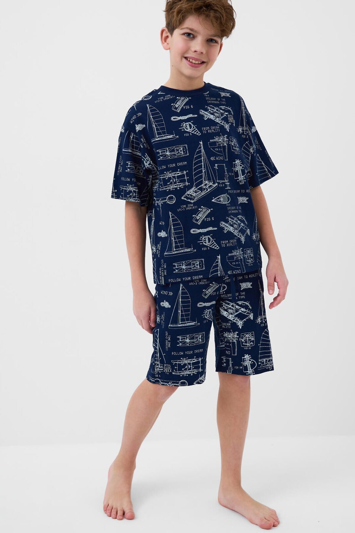 Пижама для мальчика подростка. Комплект состоит из оверсайз футболки с коротким рукавом и шорт. Изделие выполнено из мягкого, хлопкового трикотажа и имеет свободный крой, который обеспечивает комфорт. Принт на ткани — в морской тематике: яхты, схемы. Горловина футболки круглая с эластичной окантовкой, на шортах — удобный пояс с резинкой и завязками, а также карманы в боковых швах.