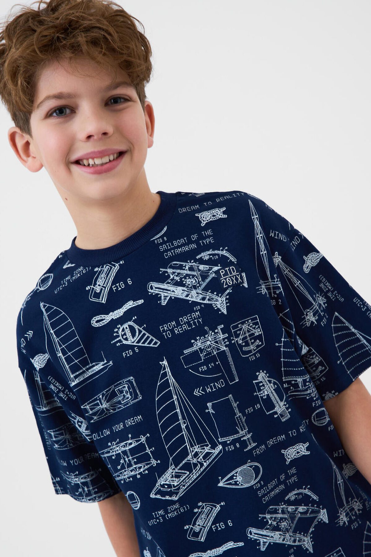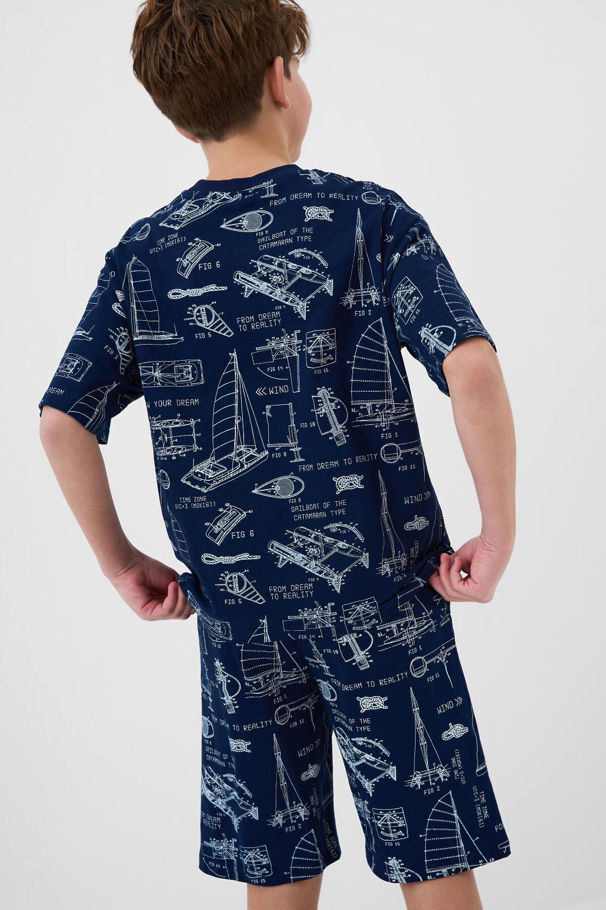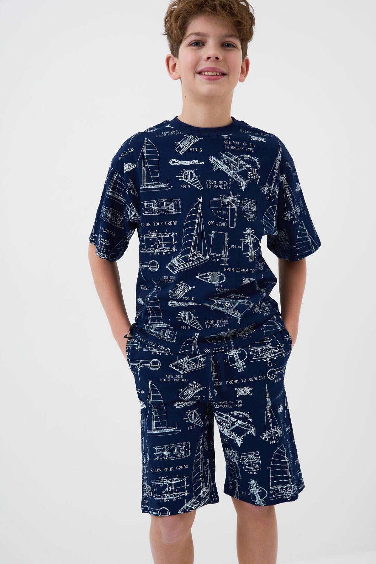 Пижама для мальчика подростка. Комплект состоит из оверсайз футболки с коротким рукавом и шорт. Изделие выполнено из мягкого, хлопкового трикотажа и имеет свободный крой, который обеспечивает комфорт. Принт на ткани — в морской тематике: яхты, схемы. Горловина футболки круглая с эластичной окантовкой, на шортах — удобный пояс с резинкой и завязками, а также карманы в боковых швах.