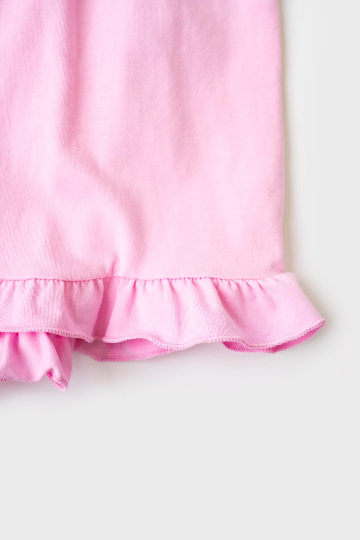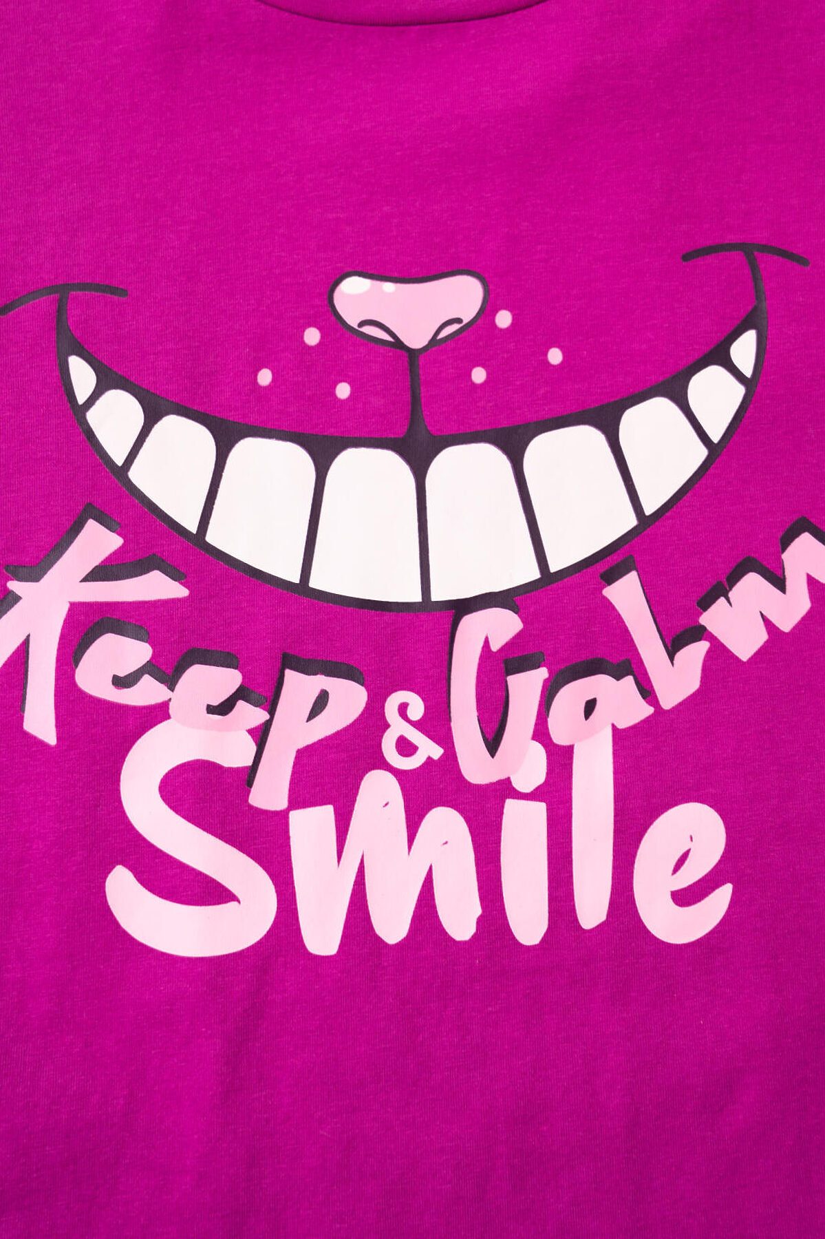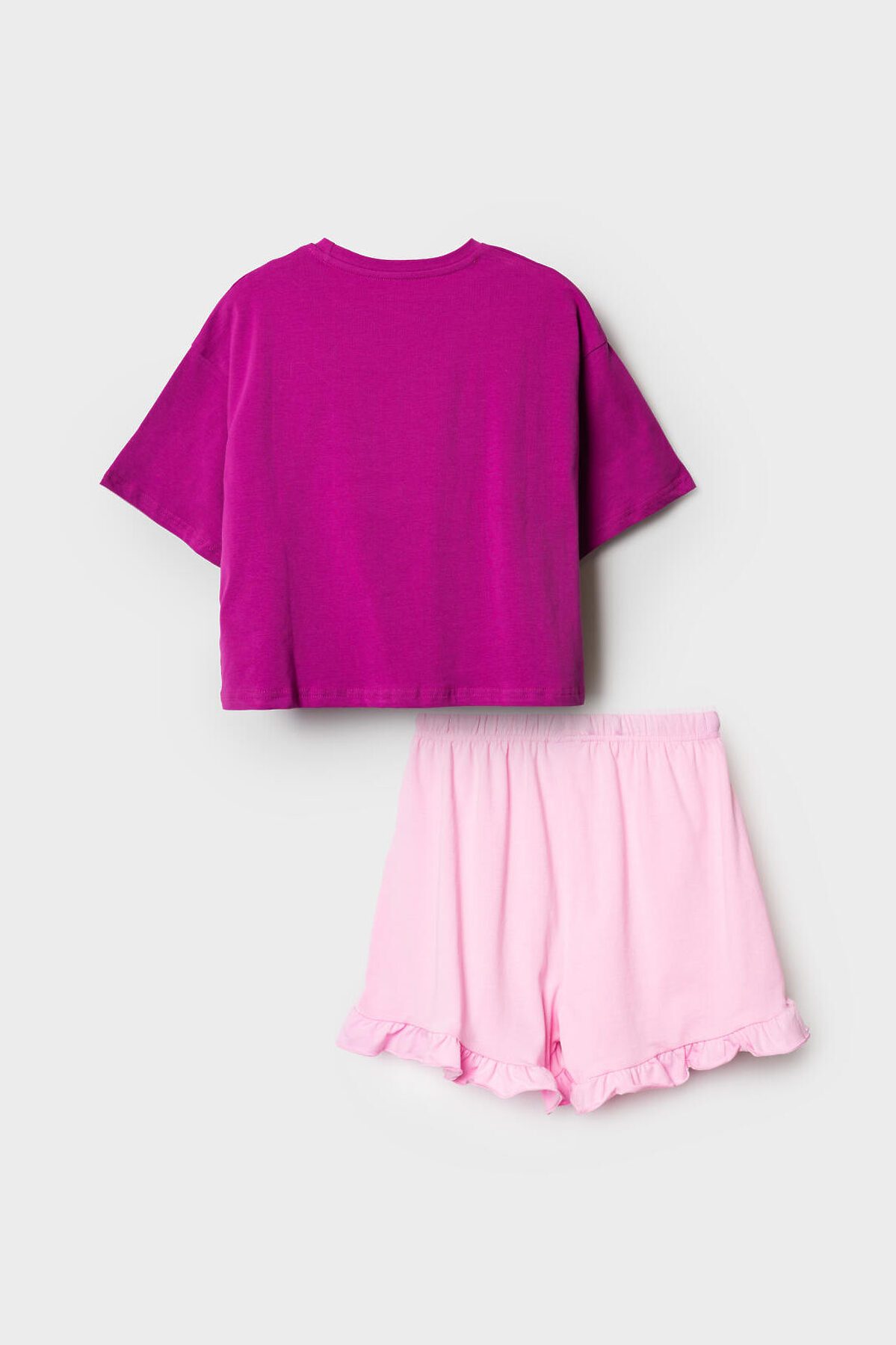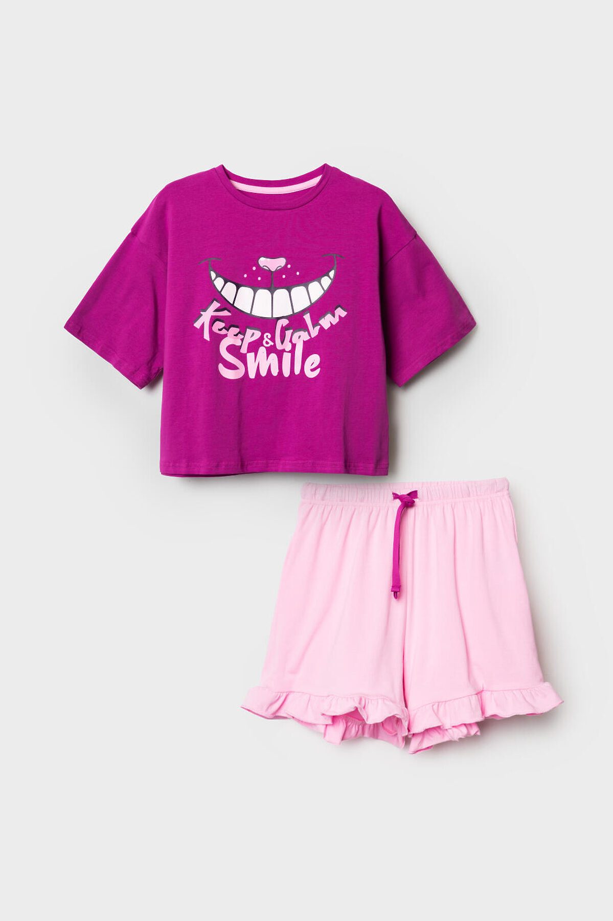 Пижама для девочки подростка. Комплект из оверсайз футболки и шорт. Футболка свободного кроя с короткими рукавами, украшена ярким принтом, отсылающим к любимому герою - Чеширскому коту. Шорты светло-розового цвета с мягкой резинкой в поясе и декоративным бантом, украшены рюшами по краю. Изделие выполнено из мягкого хлопкового трикотажа с добавлением эластана.