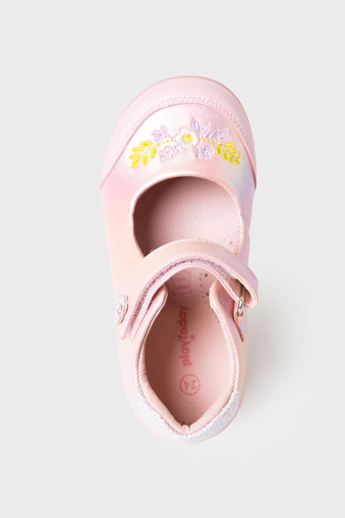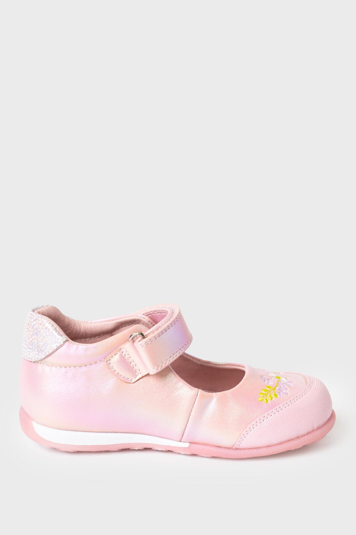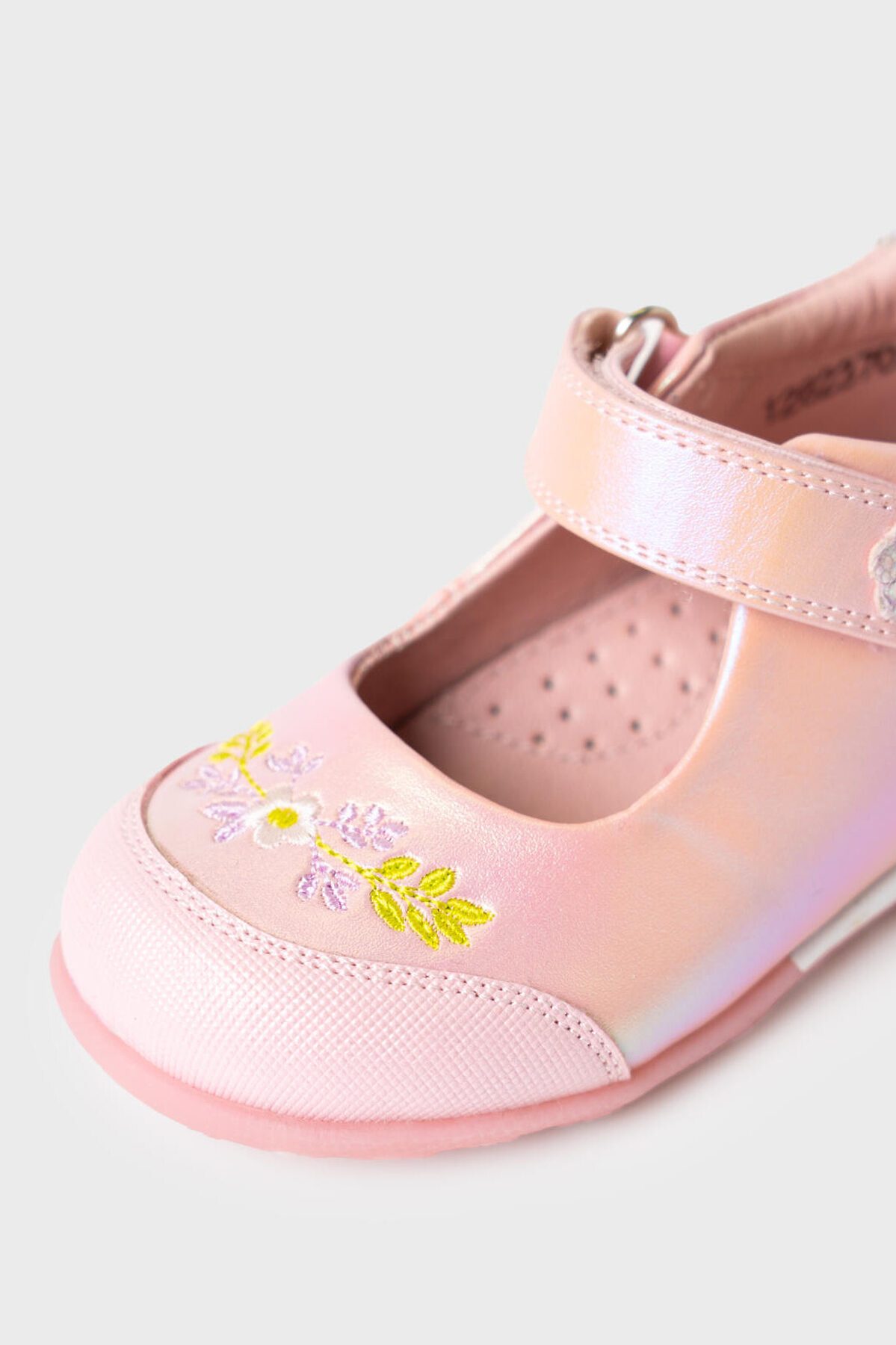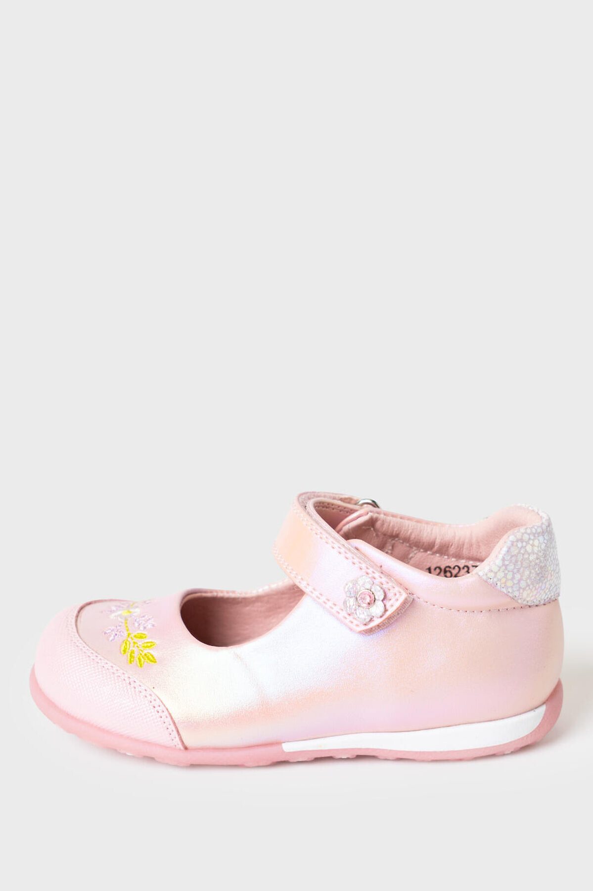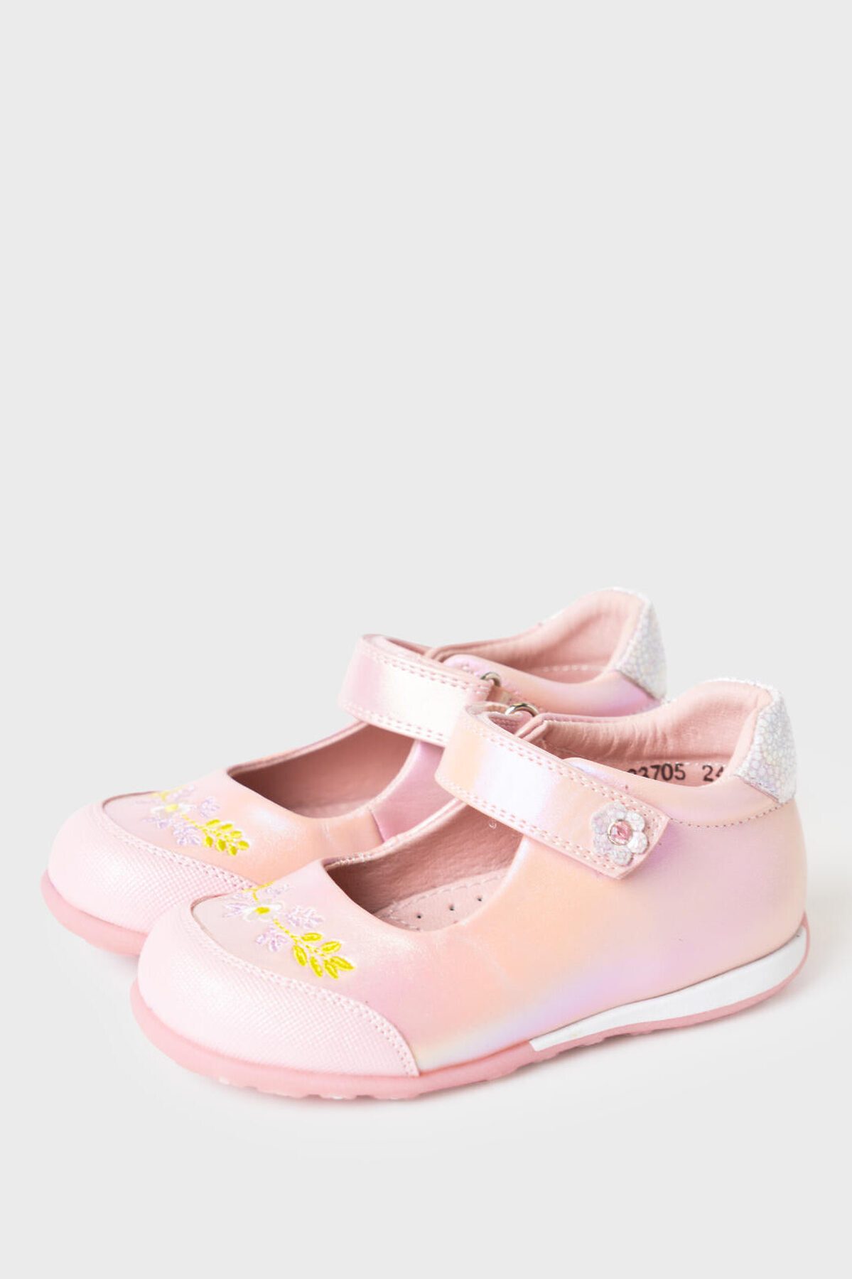 Милейшие туфли для девочки выполнены из перламутровой искусственной кожи. На носочной части стоит специальный материал с защитным покрытием. Удобный возвратный ремень с липучкой позволяют регулировать обувь на любой подъем и позволяют ребенку обуваться самостоятельно. Подкладка и стелька выполнены из натуральной кожи. Стелька имеет анатомический элемент для поддержания свода стопы в правильном положении. Подошва из ТПР легкая, гибкая и нескользкая. Кроме того рисунок подошвы напоминает цветочную поляну - он весь состоит из больших и маленьких цветочков. Парфюмированная подошва имеет запах жевательной резинки.