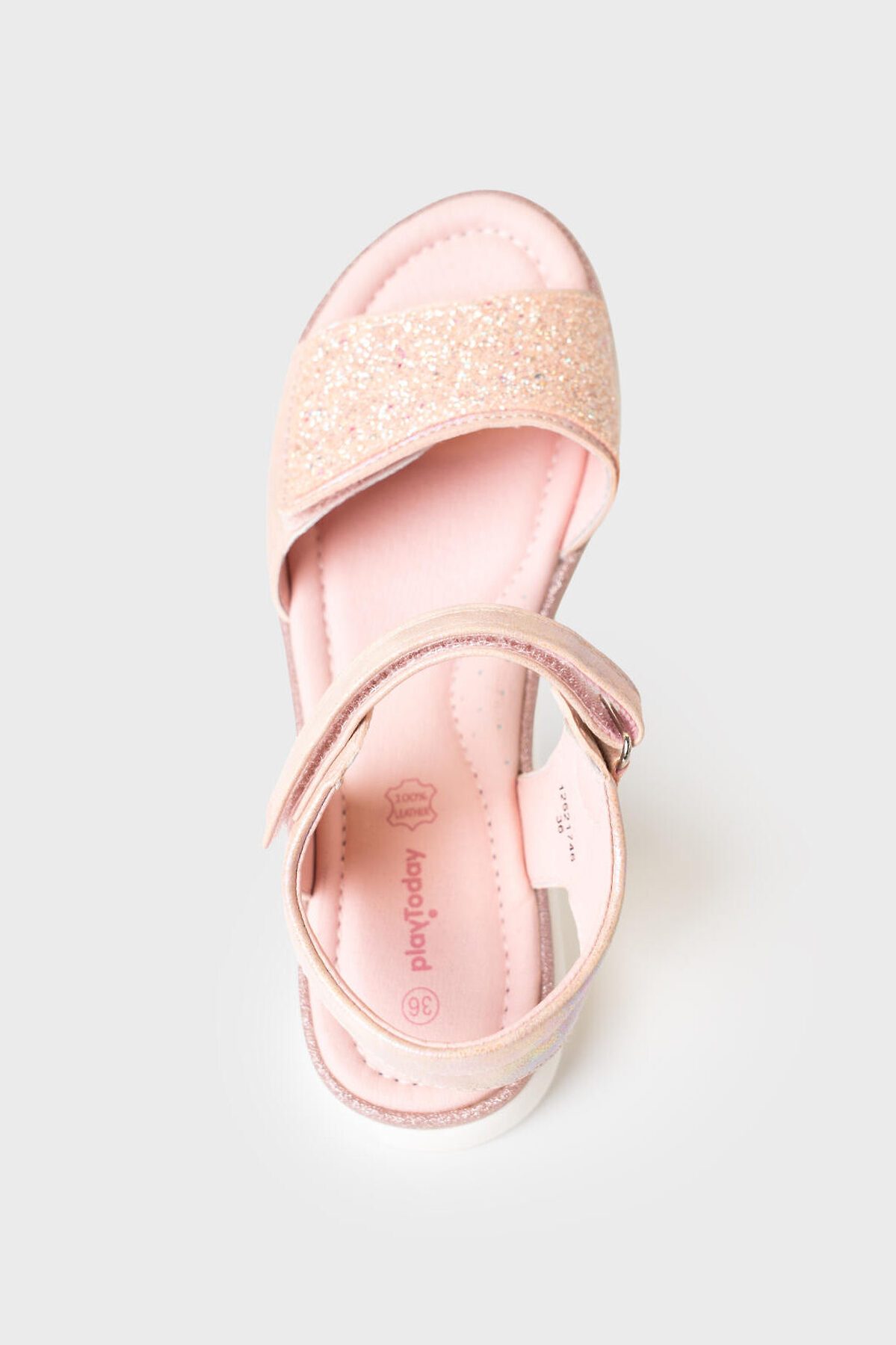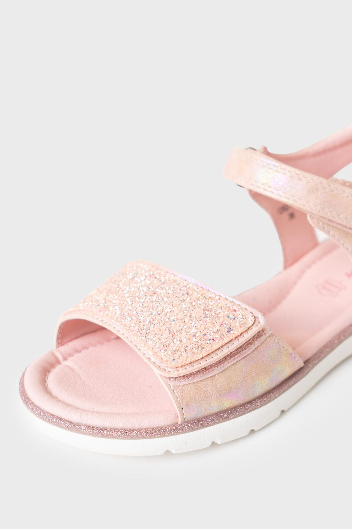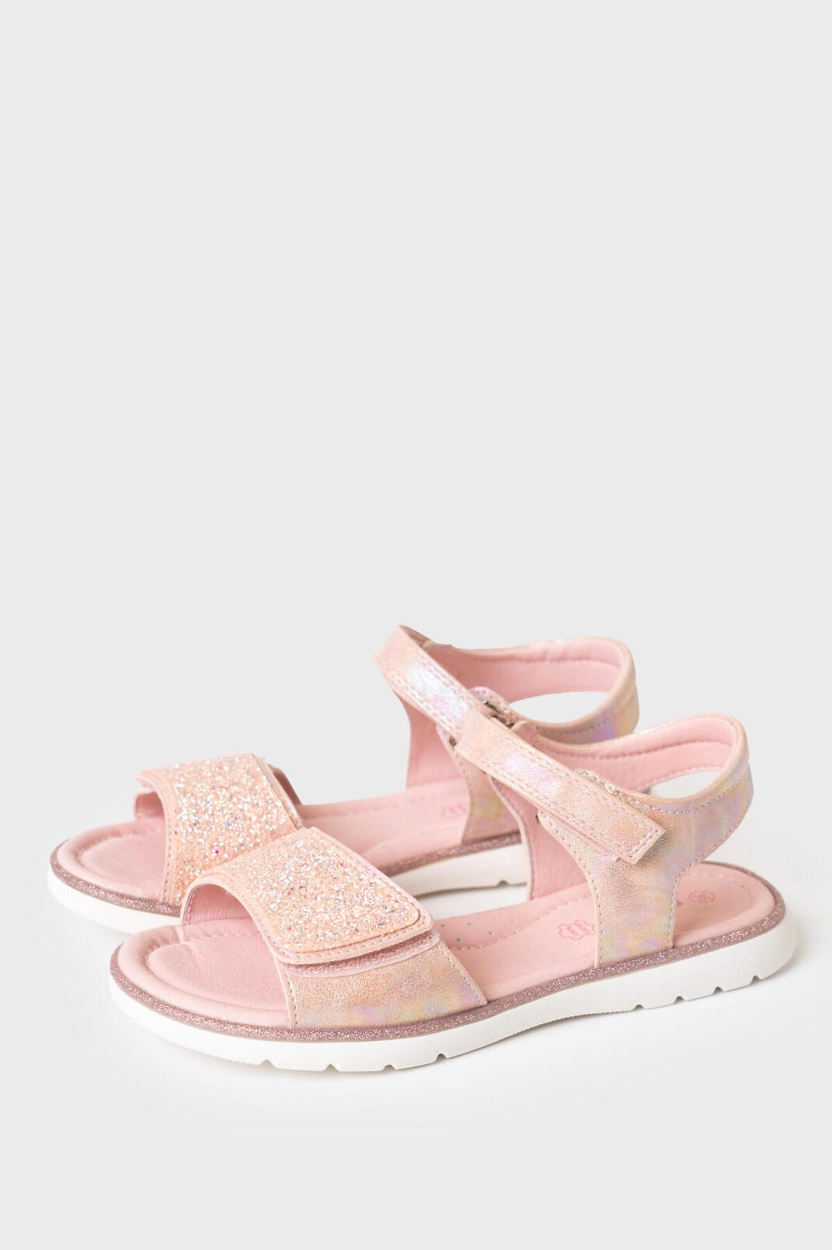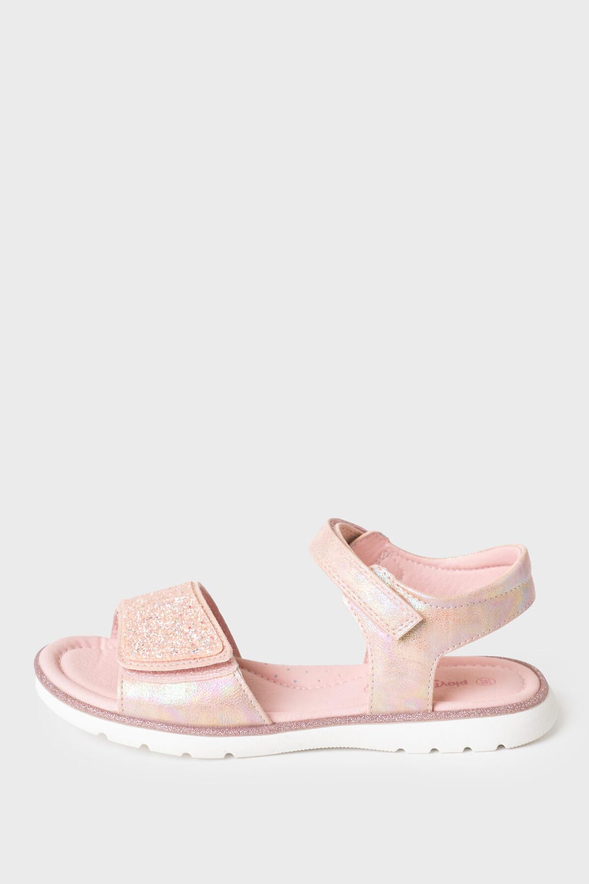 Нарядные розовые сандалии для девочки. Босоножки выполнены из перламутровой искусственной кожи и искусственной кожи с глиттером. Удобные ремни с липучками позволяют регулировать обувь на любой подъем. Подкладка и стелька выполнена из натуральной кожи. Стелька имеет анатомический элемент для поддержания свода стопы в правильном положении. Модель имеет гибкую и легкую подошва из ТПР с противоскользящим протектором.