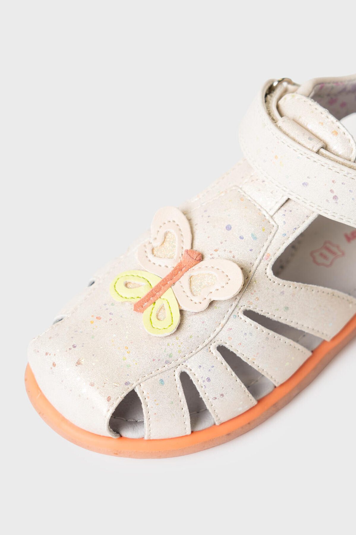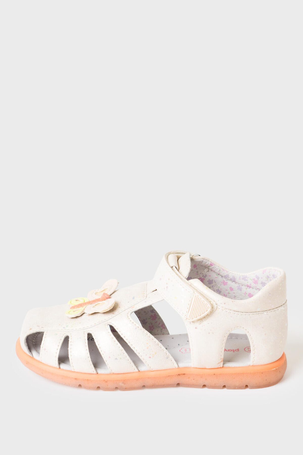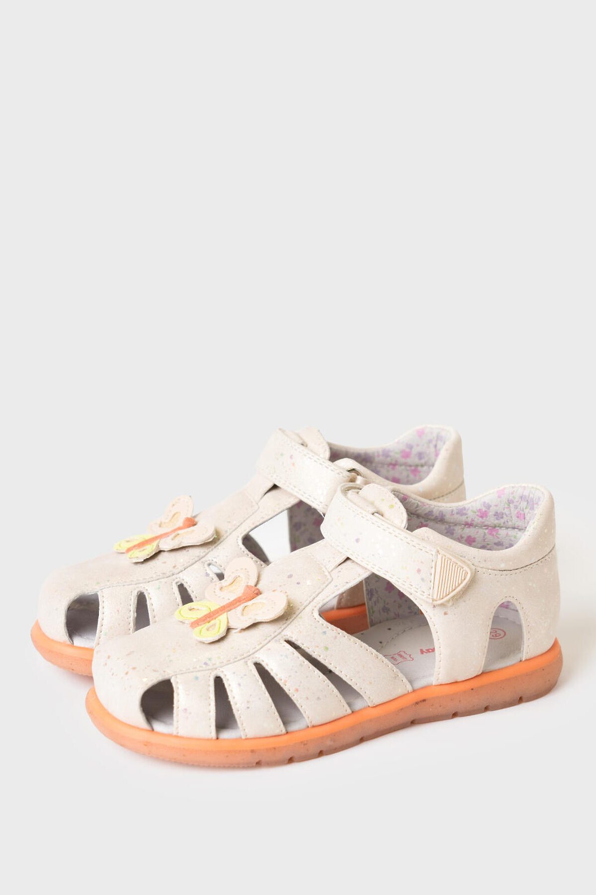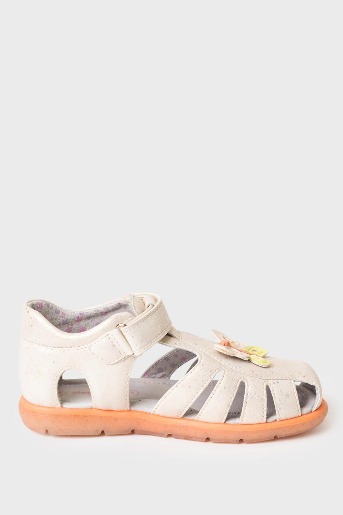Сандалии для девочки с закрытой носочной и пяточной частью выполнены из блестящей искусственной кожи. Спереди декорированы объемной бабочкой. Удобный ремень с липучкой позволяют регулировать обувь на любой подъем и позволяют ребенку обуваться самостоятельно. Подкладка выполнена из принтованной натуральной свиной кожи. Стелька выполнена из натуральной кожи и имеет анатомический элемент для поддержания свода стопы в правильном положении. Подошва из ТПР гибкая и нескользкая. Парфюмированная подошва имеет запах кокоса. Подошва в этой модели выполнена по новой экологической технологии - в составе подошве присутствую переработанные волокна кокоса.