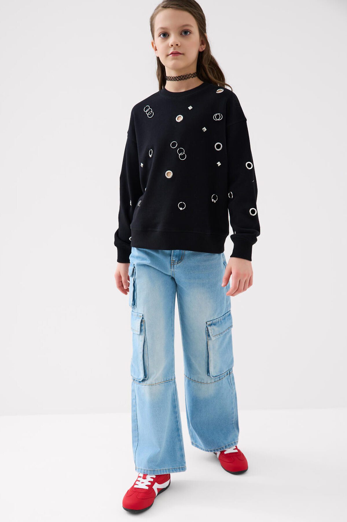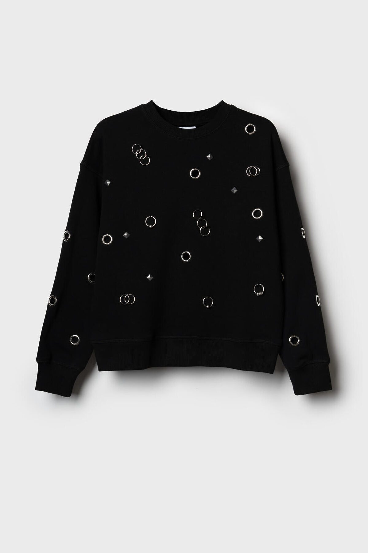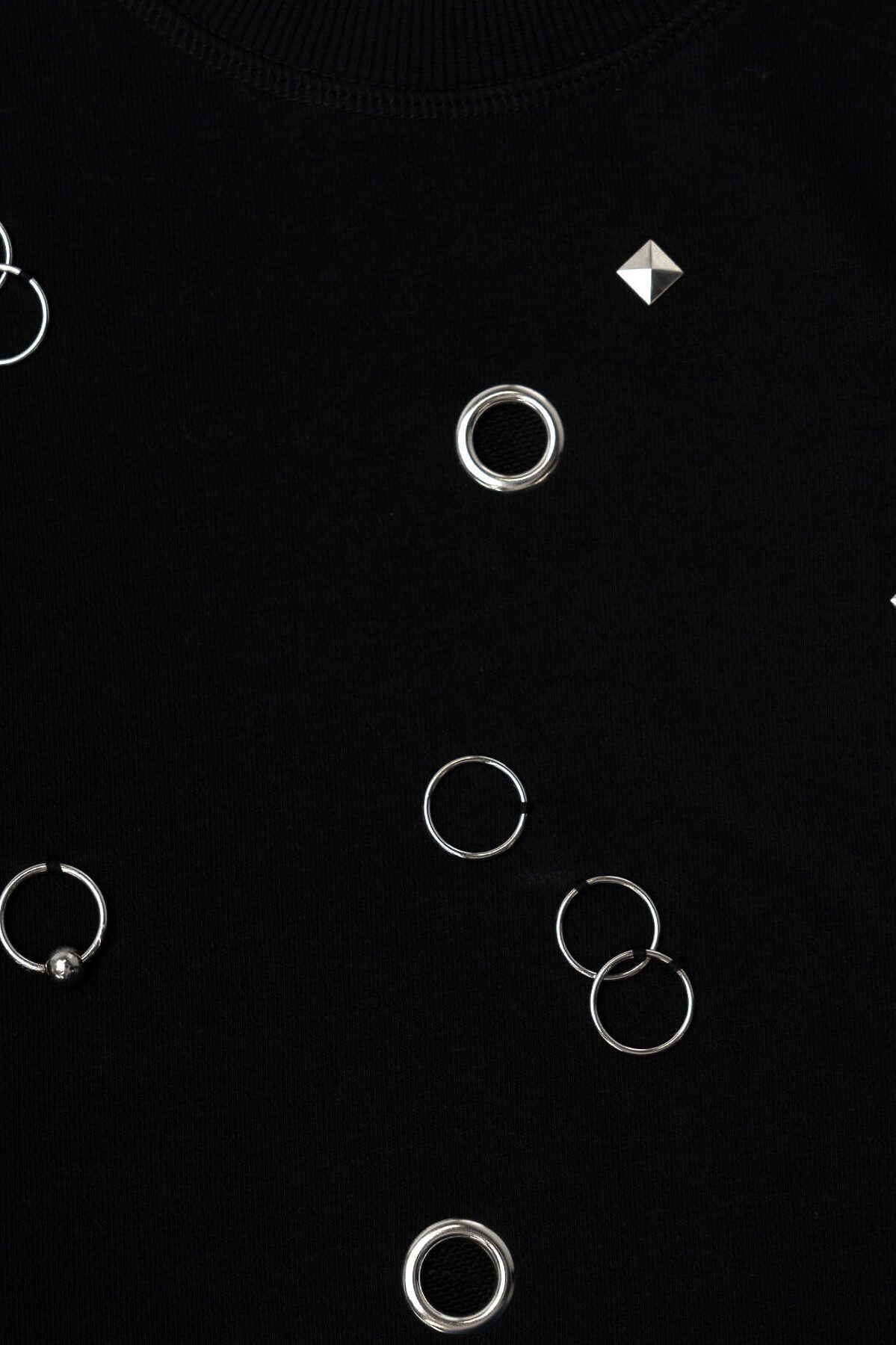 Свитшот оверсайз для девочки подростка. Выполнен из хлопкового футера без начеса. Вся передняя часть и рукава украшены металлическими кольцами и люверсами — они придают изделию необычный и модный вид. Декор размещён в виде множества металлических деталей — как одинарных, так и перекрывающихся колец, похожих на элементы пирсинга. Горловина, манжеты и низ изделия оформлены эластичными резинками.