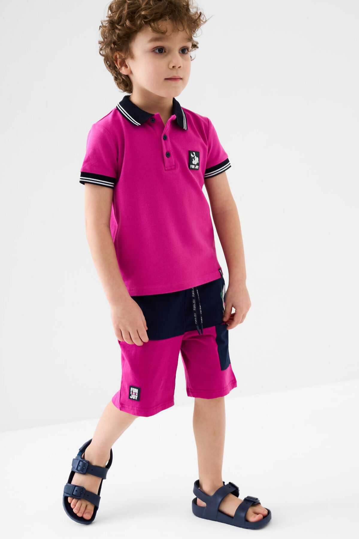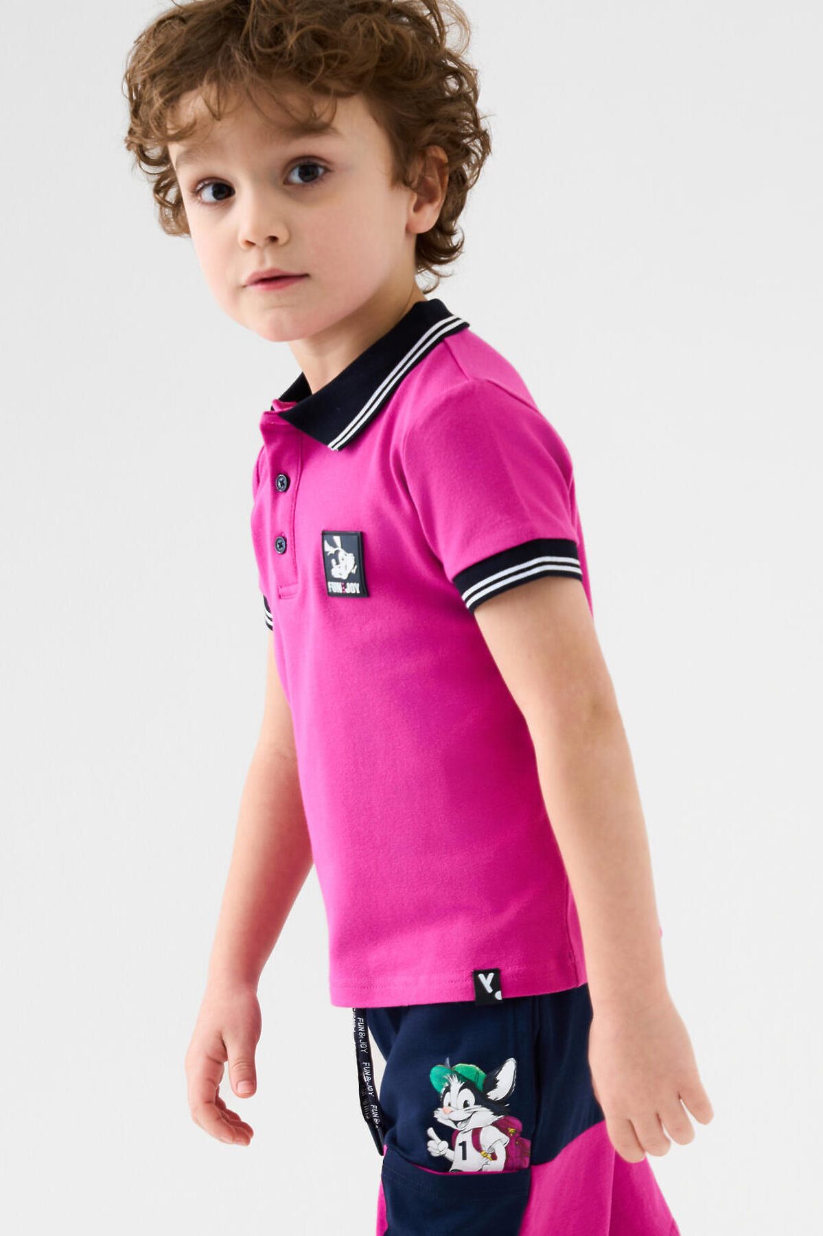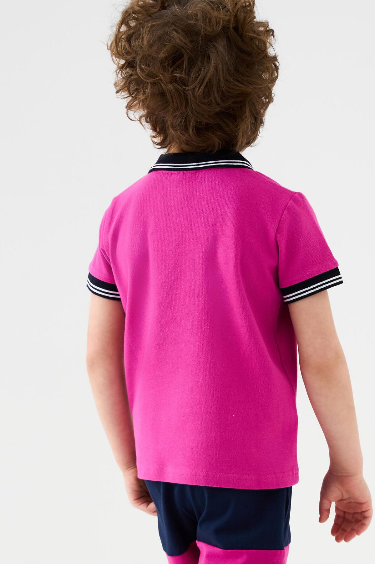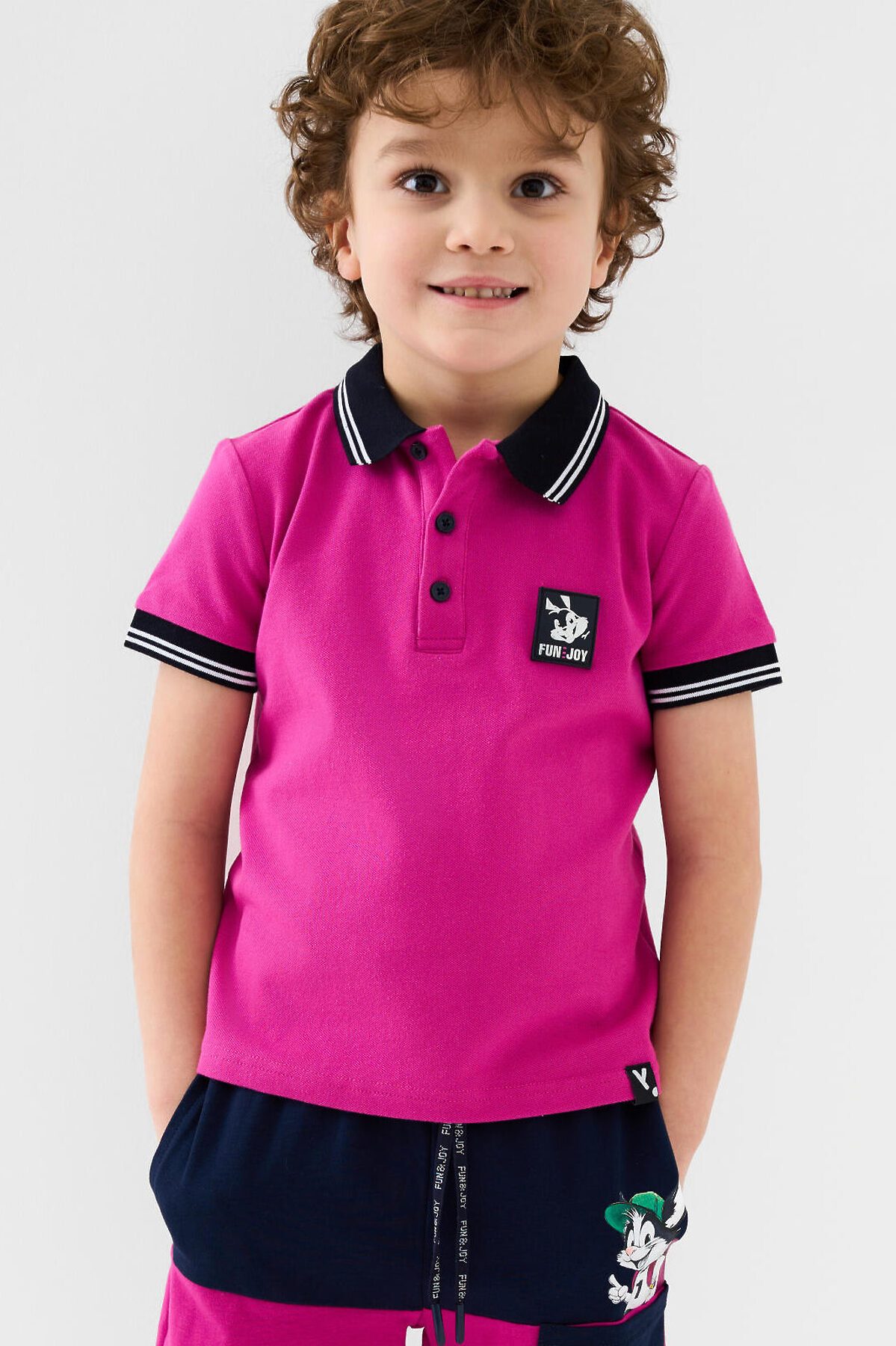 Детская футболка-поло для мальчика. Модель с коротким рукавом, выполненная из эластичного трикотажа пике. Изделие прямого кроя, средней длины. Отложной воротник, застёжка на груди с тремя пуговицами. На груди — декоративная резиновая нашивка. Манжеты и воротник выполнены из мягкого риба.