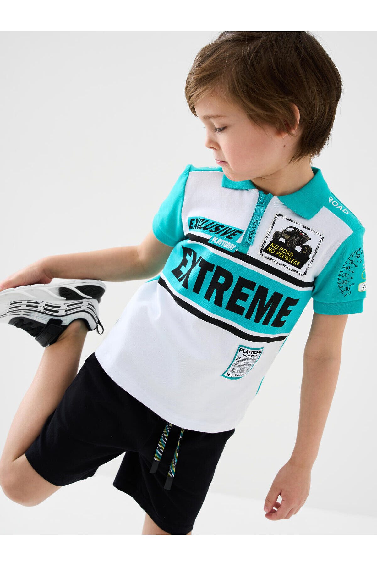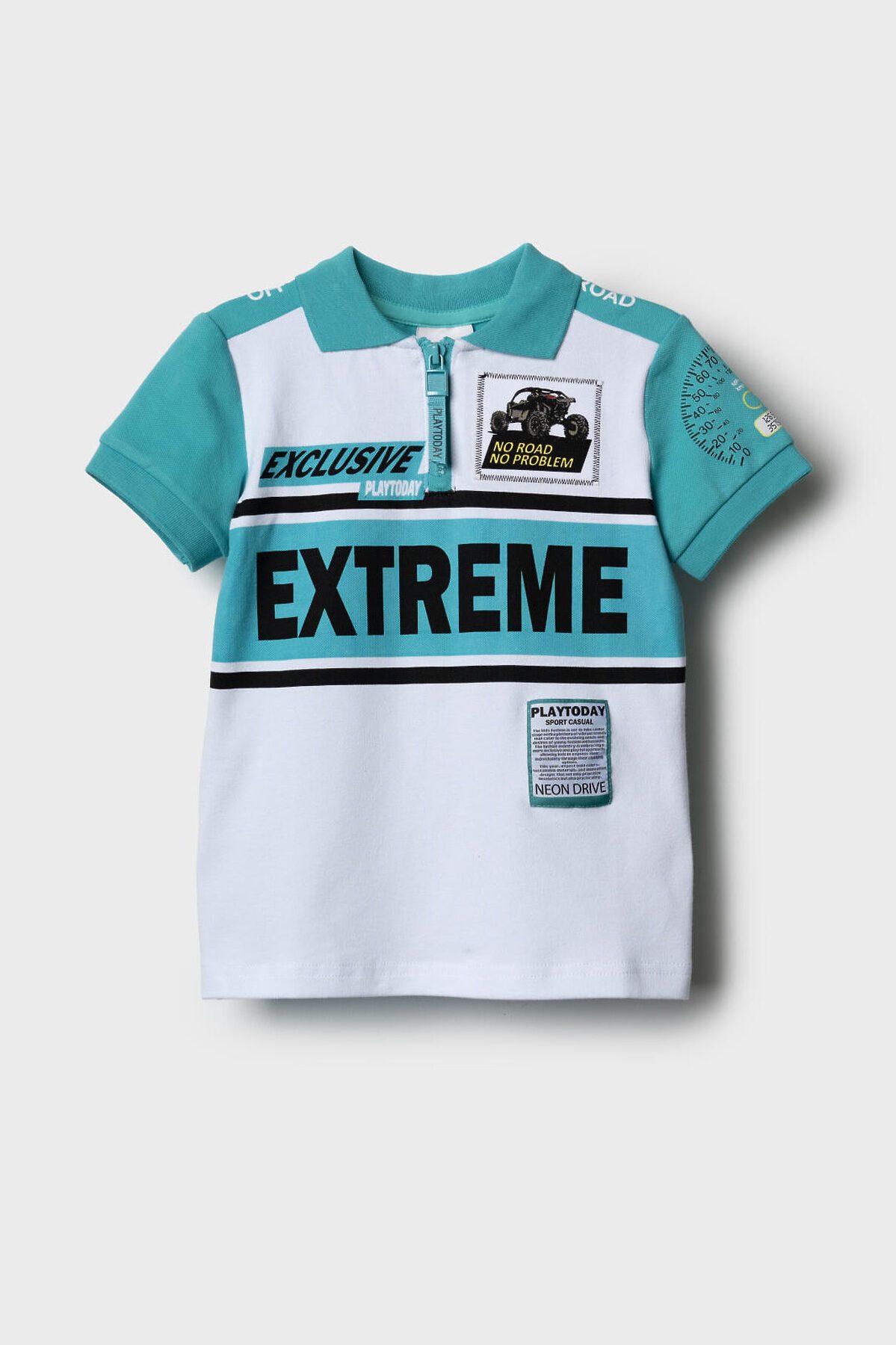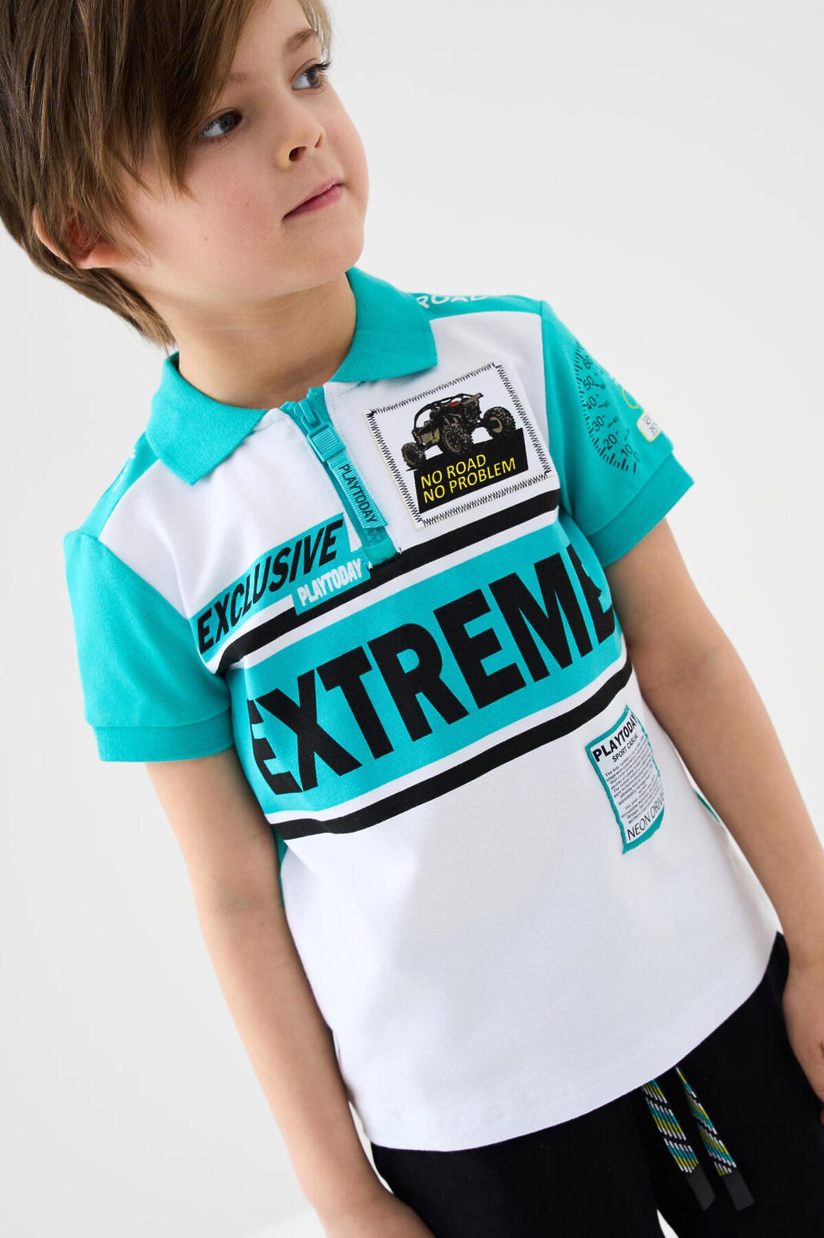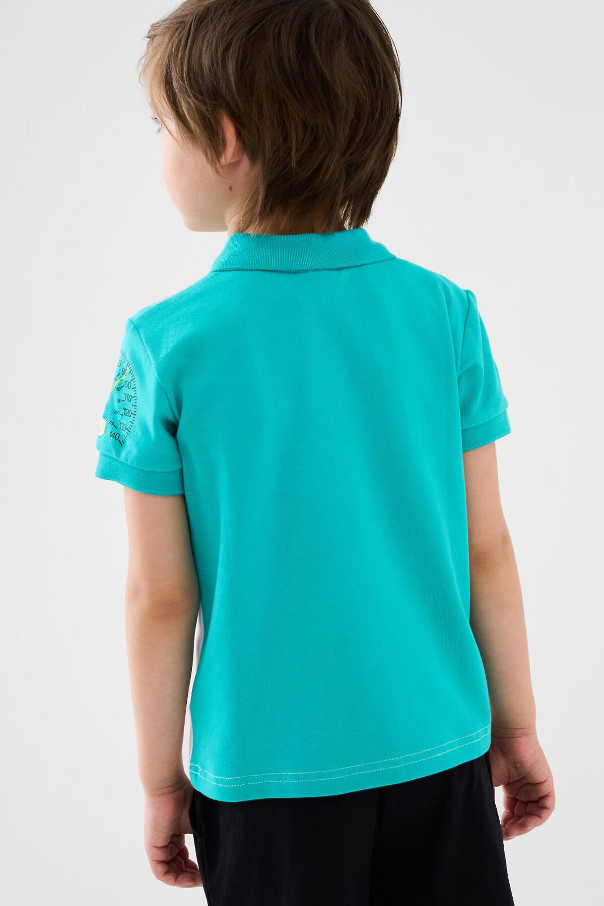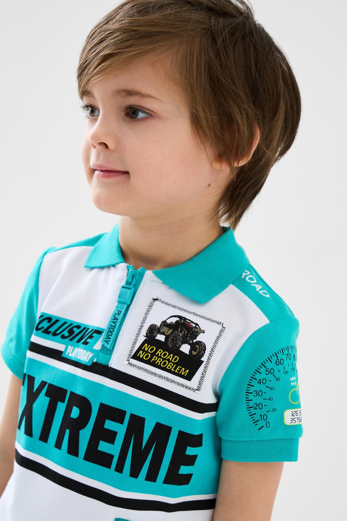 Детское поло с коротким рукавом для мальчика. Модель выполнена в спортивном стиле и украшена яркими принтами. Поло выполнено из хлопкового трикотажа пике. Воротник и манжеты выполнены из эластичного вязаного материала. На груди — короткая застежка-молния.