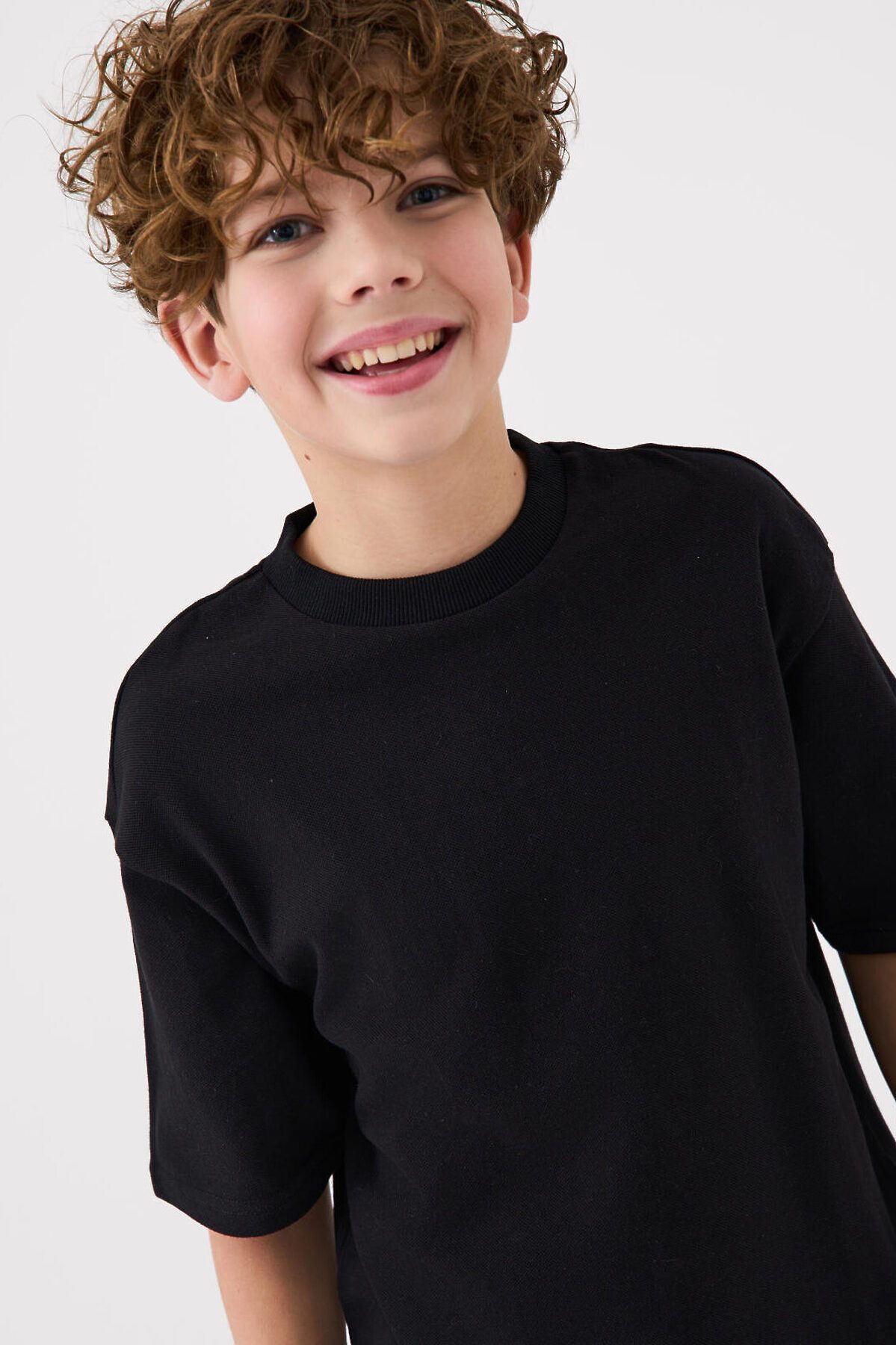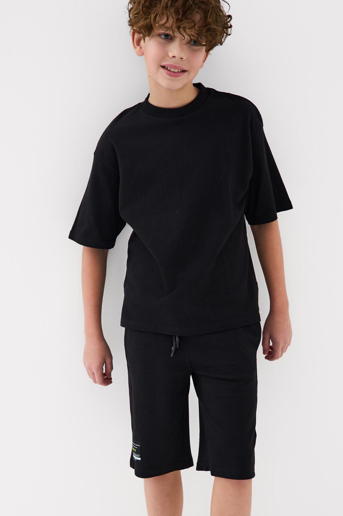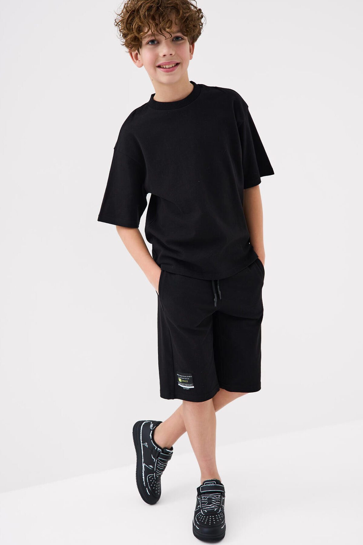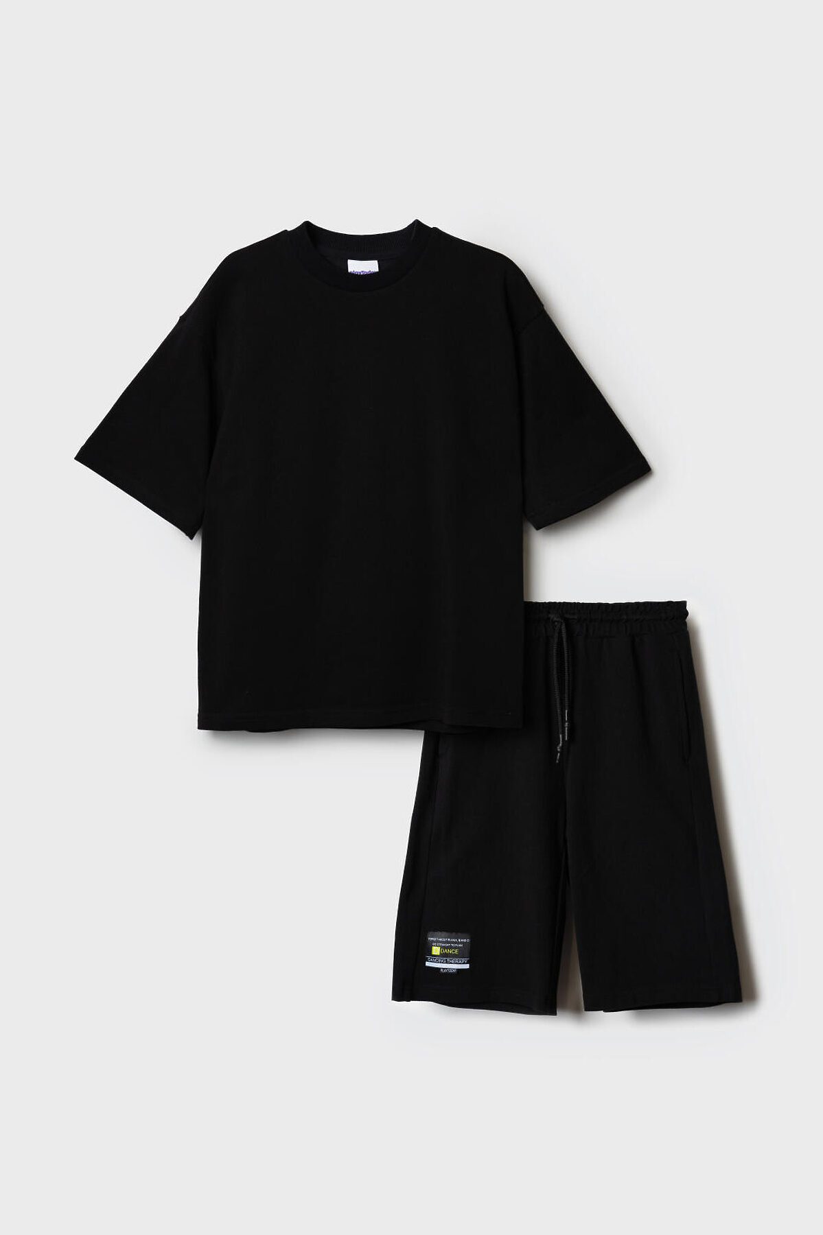 Костюм базовый для мальчика подростка. Состоит из футболки и шорт. Выполнен из хлопкового трикотажа пике. Футболка оверсайз, с коротким рукавом. Шорты свободные, с эластичным поясом и шнурком для регулировки посадки. По бокам расположены карманы. Декоративная нашивка.